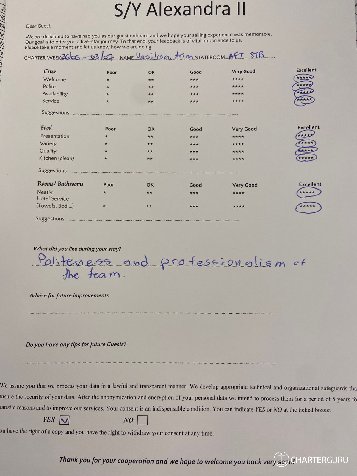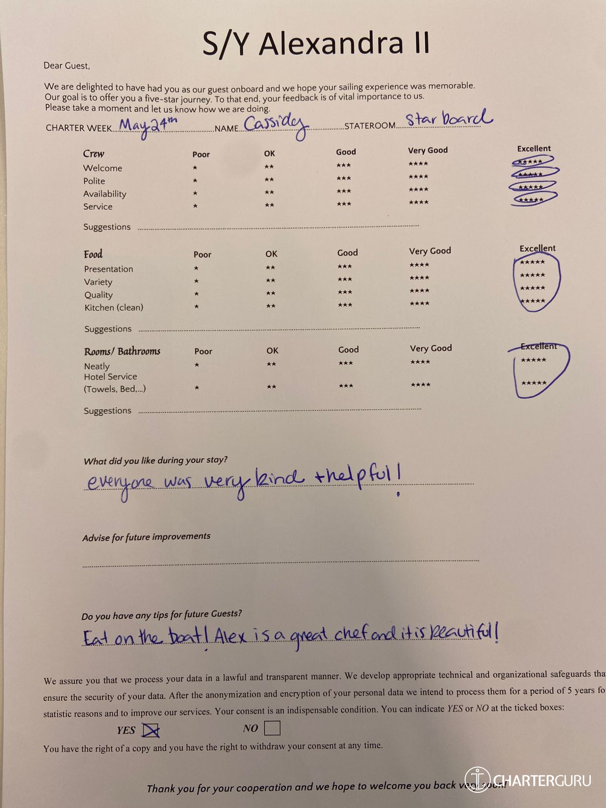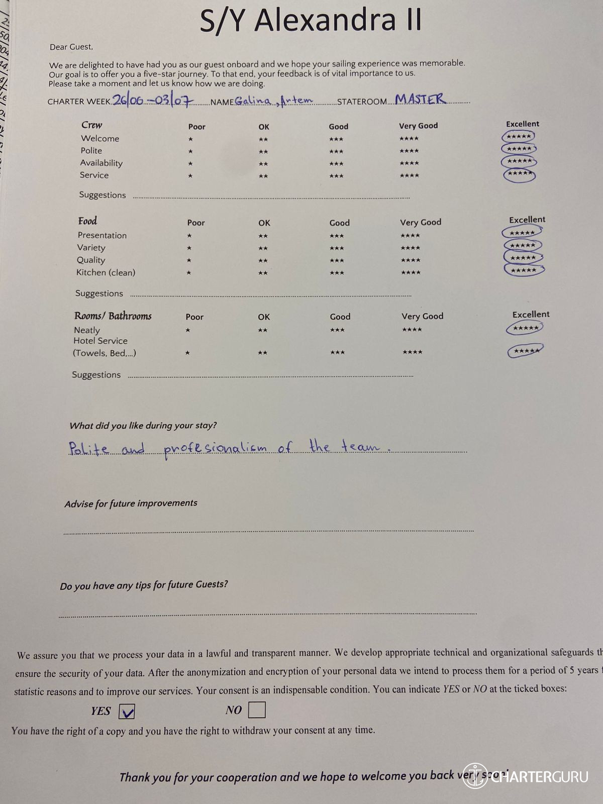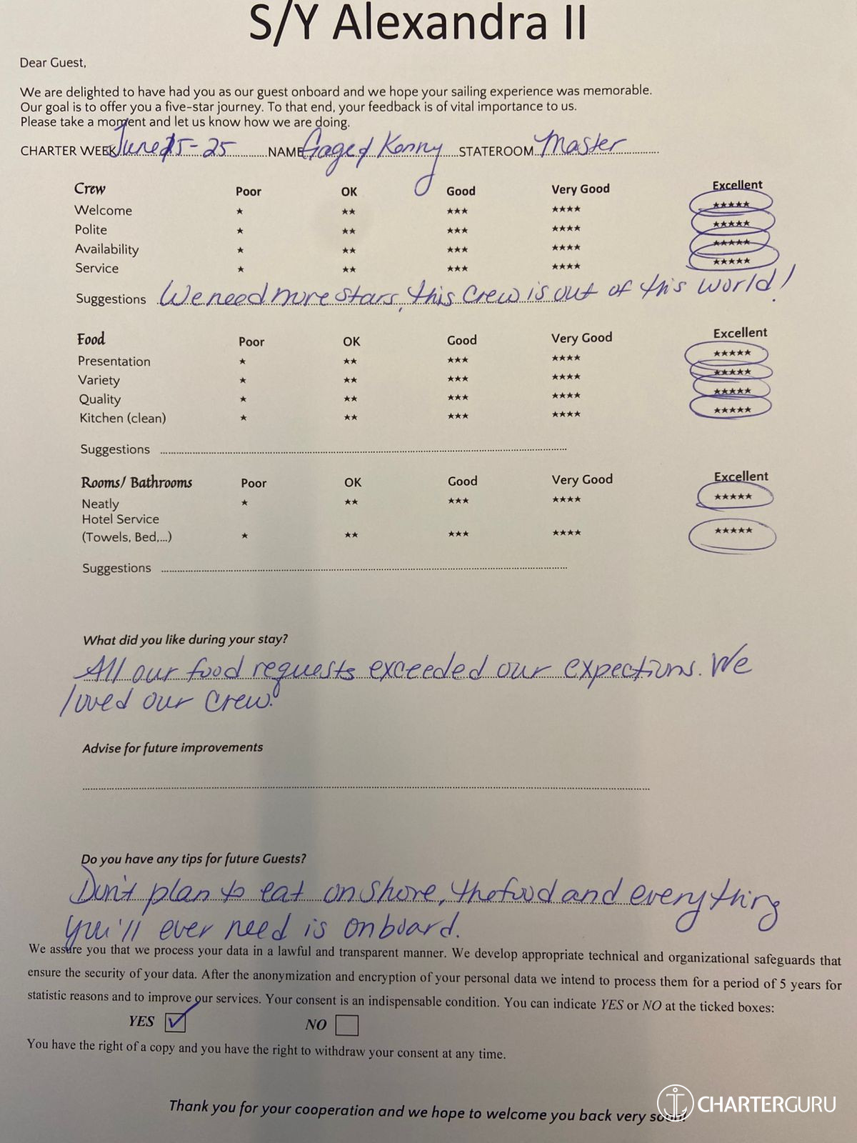 All additional/variable expenses such as Gas and Food are deducted from an Advance Provisioning Allowance (APA) - an additional deposit that is added on top of the charter price.
