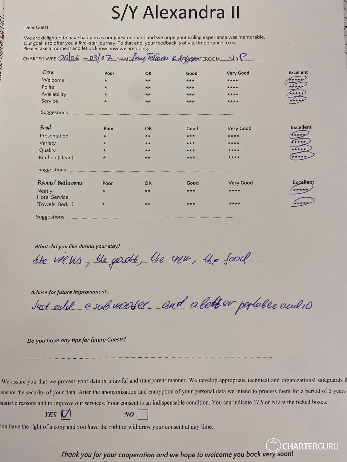 The expenses, such as provisioning, fuel, marina fees, are deducted from the APA. The APA is based on the price of the yacht and ranges from 15% (crewed sailing yachts) to 30% (motor yachts with higher fuel consumption).