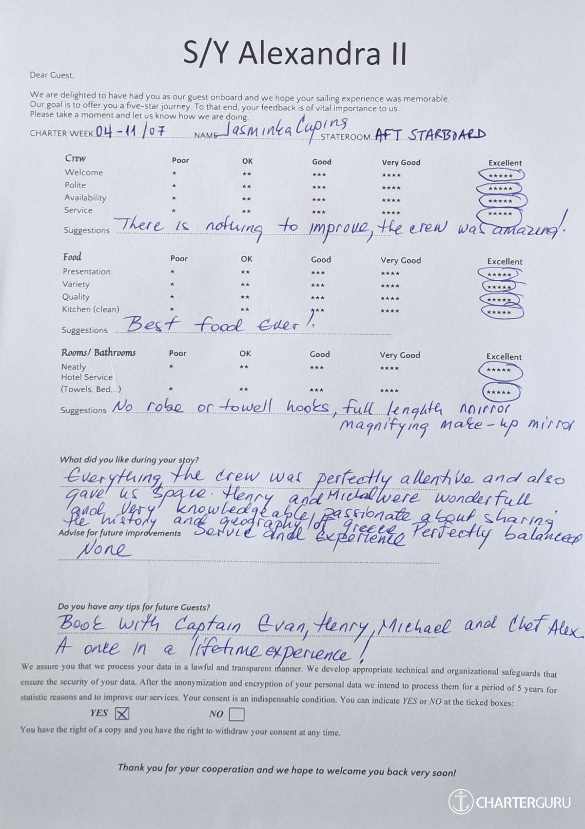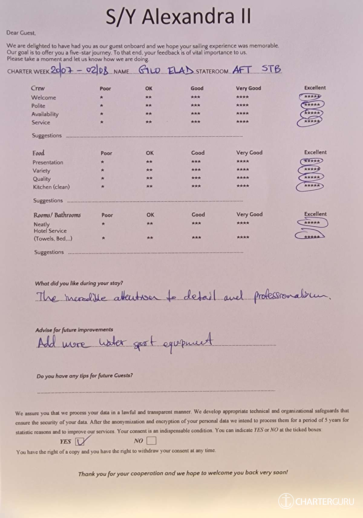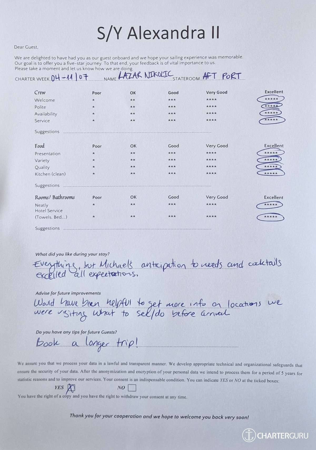 Fluent in both English (his native language) and Greek, Michael communicates effortlessly with guests, enhancing their overall experience and contributing to the welcoming atmosphere aboard Alexandra II. With a genuine commitment to hospitality, Michael is a valuable member of the crew dedicated to making every guest's journey enjoyable and memorable.