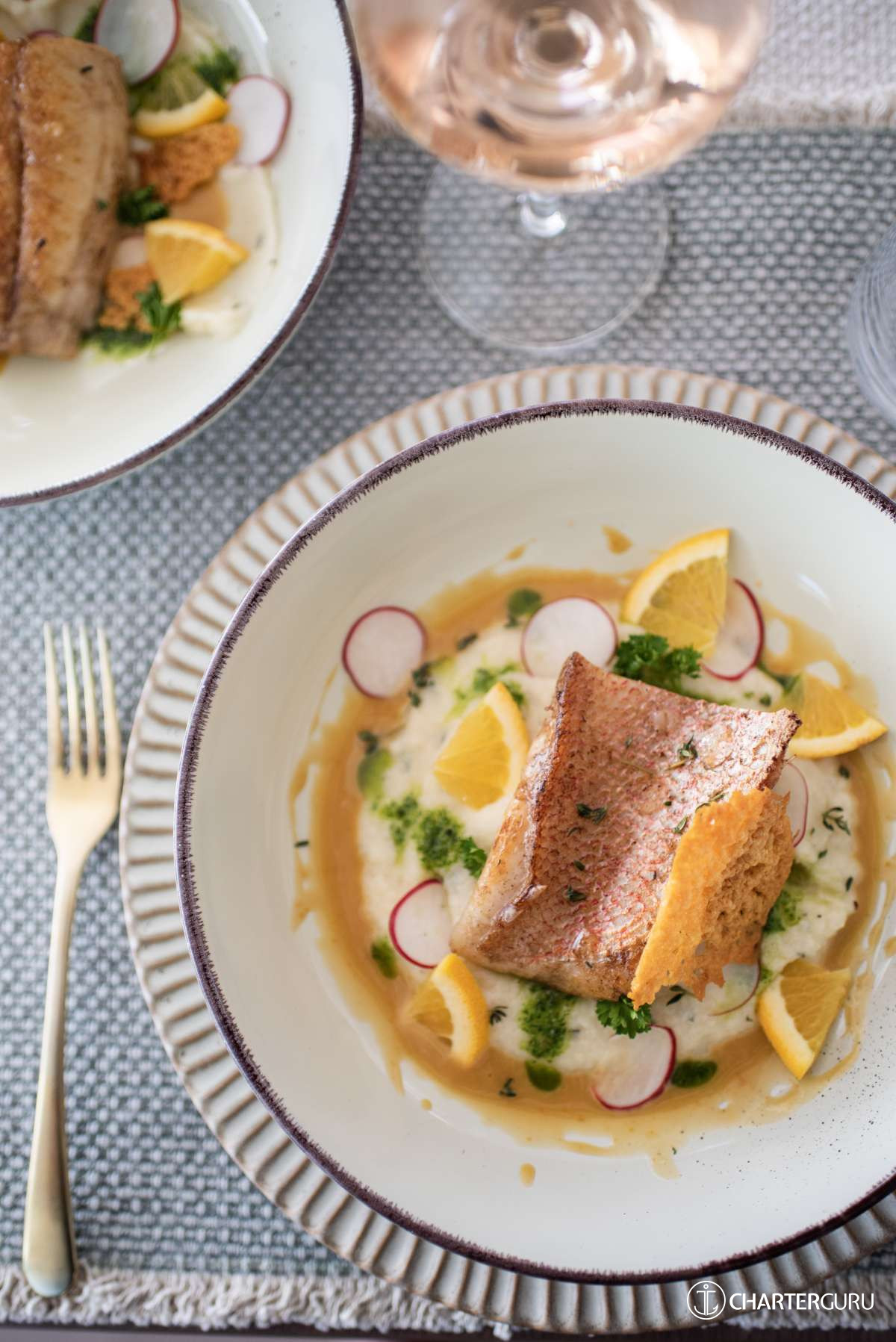 Cauliflower puree | Garlic herb oil | Parmesan crisp | Citrus beurre blanc