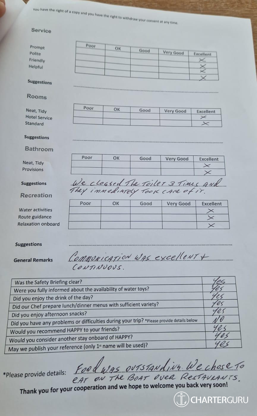It's hard to even begin.Have felt so at peace over our week cruise! To George,Dimitris,Dimitris thank you for your kindness , joy and patience (especially the watersports).Thank you , all my best wishes!