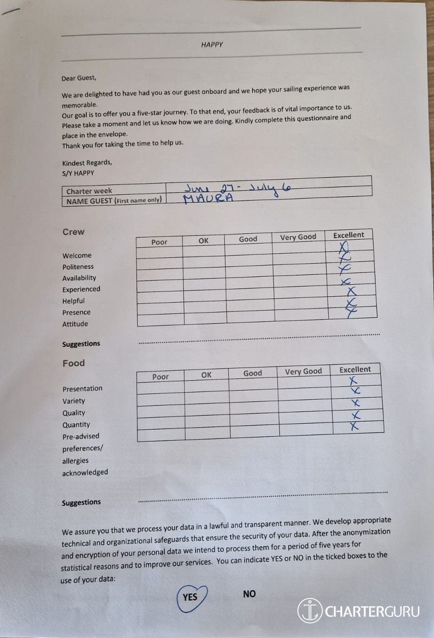For a sailing catamaran like HAPPY, the expected APA is 20% to 35% of the charter price (€4,400 - €7,700), making the charter cost €26,400 to €29,700. Exact amount will be confirmed after inquiry.