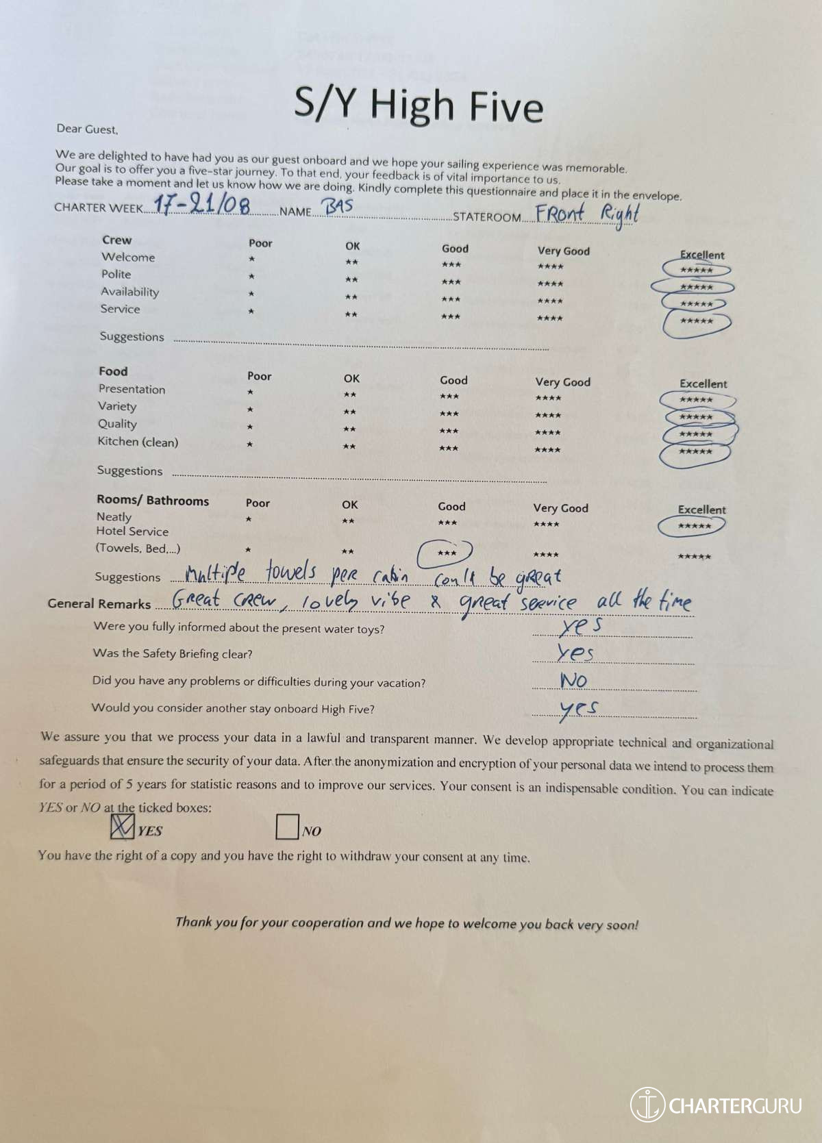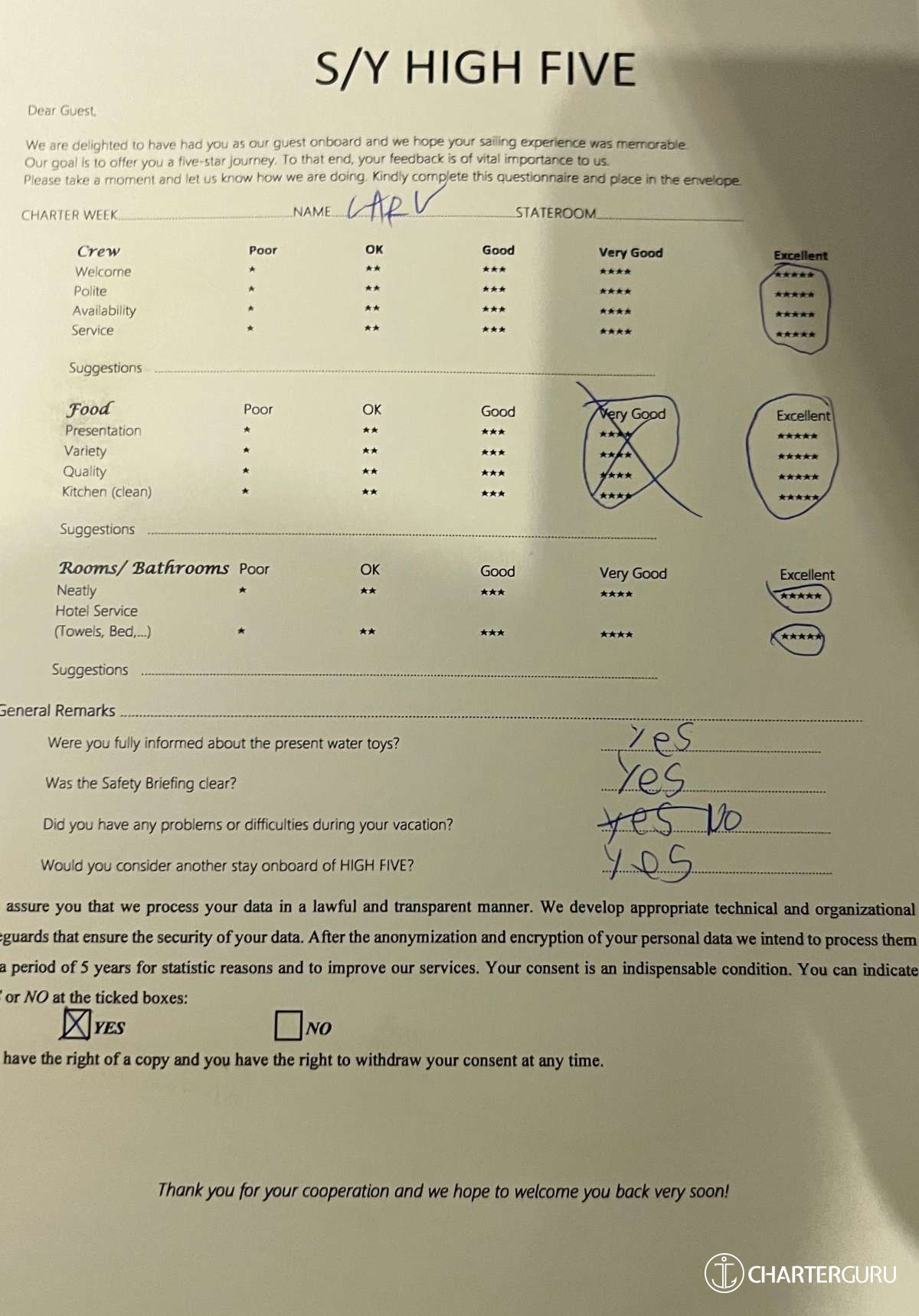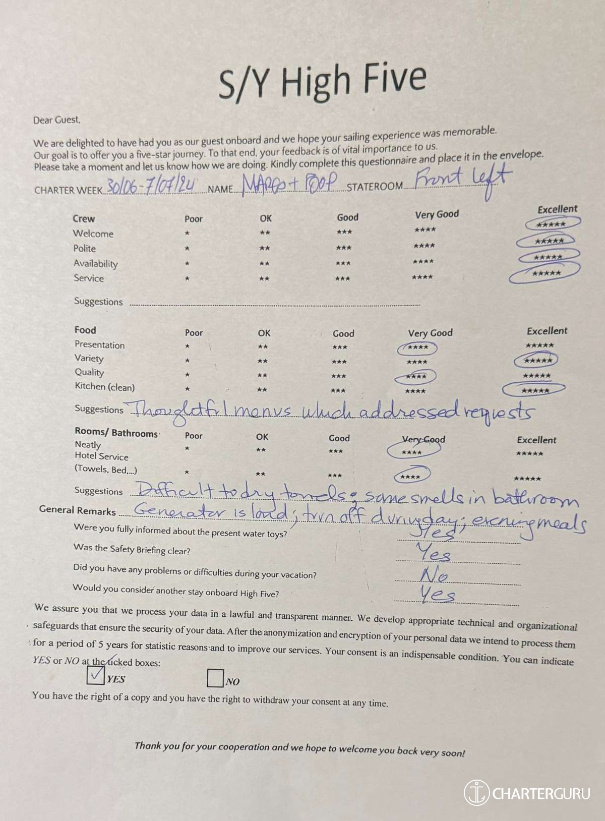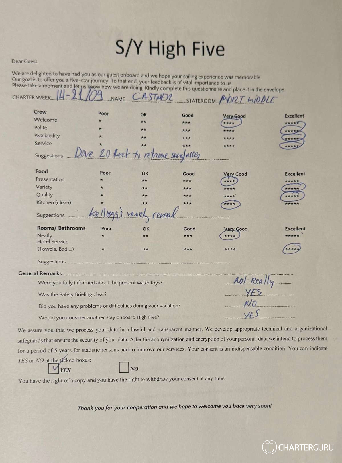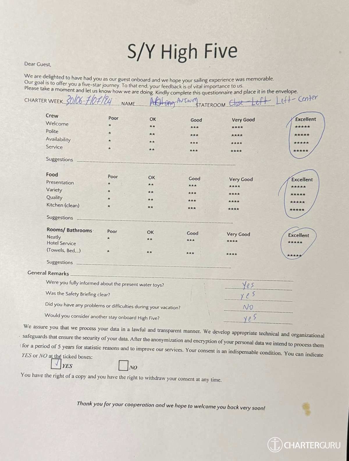 For a sailing catamaran like HIGH FIVE, the expected APA is 20% to 35% of the charter price (€4,000 - €7,000), making the charter cost €24,000 to €27,000. Exact amount will be confirmed after inquiry.