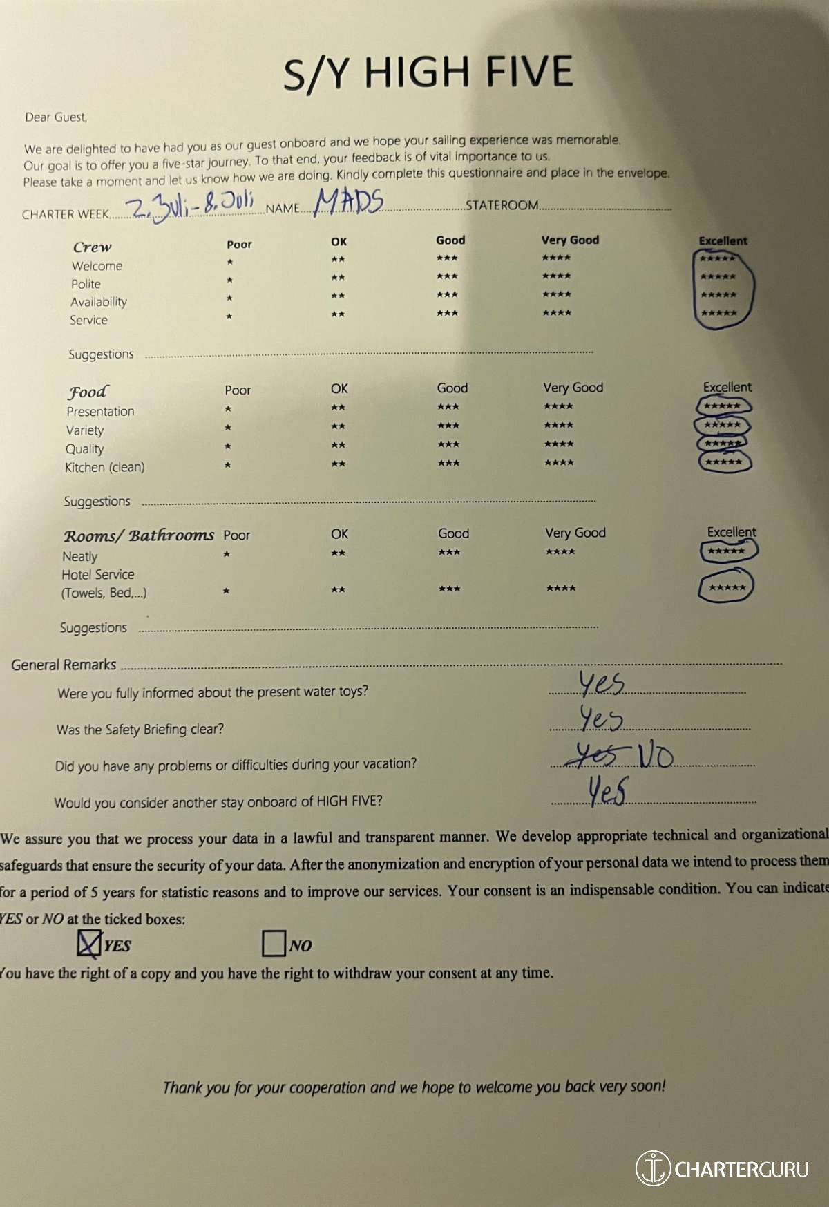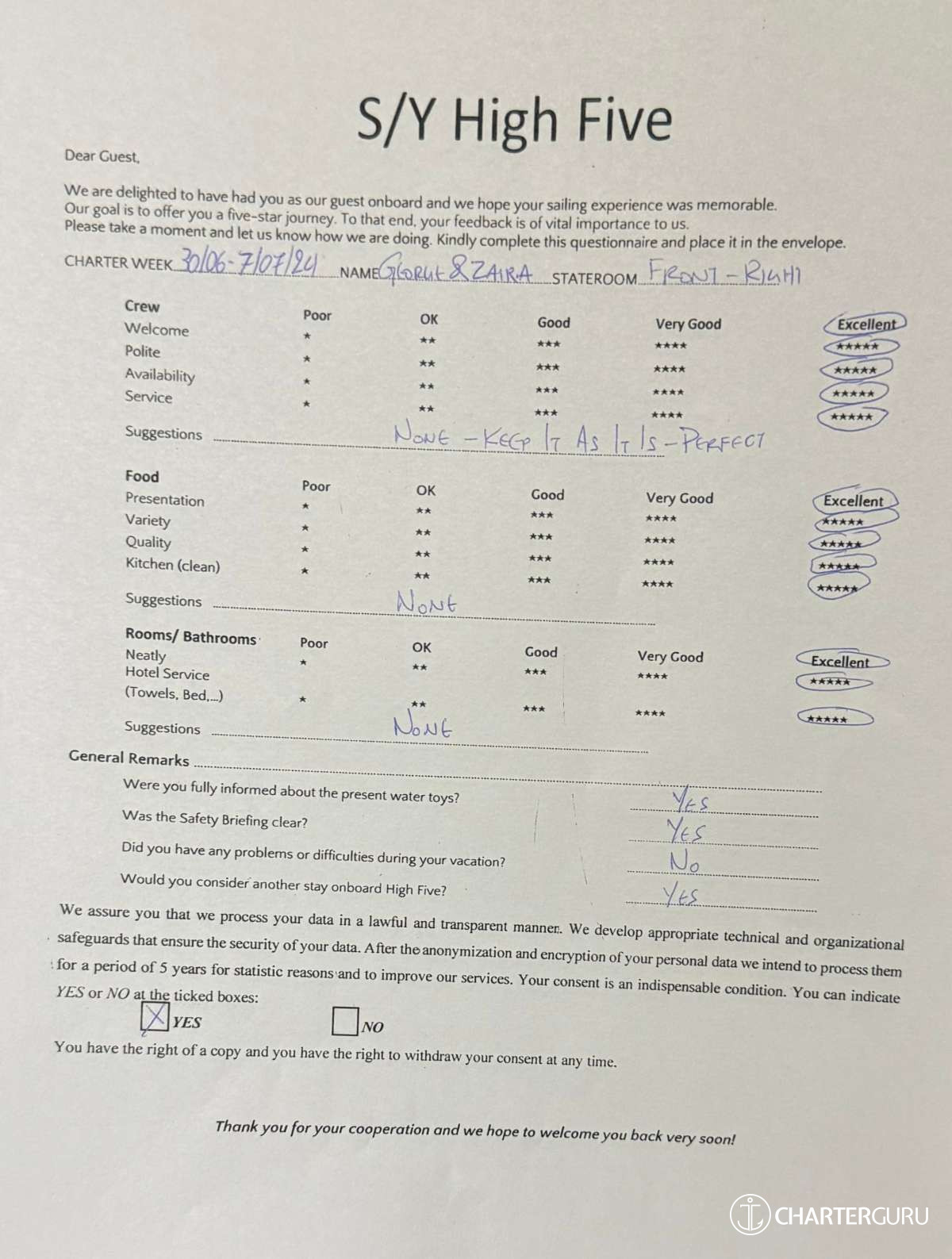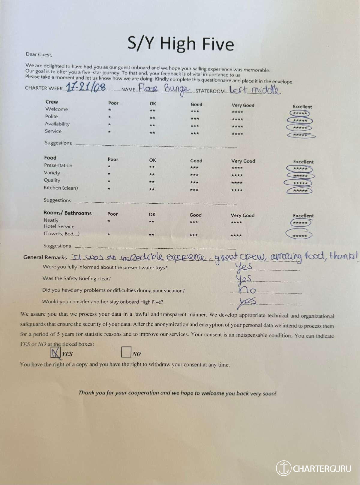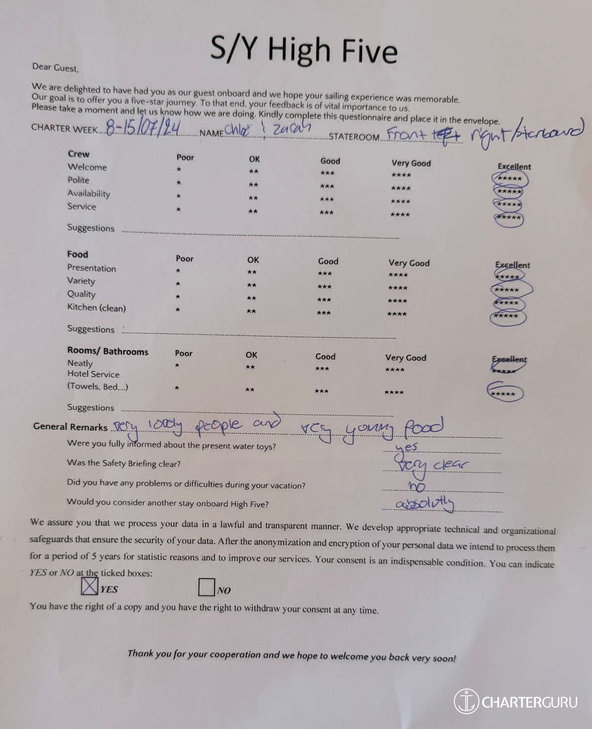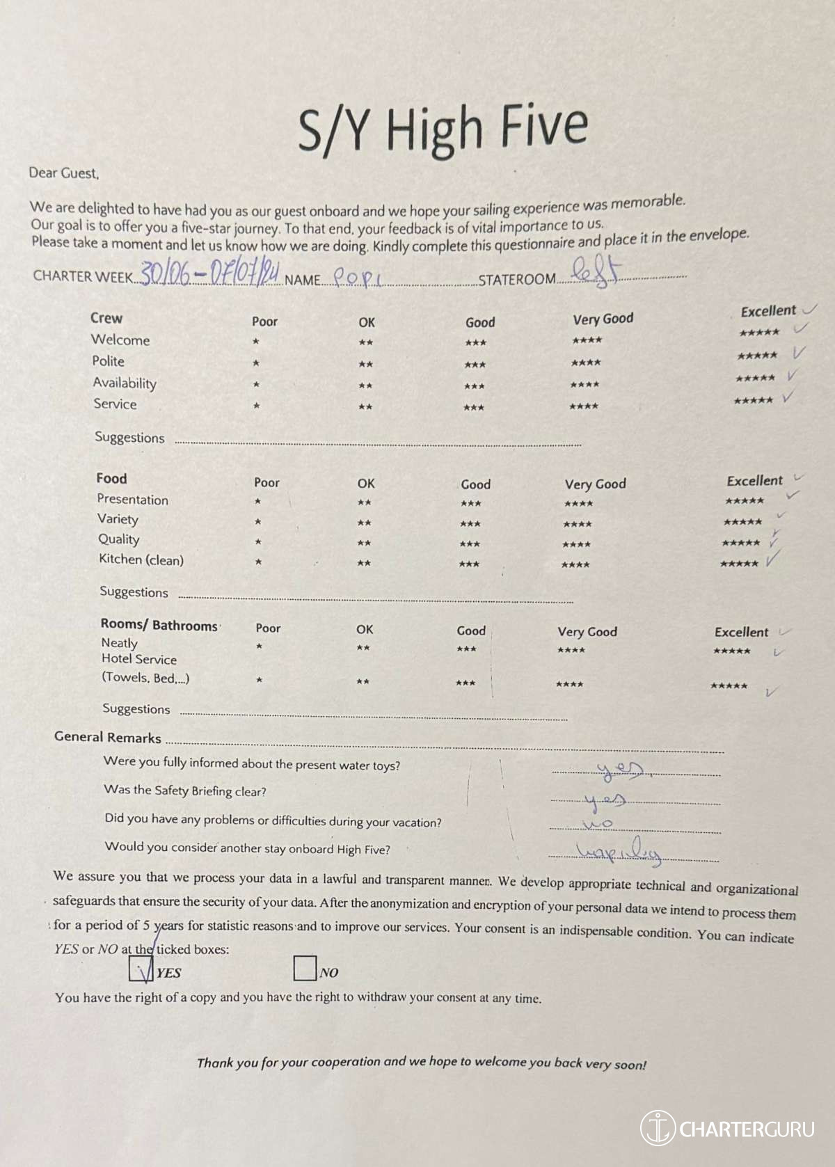 For a sailing catamaran like HIGH FIVE, the expected APA is 20% to 35% of the charter price (€4,000 - €7,000), making the charter cost €24,000 to €27,000. Exact amount will be confirmed after inquiry.