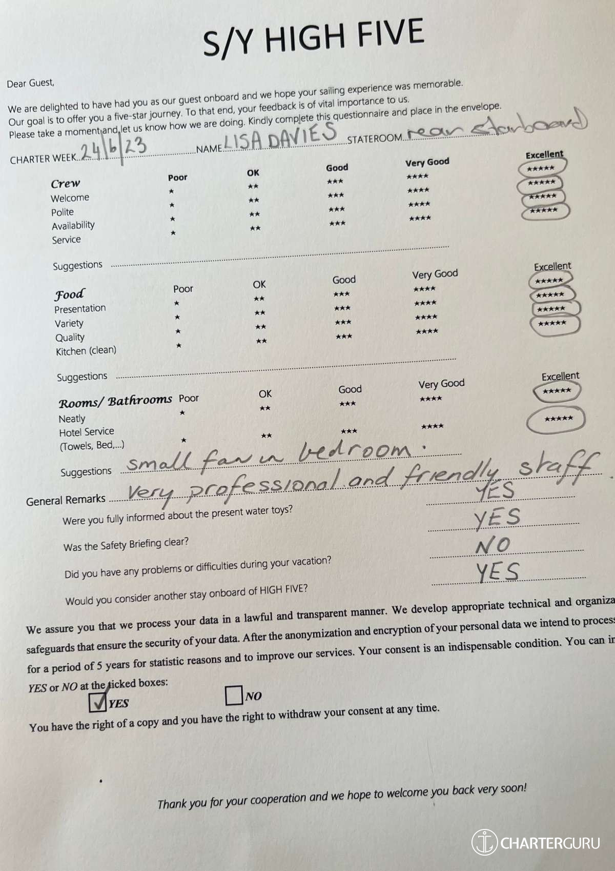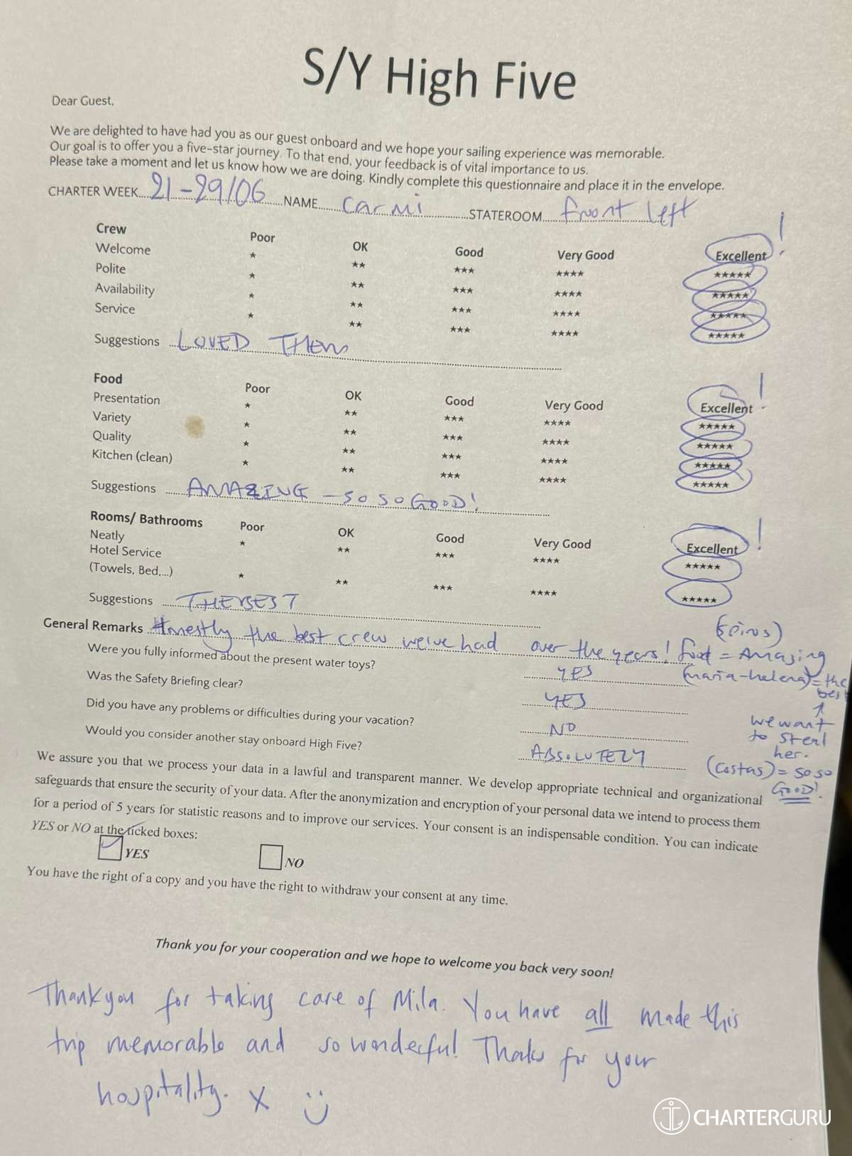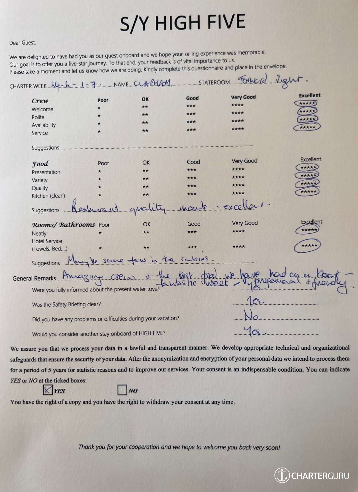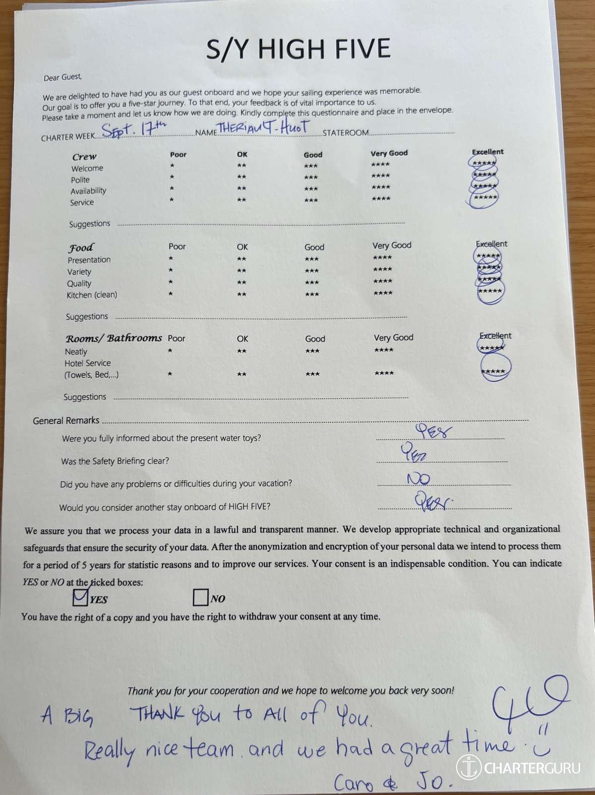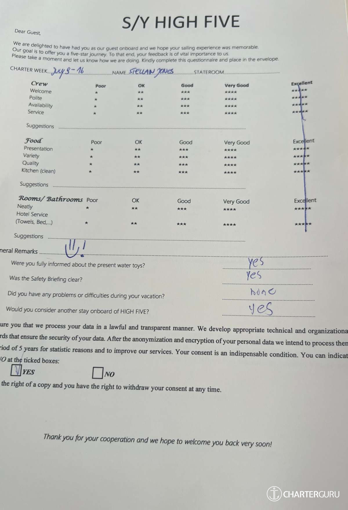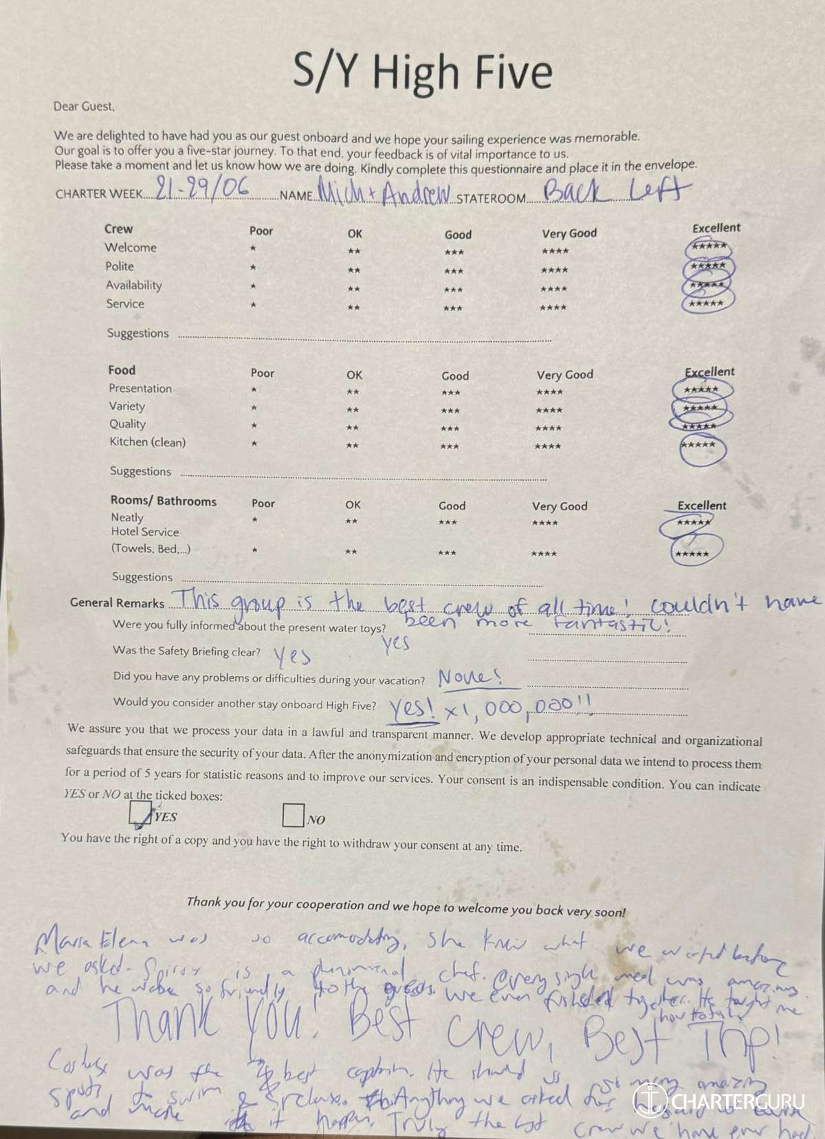 For a sailing catamaran like HIGH FIVE, the expected APA is 20% to 35% of the charter price (€4,000 - €7,000), making the charter cost €24,000 to €27,000. Exact amount will be confirmed after inquiry.