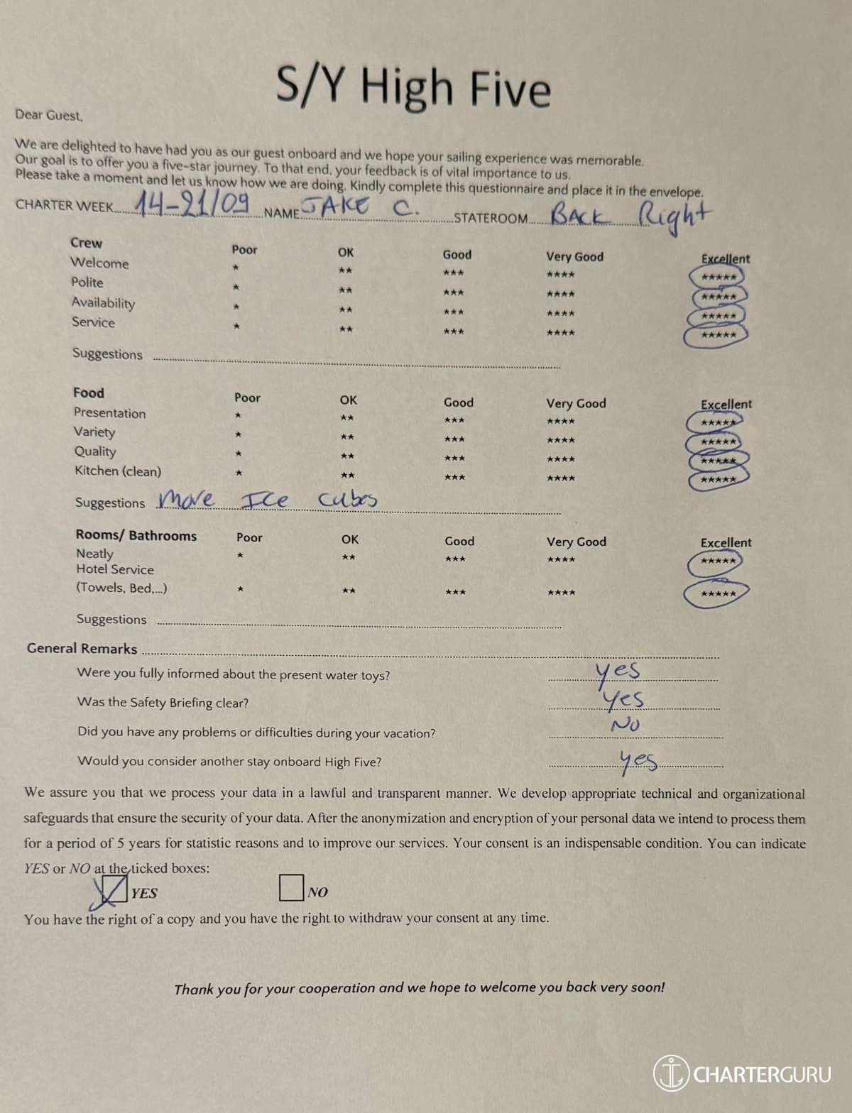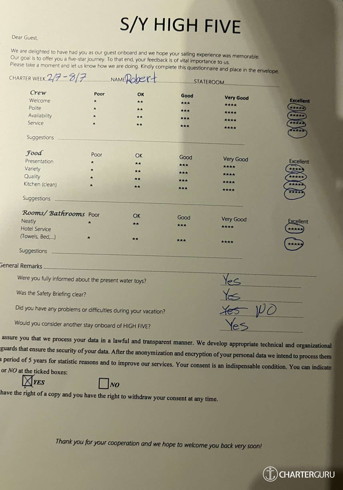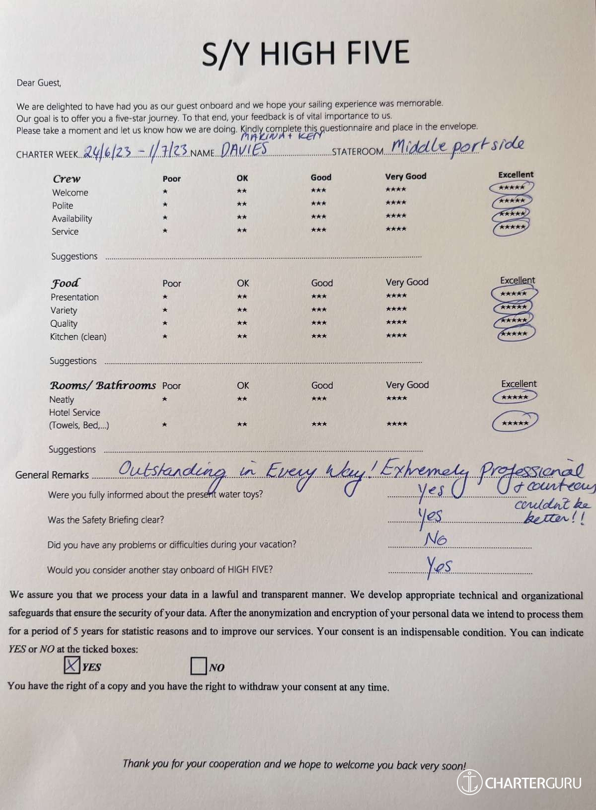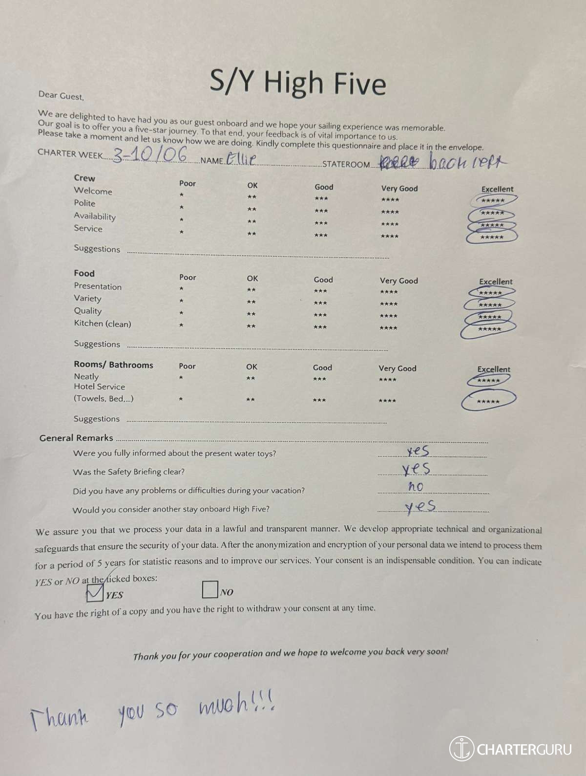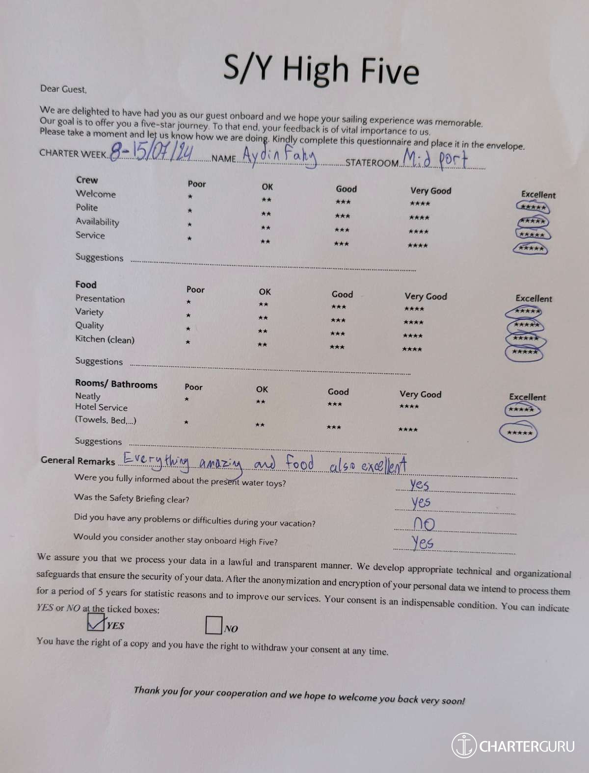 For a sailing catamaran like HIGH FIVE, the expected APA is 20% to 35% of the charter price (€4,000 - €7,000), making the charter cost €24,000 to €27,000. Exact amount will be confirmed after inquiry.