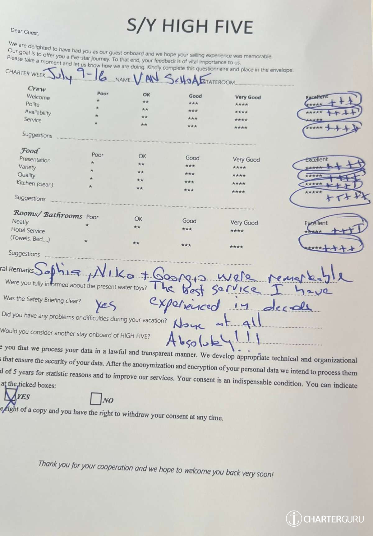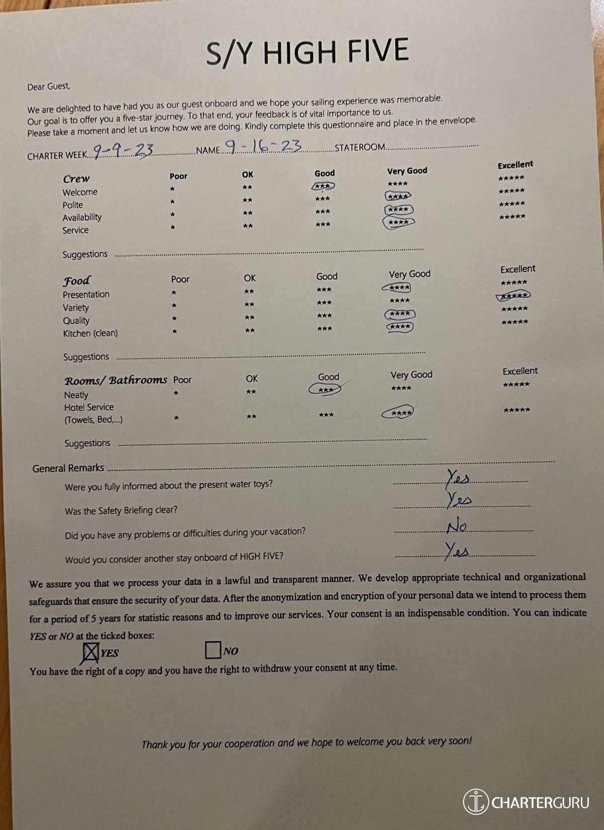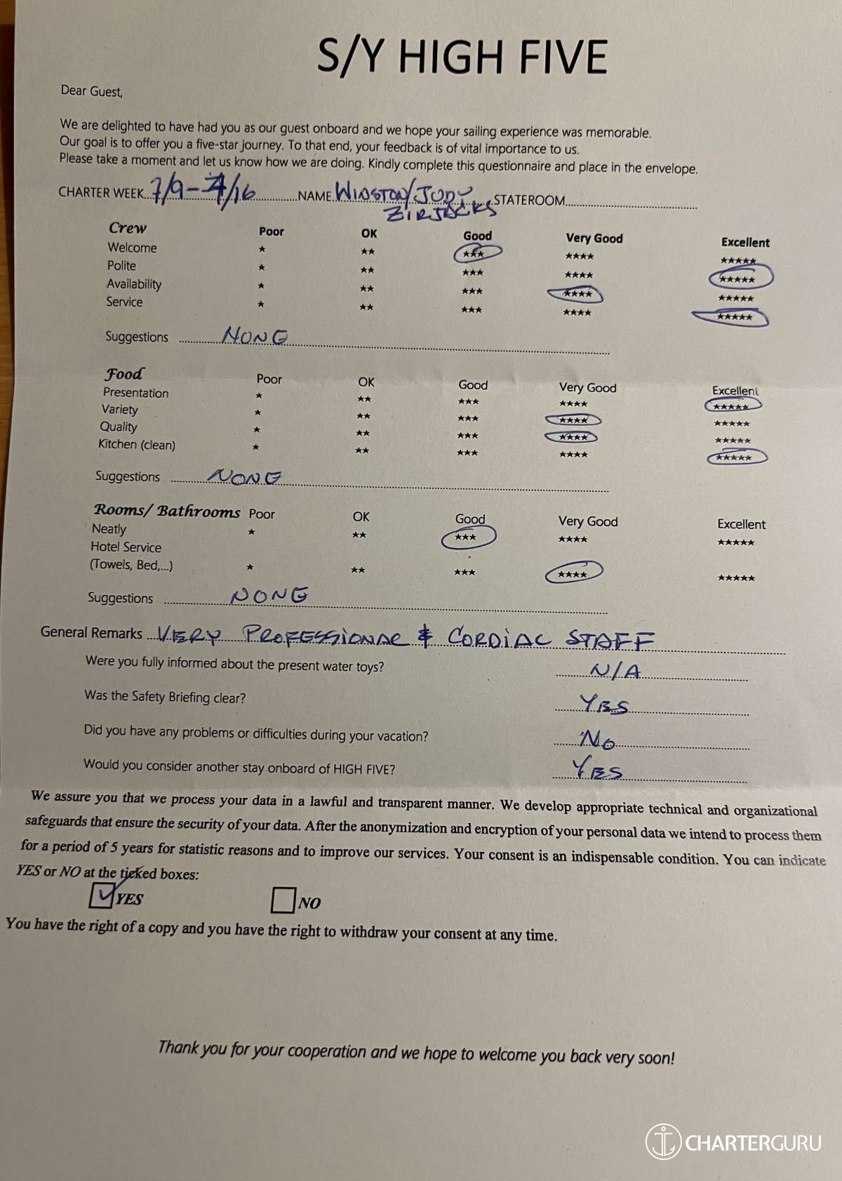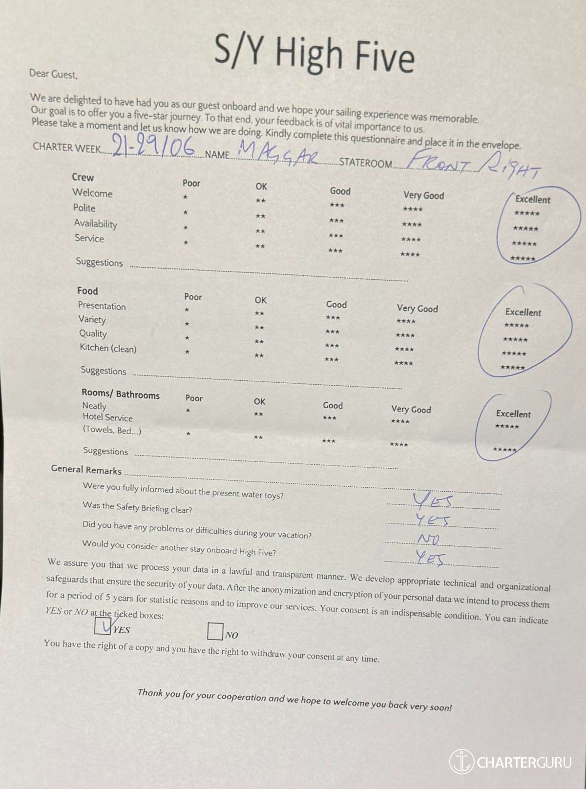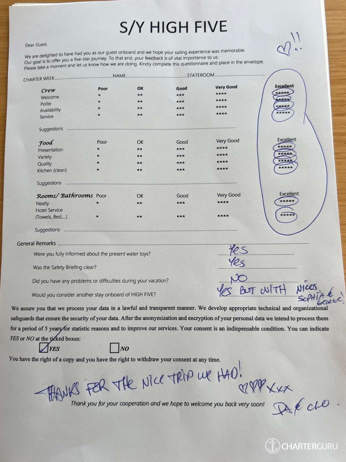 For a sailing catamaran like HIGH FIVE, the expected APA is 20% to 35% of the charter price (€4,000 - €7,000), making the charter cost €24,000 to €27,000. Exact amount will be confirmed after inquiry.