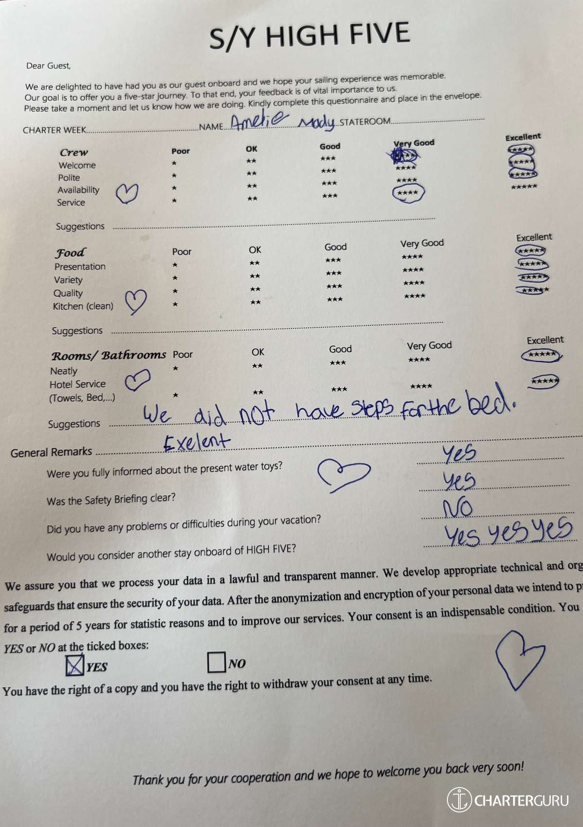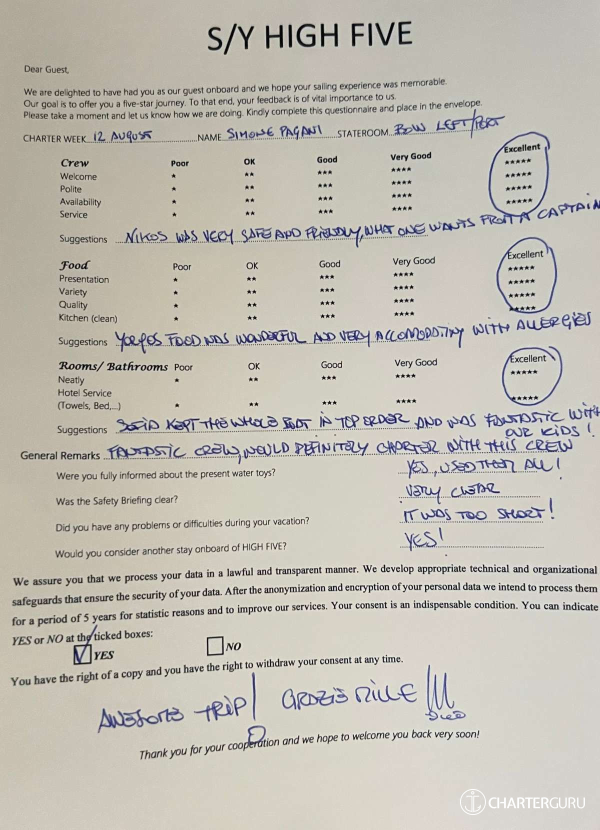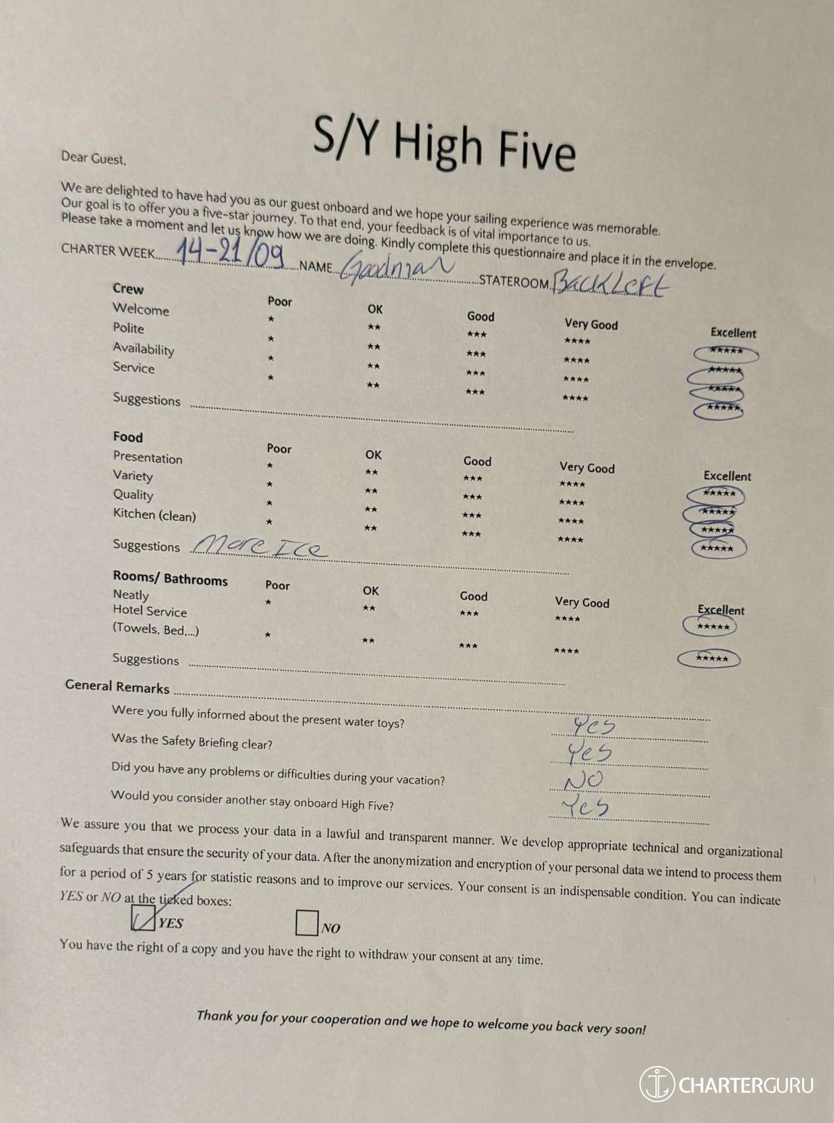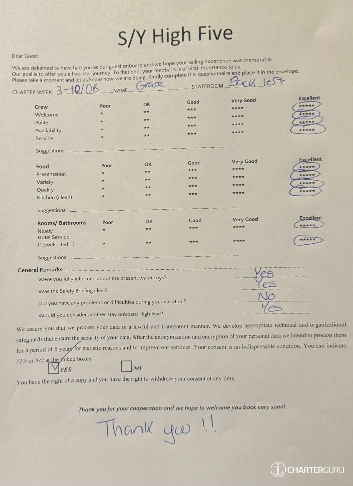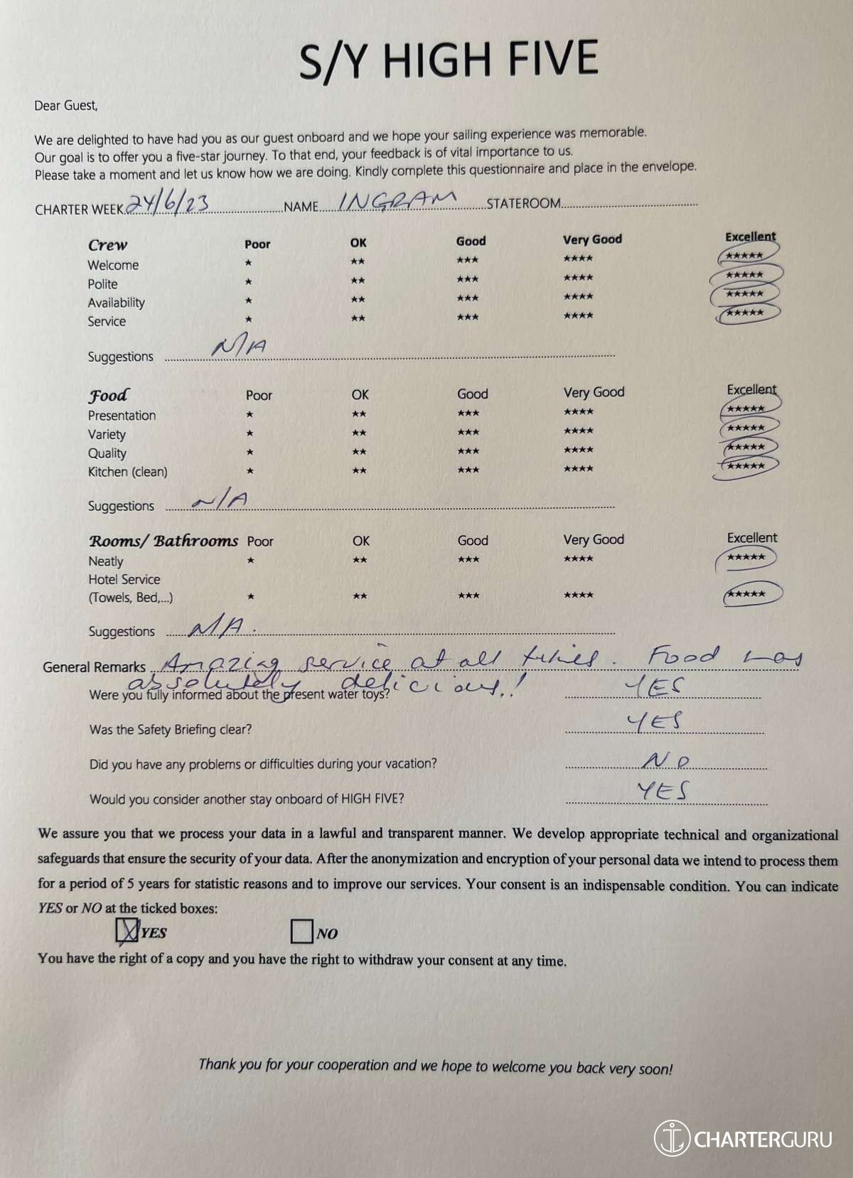 For a sailing catamaran like HIGH FIVE, the expected APA is 20% to 35% of the charter price (€4,000 - €7,000), making the charter cost €24,000 to €27,000. Exact amount will be confirmed after inquiry.