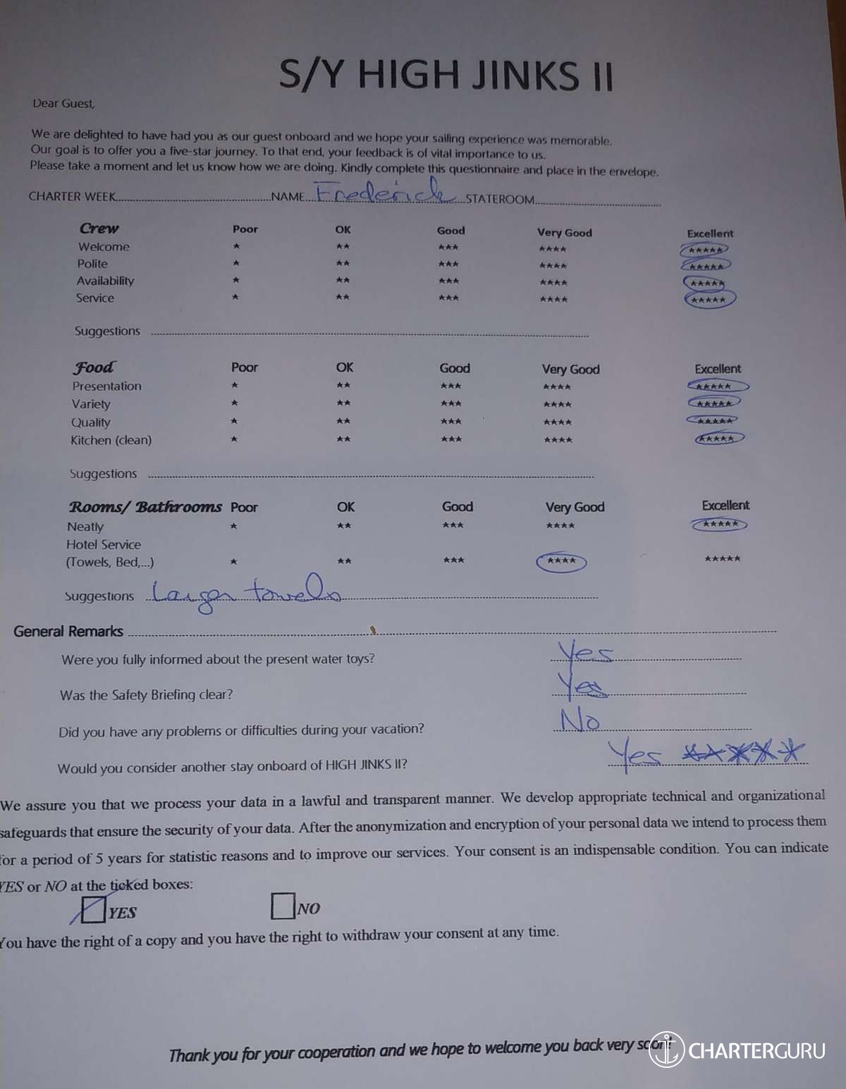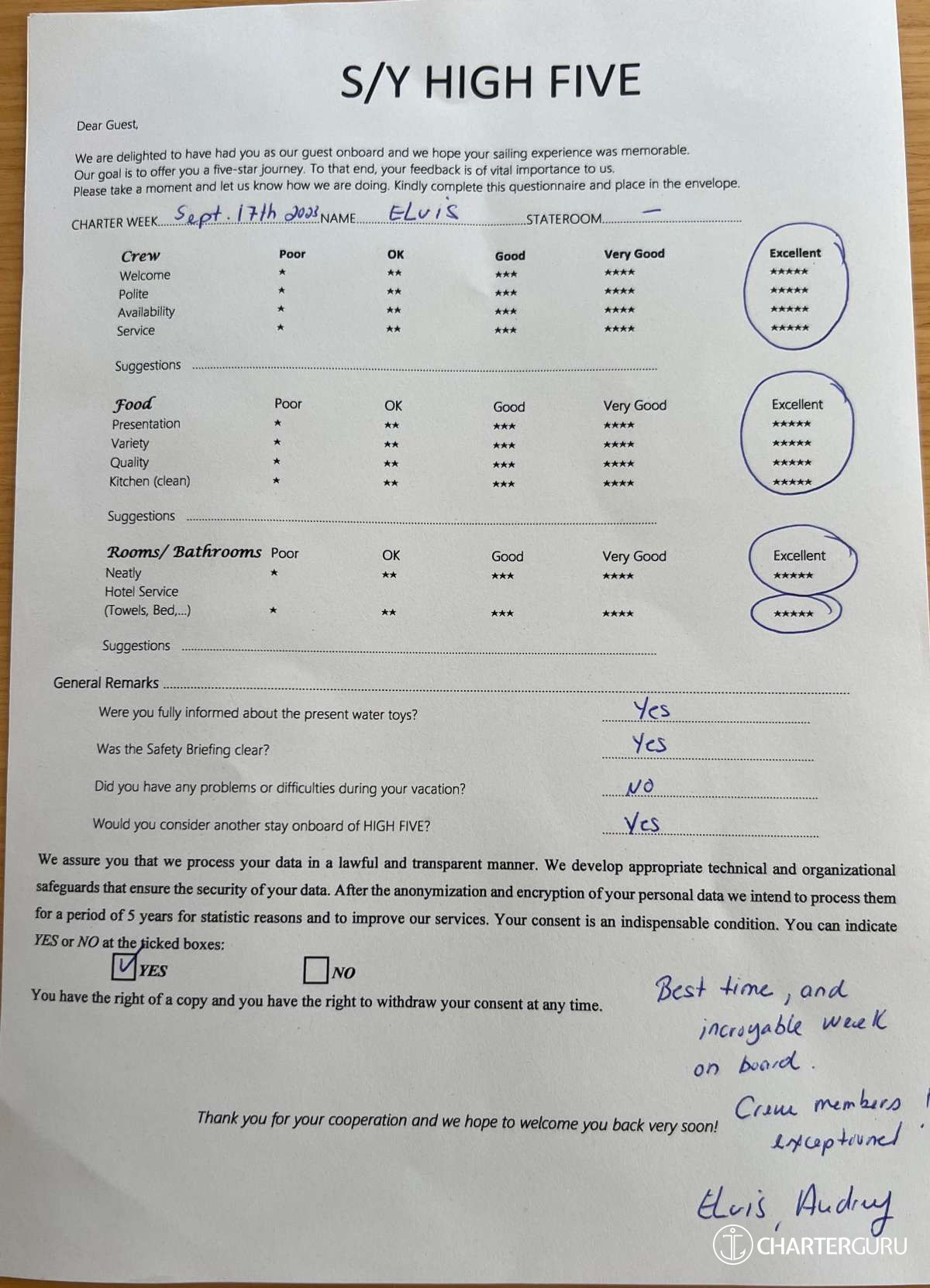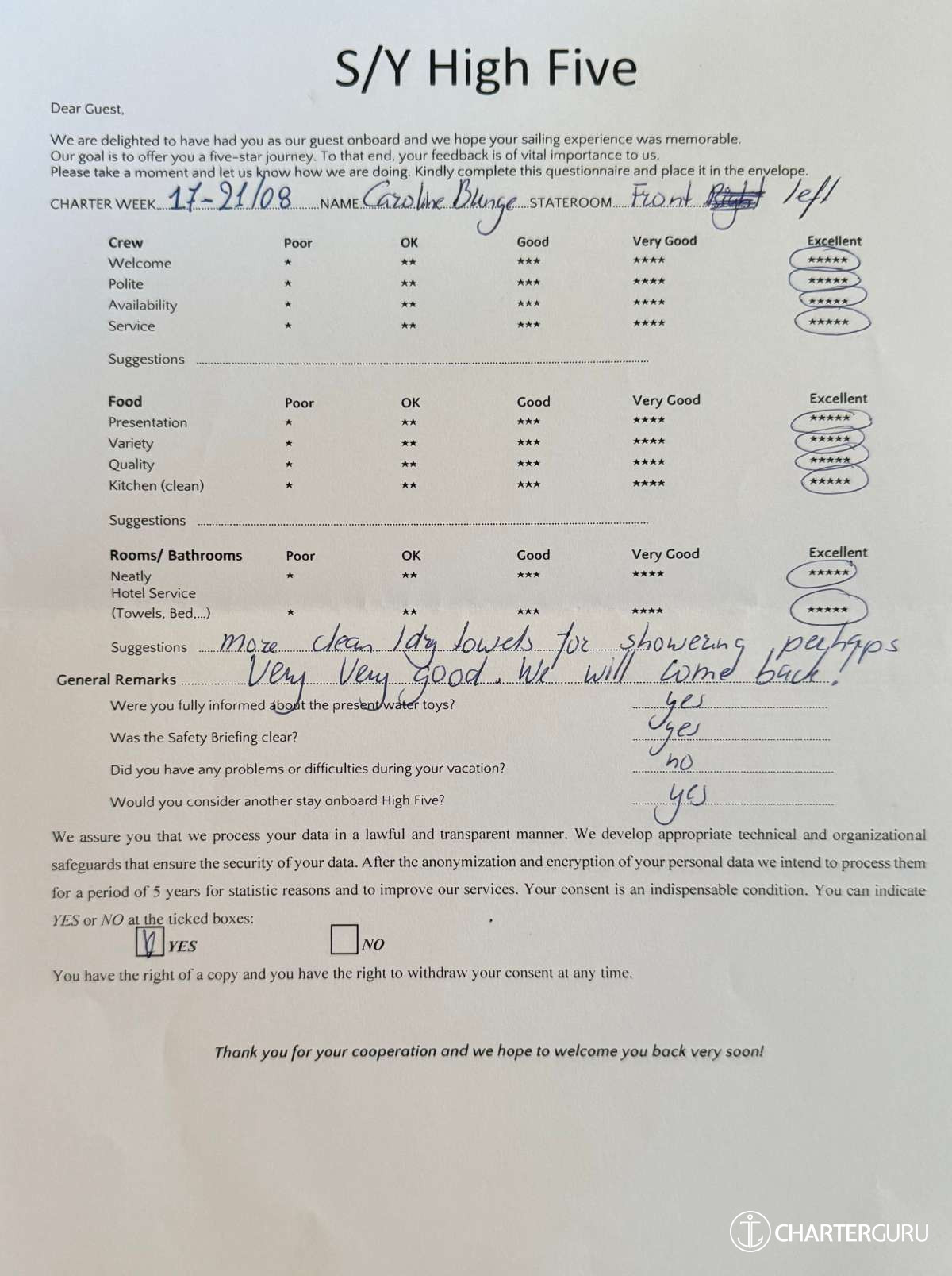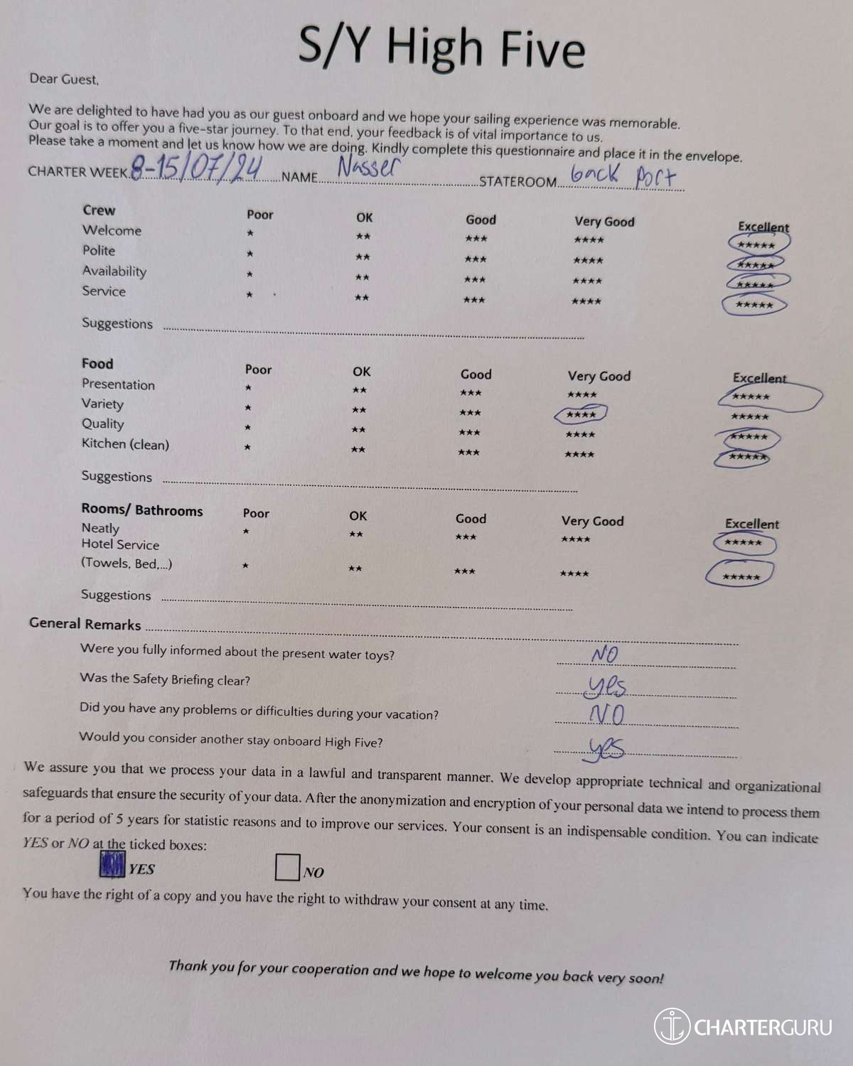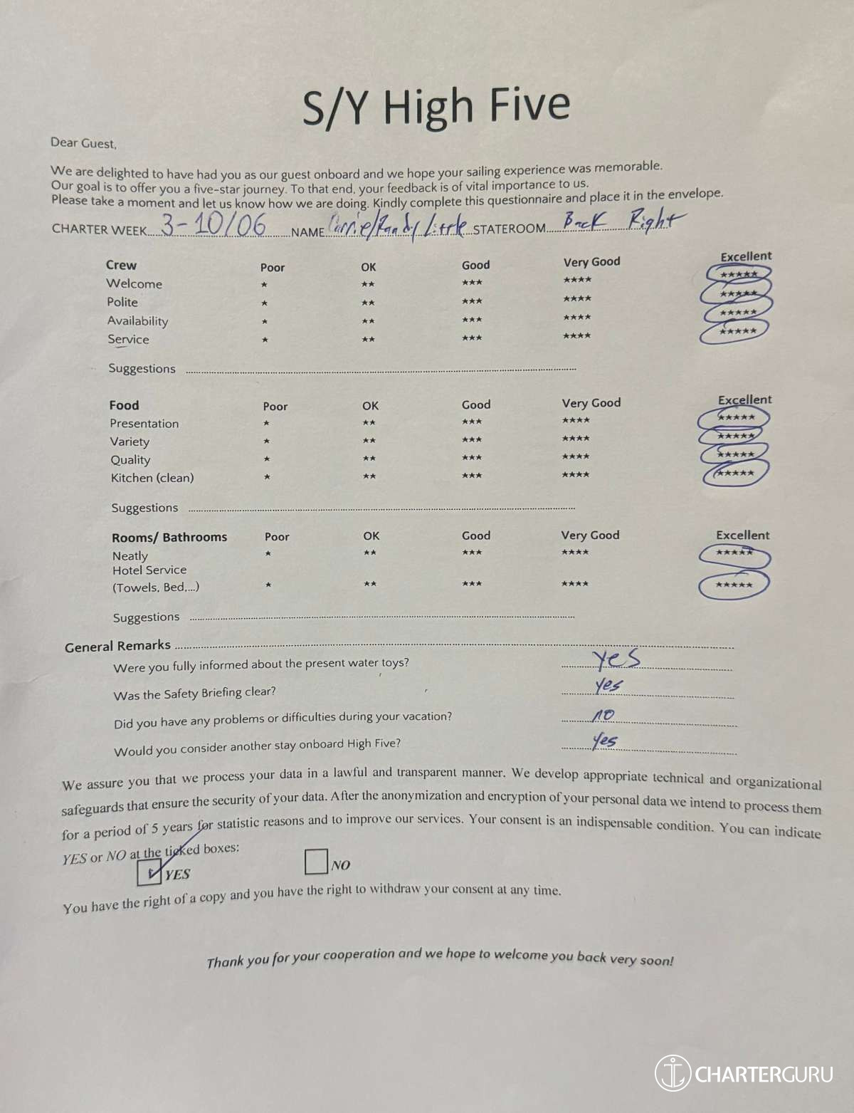 For a sailing catamaran like HIGH FIVE, the expected APA is 20% to 35% of the charter price (€4,000 - €7,000), making the charter cost €24,000 to €27,000. Exact amount will be confirmed after inquiry.