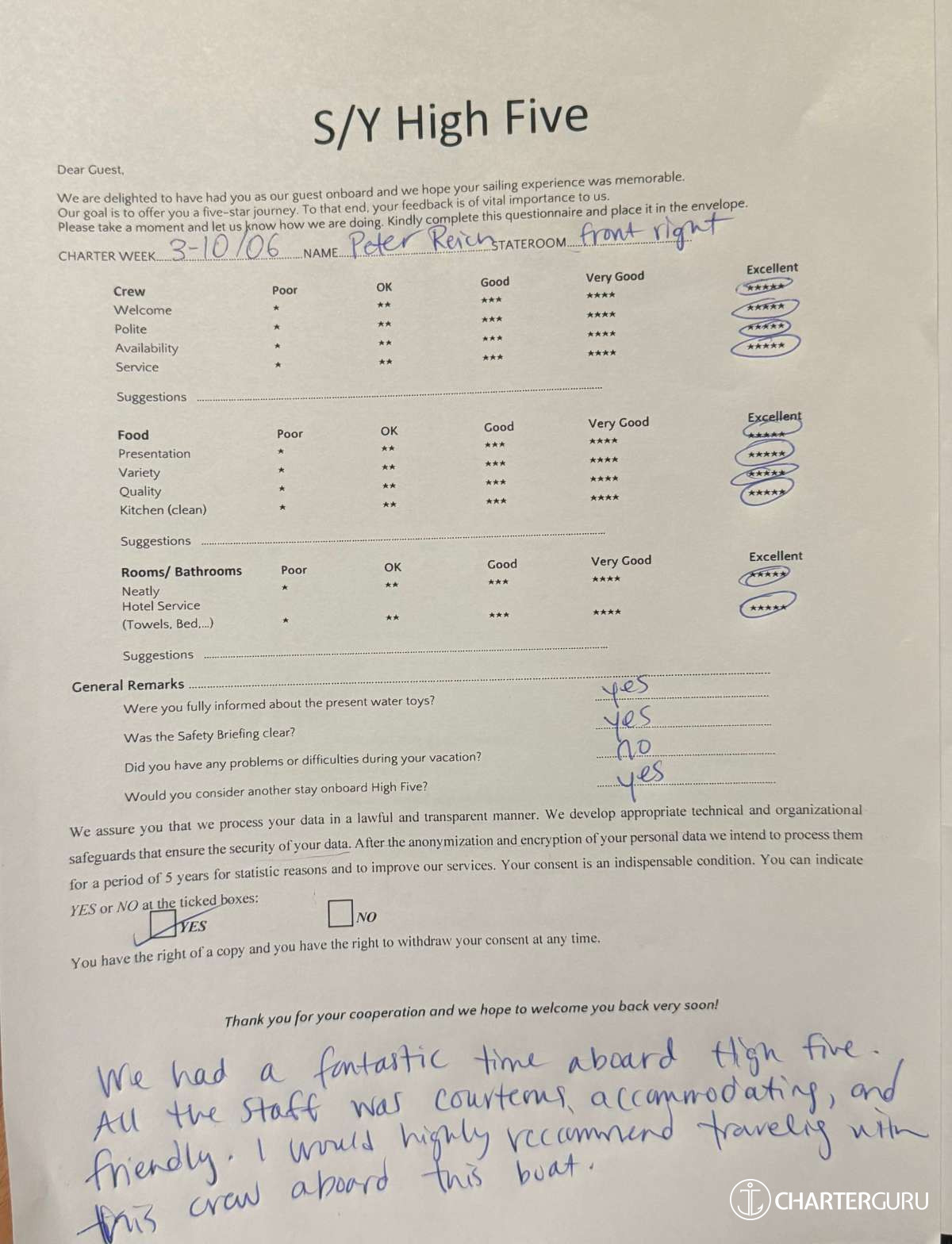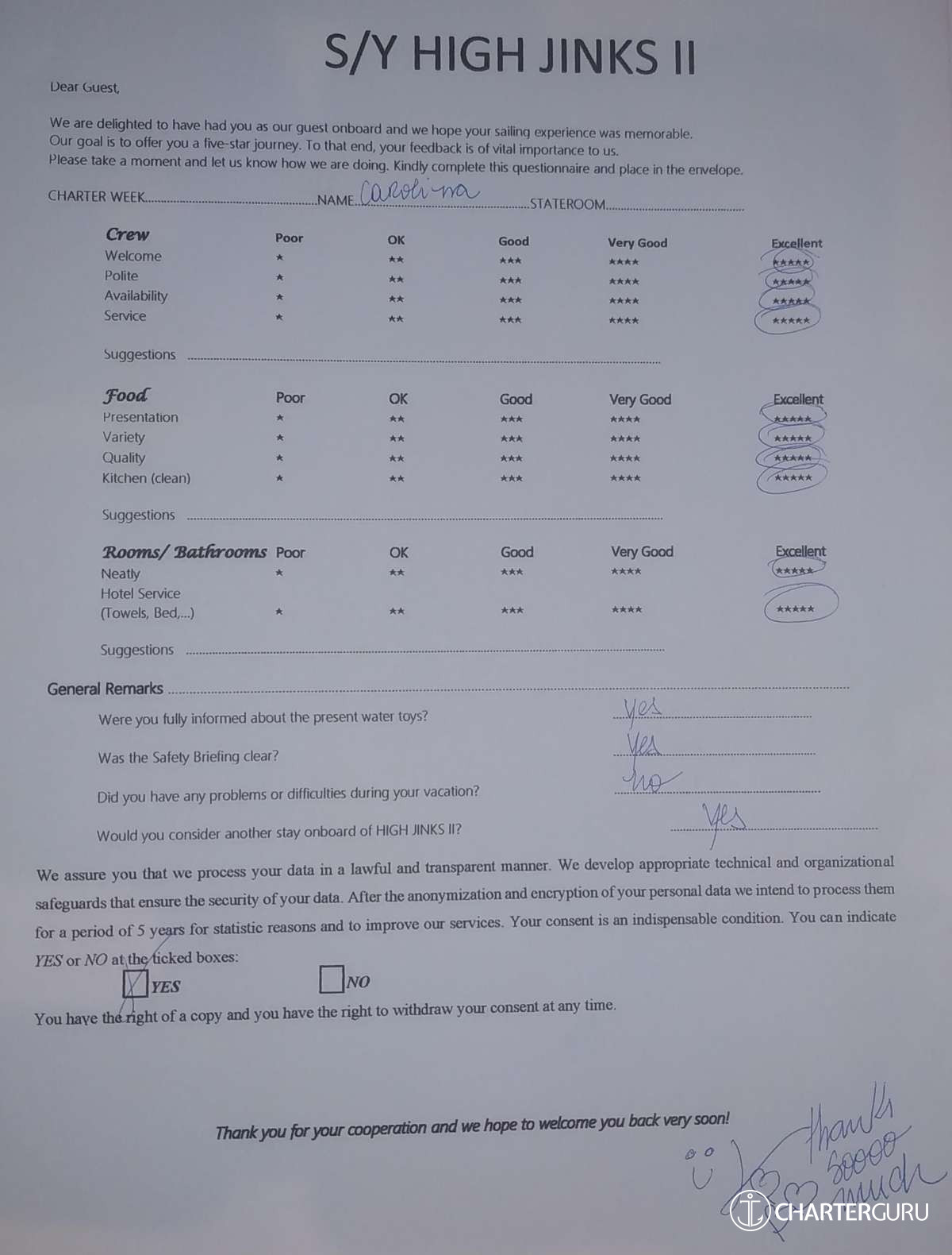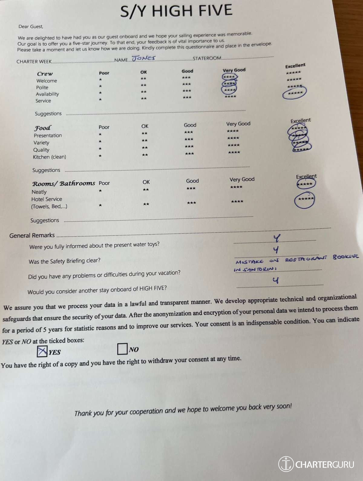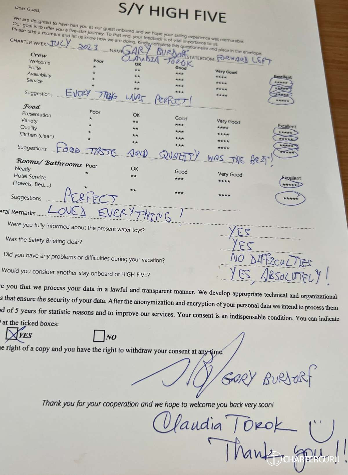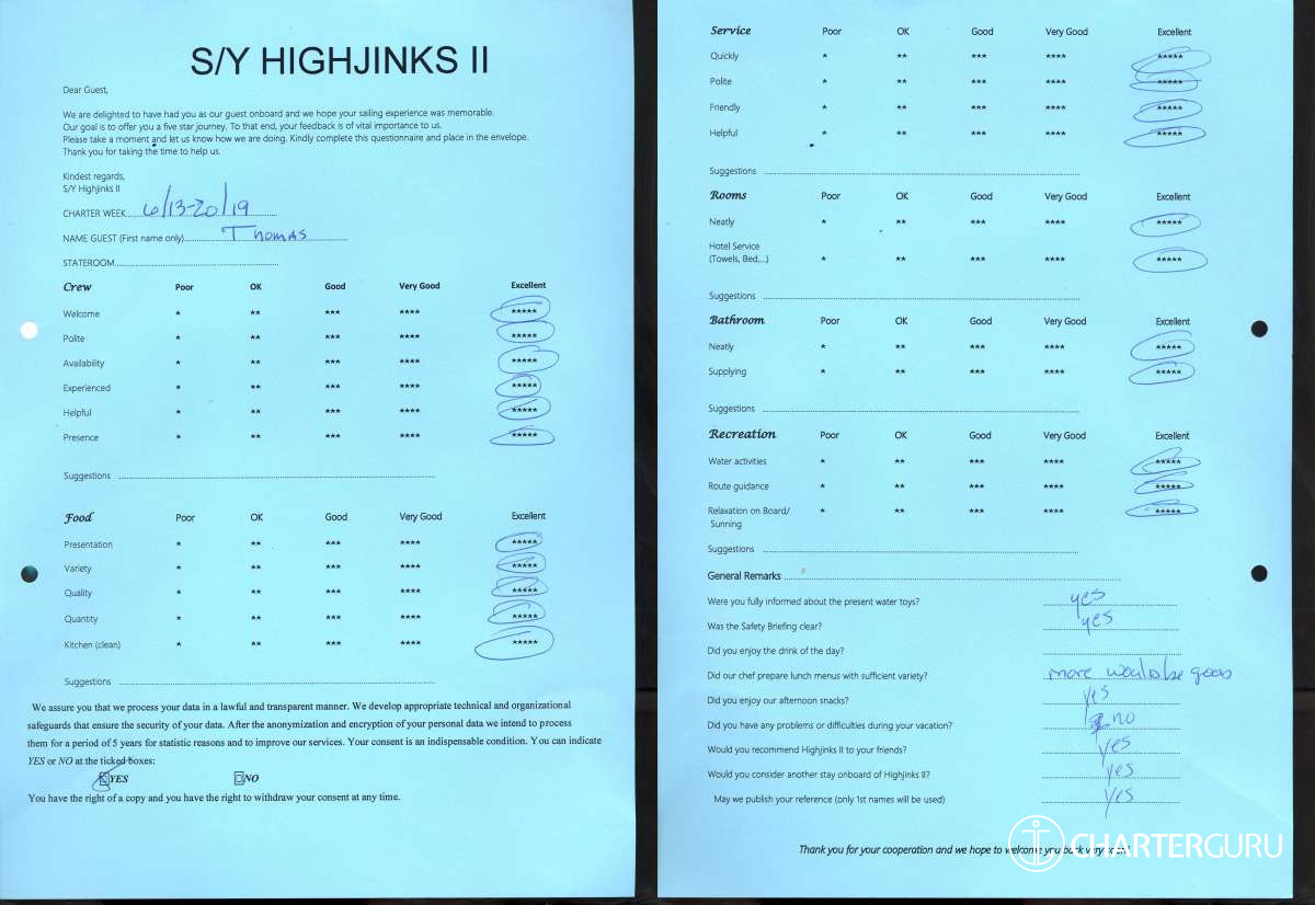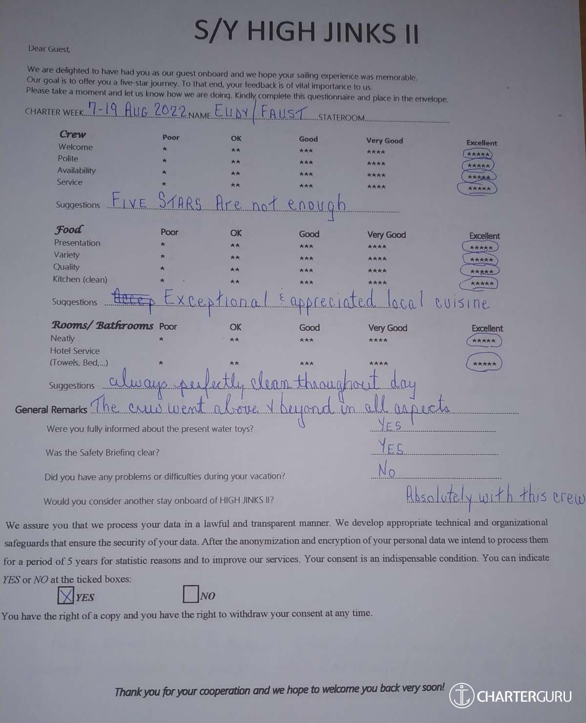 For a sailing catamaran like HIGH FIVE, the expected APA is 20% to 35% of the charter price (€4,000 - €7,000), making the charter cost €24,000 to €27,000. Exact amount will be confirmed after inquiry.