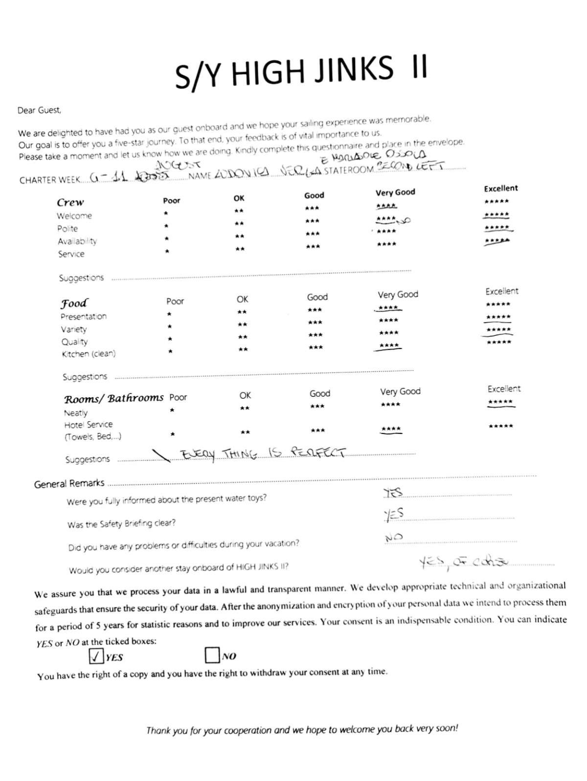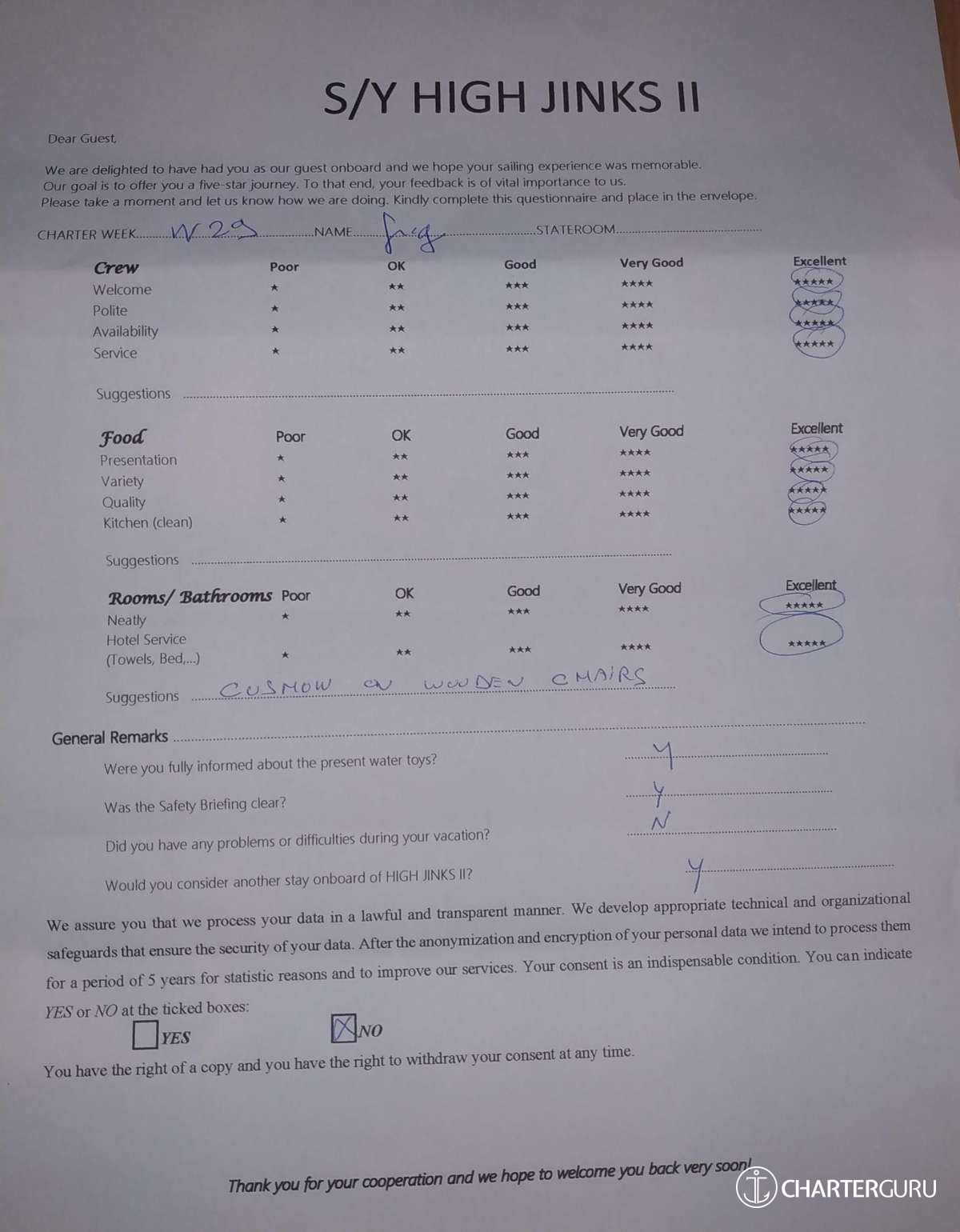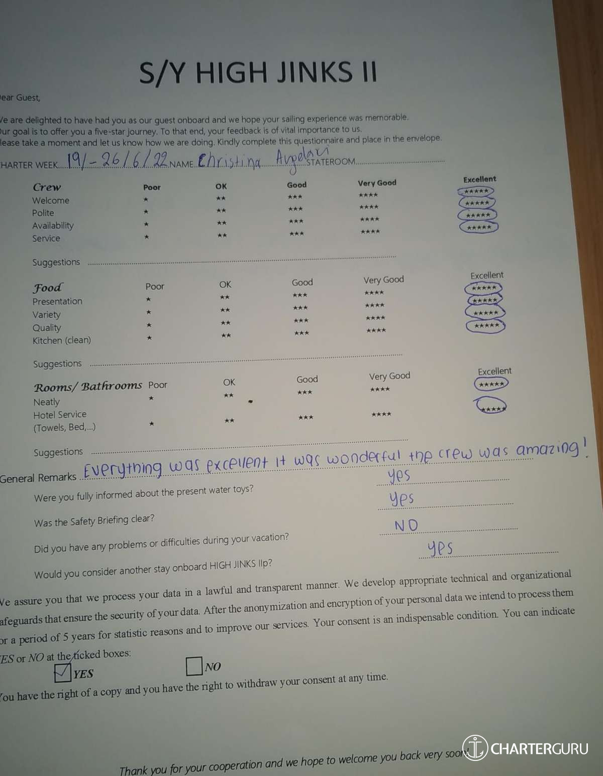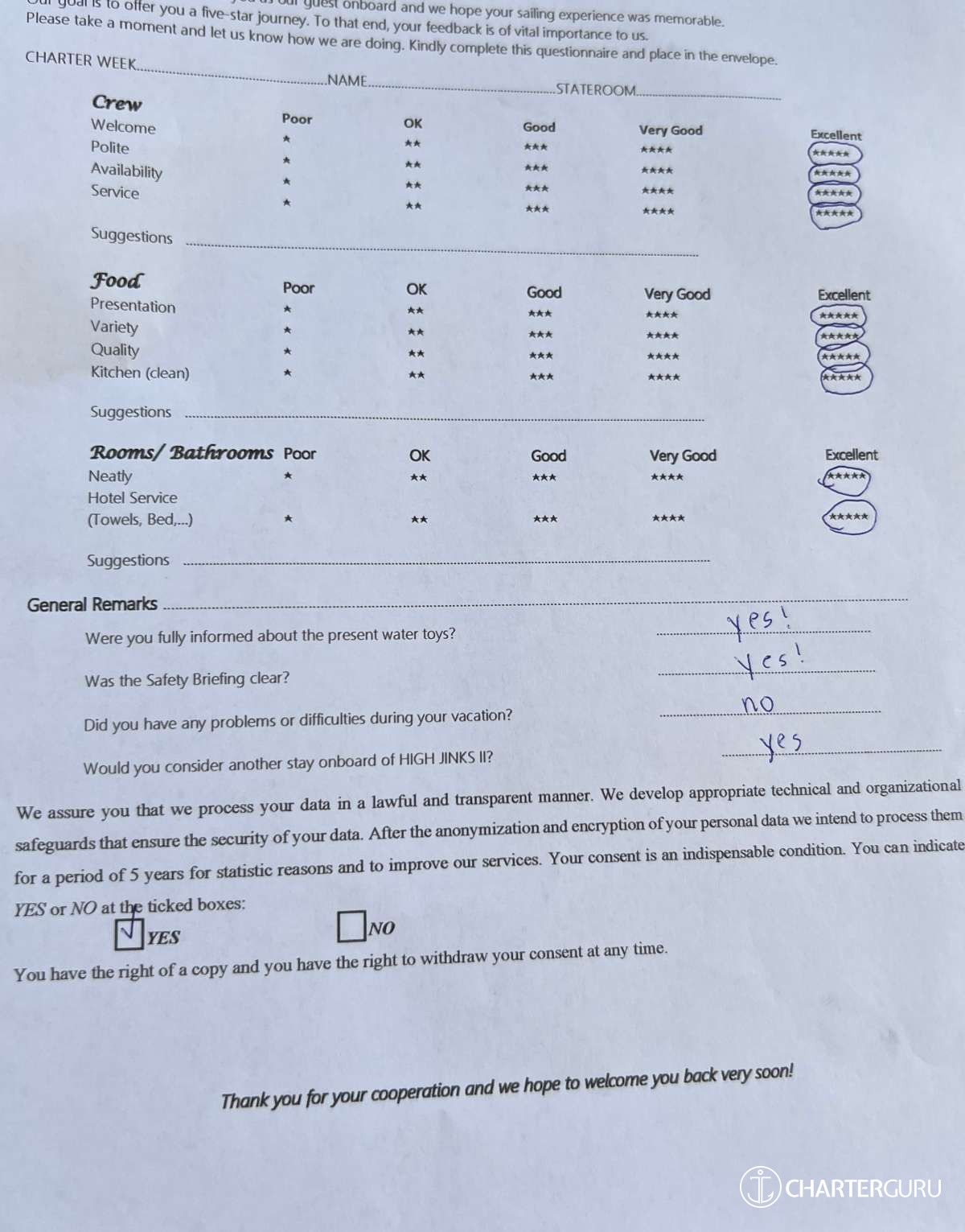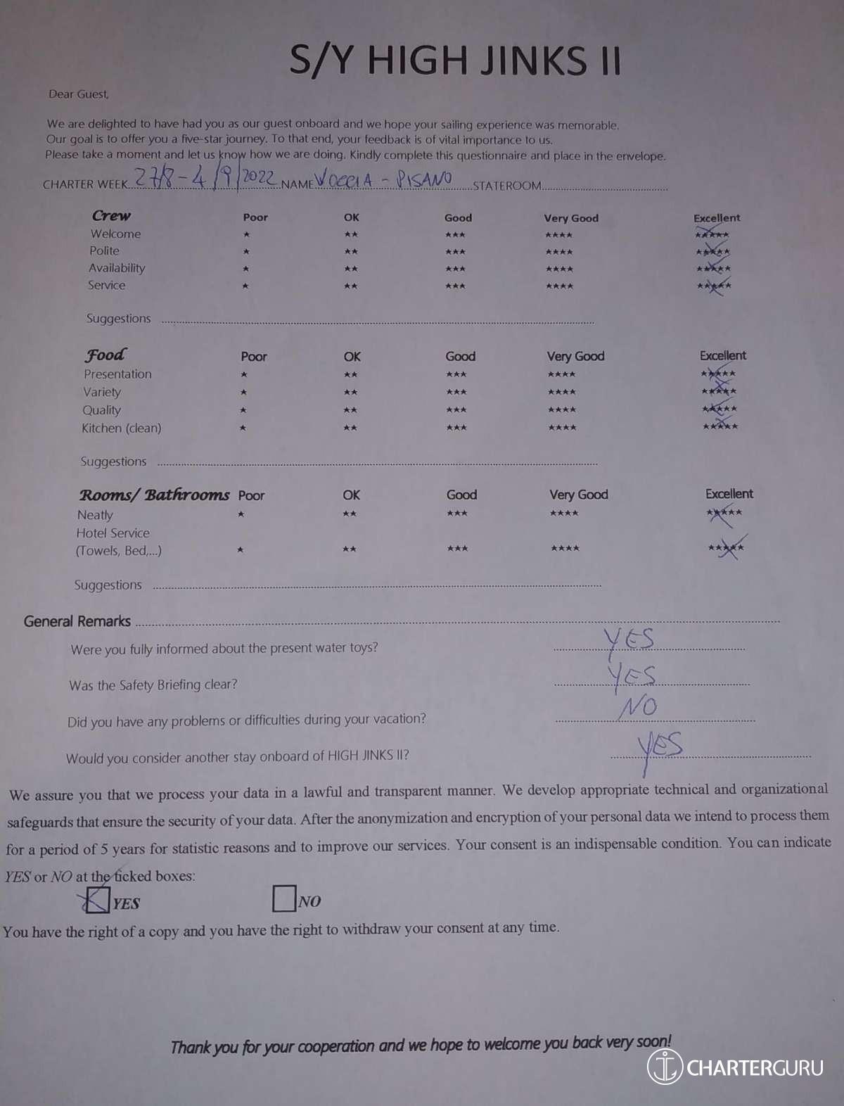For a sailing catamaran like HIGH FIVE, the expected APA is 20% to 35% of the charter price (€4,000 - €7,000), making the charter cost €24,000 to €27,000. Exact amount will be confirmed after inquiry.
