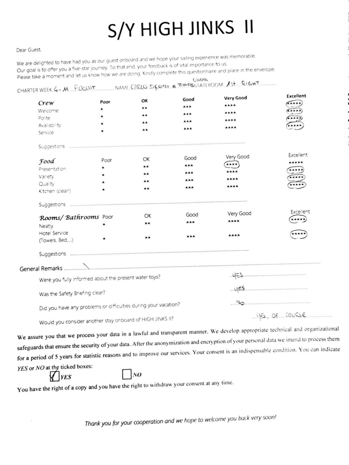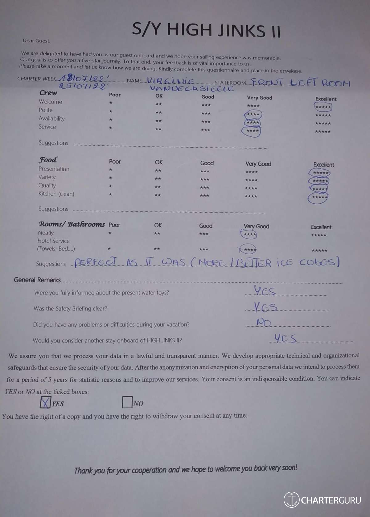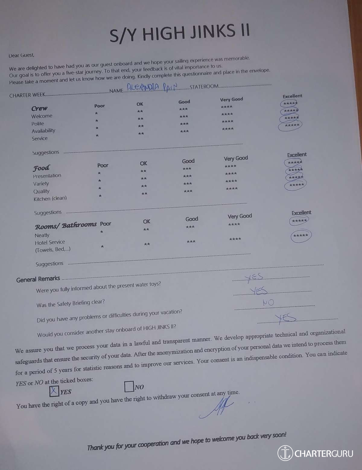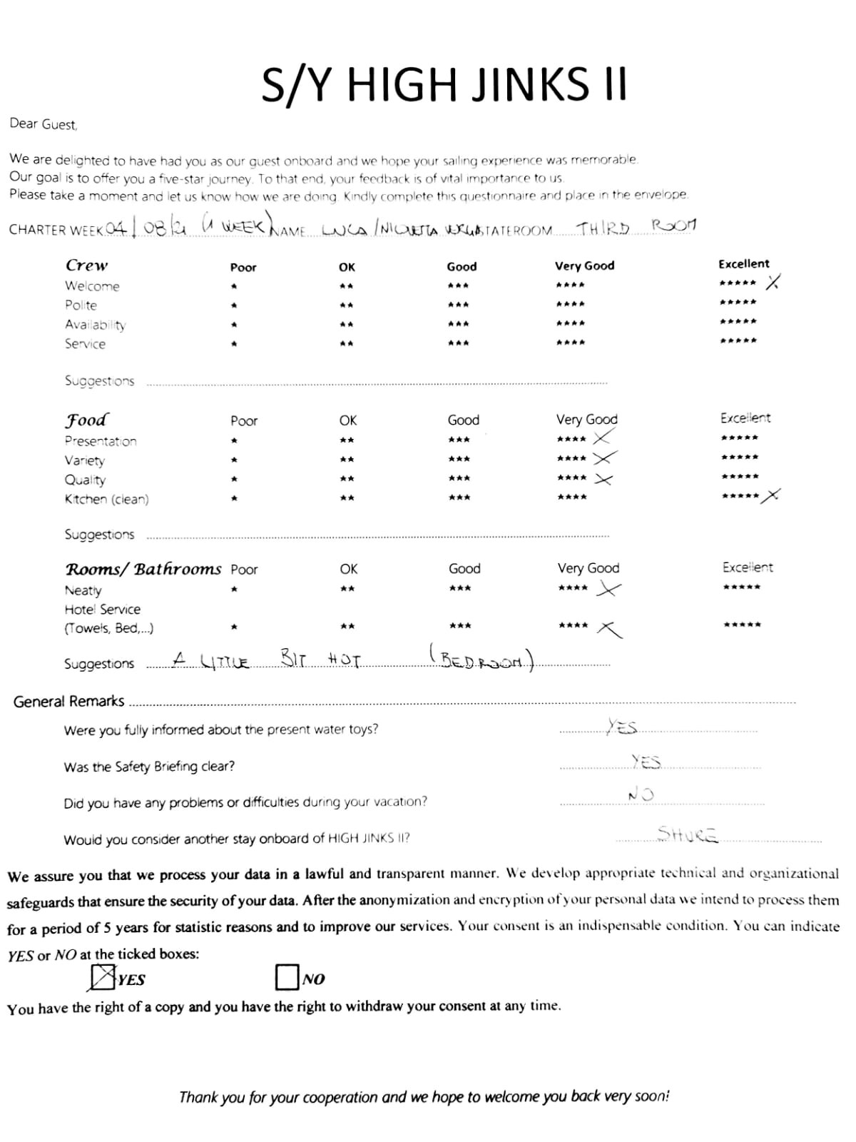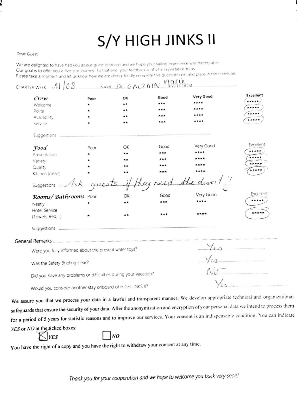 For a sailing catamaran like HIGH FIVE, the expected APA is 20% to 35% of the charter price (€4,000 - €7,000), making the charter cost €24,000 to €27,000. Exact amount will be confirmed after inquiry.