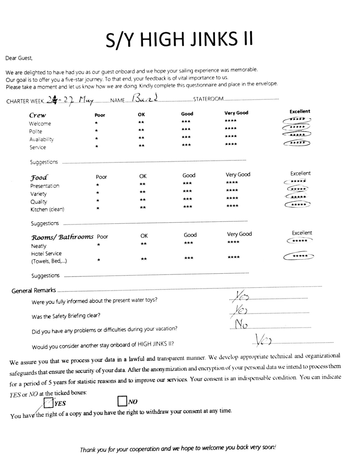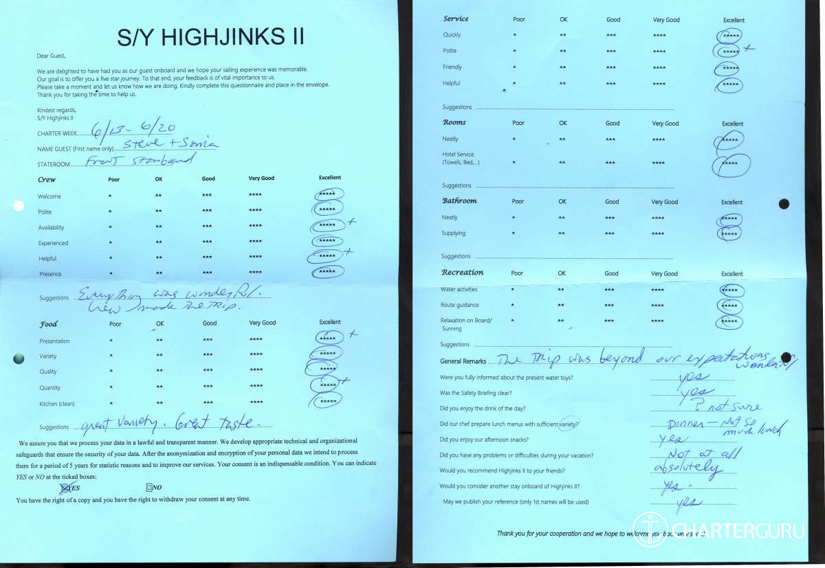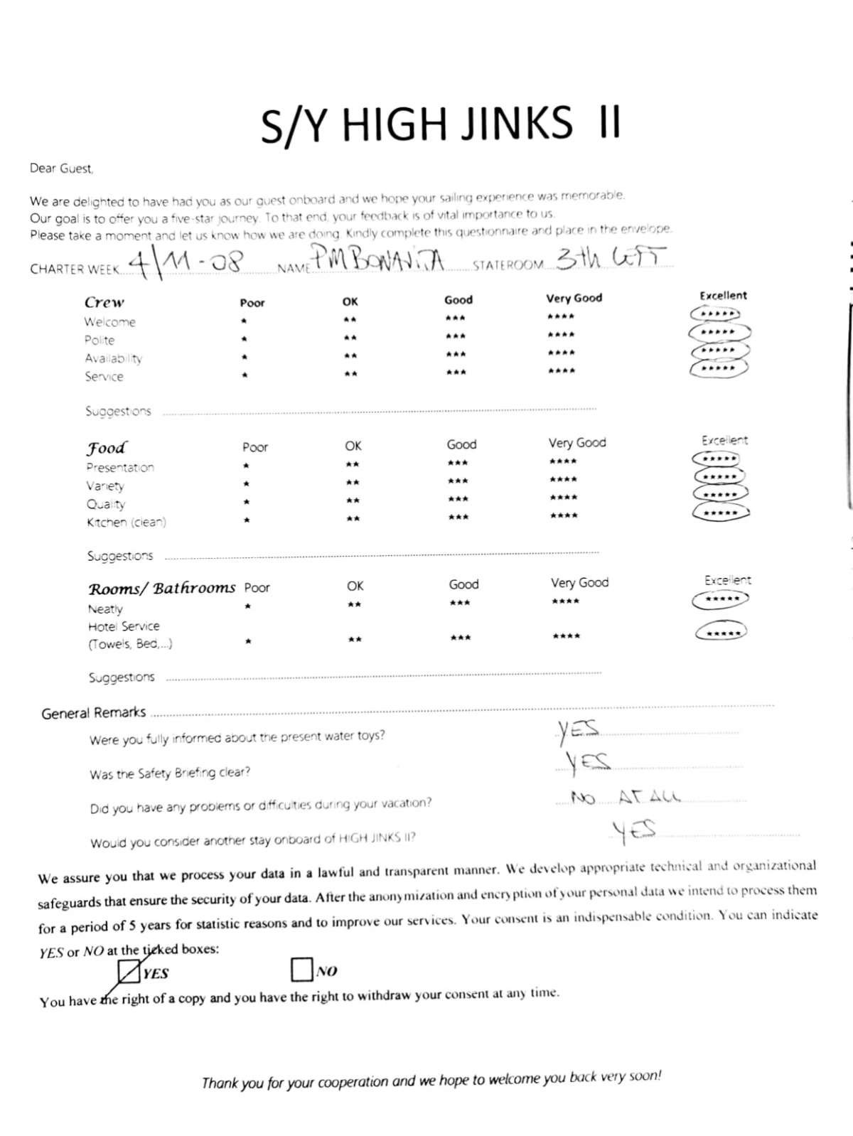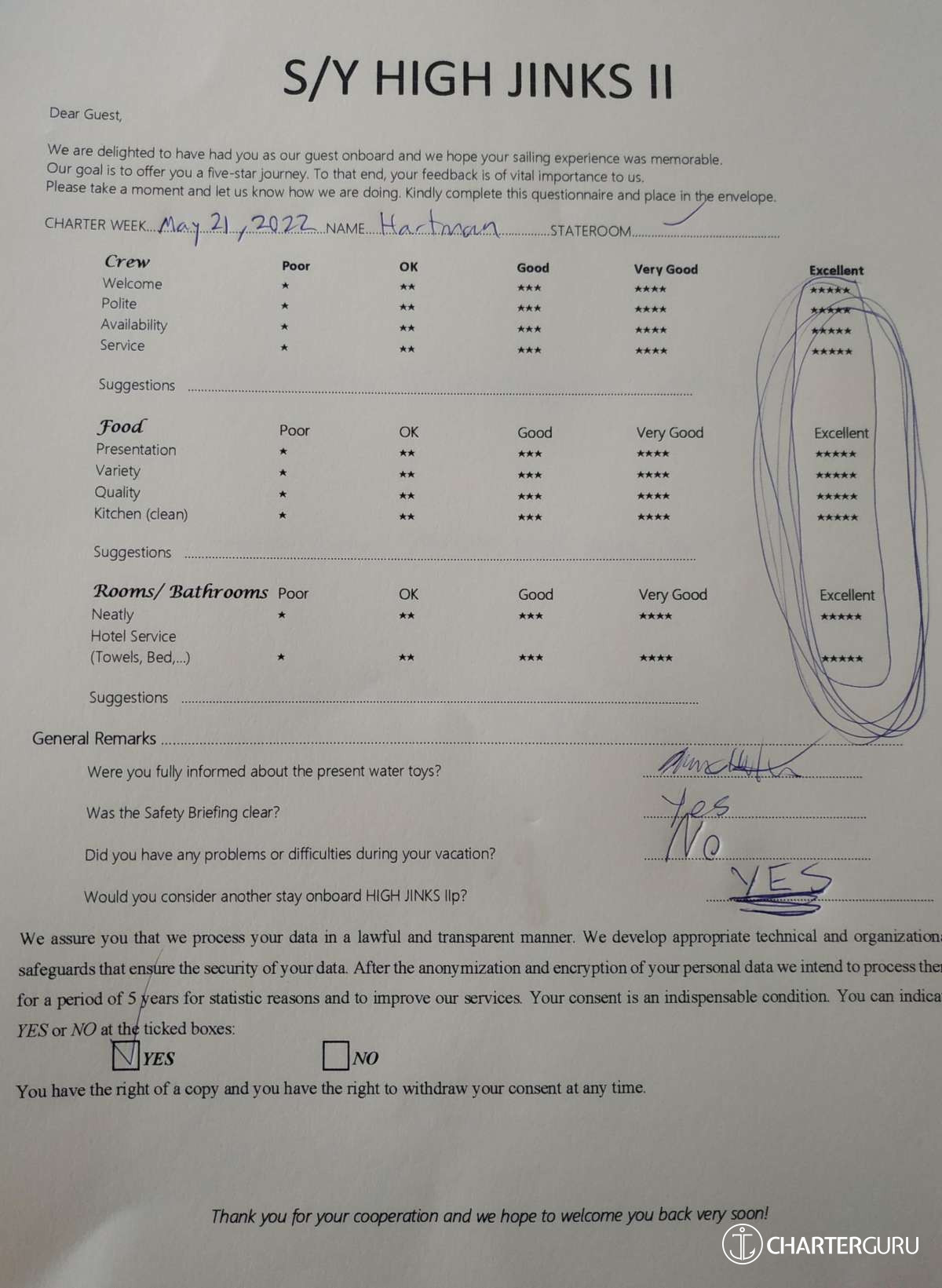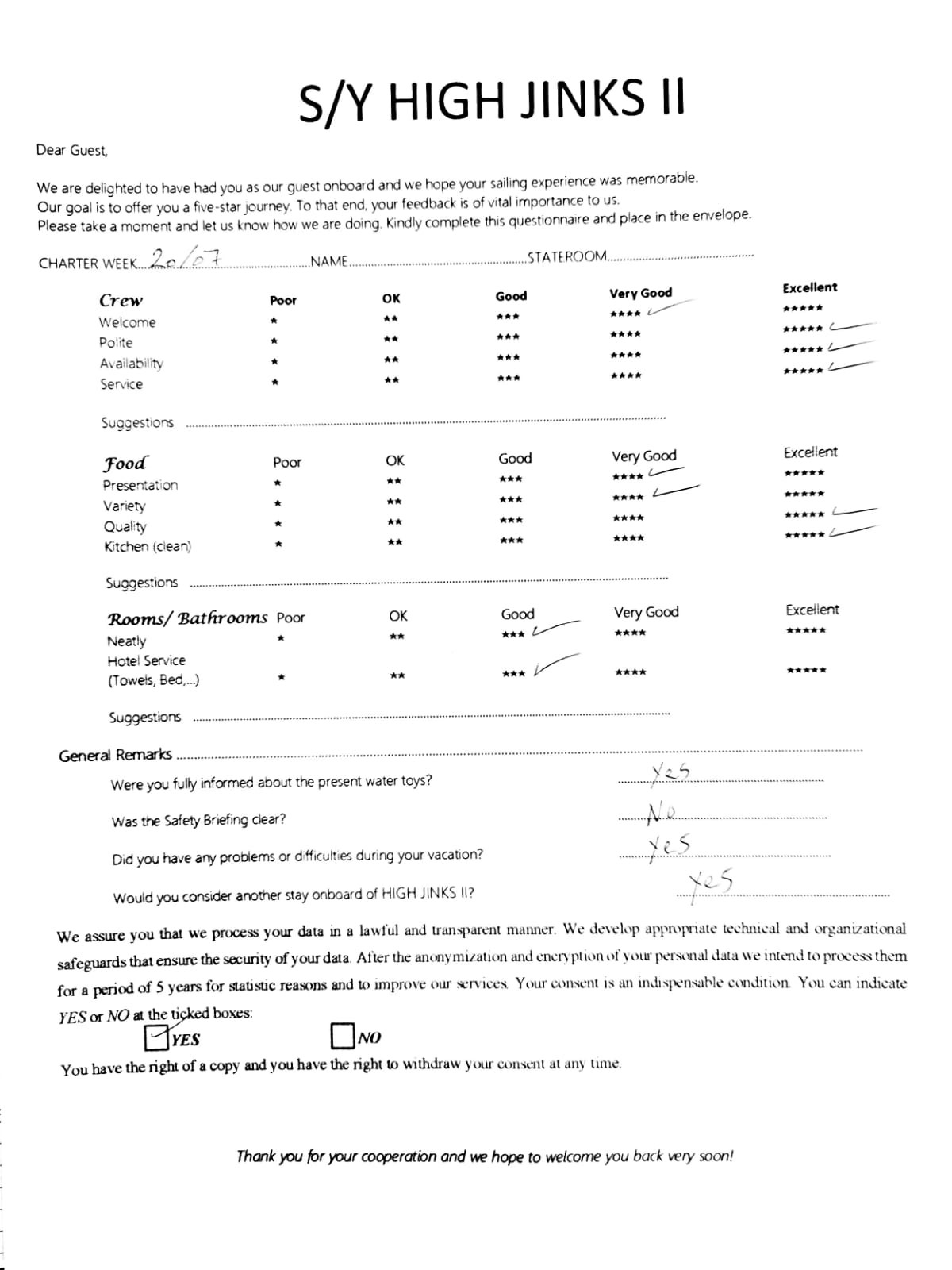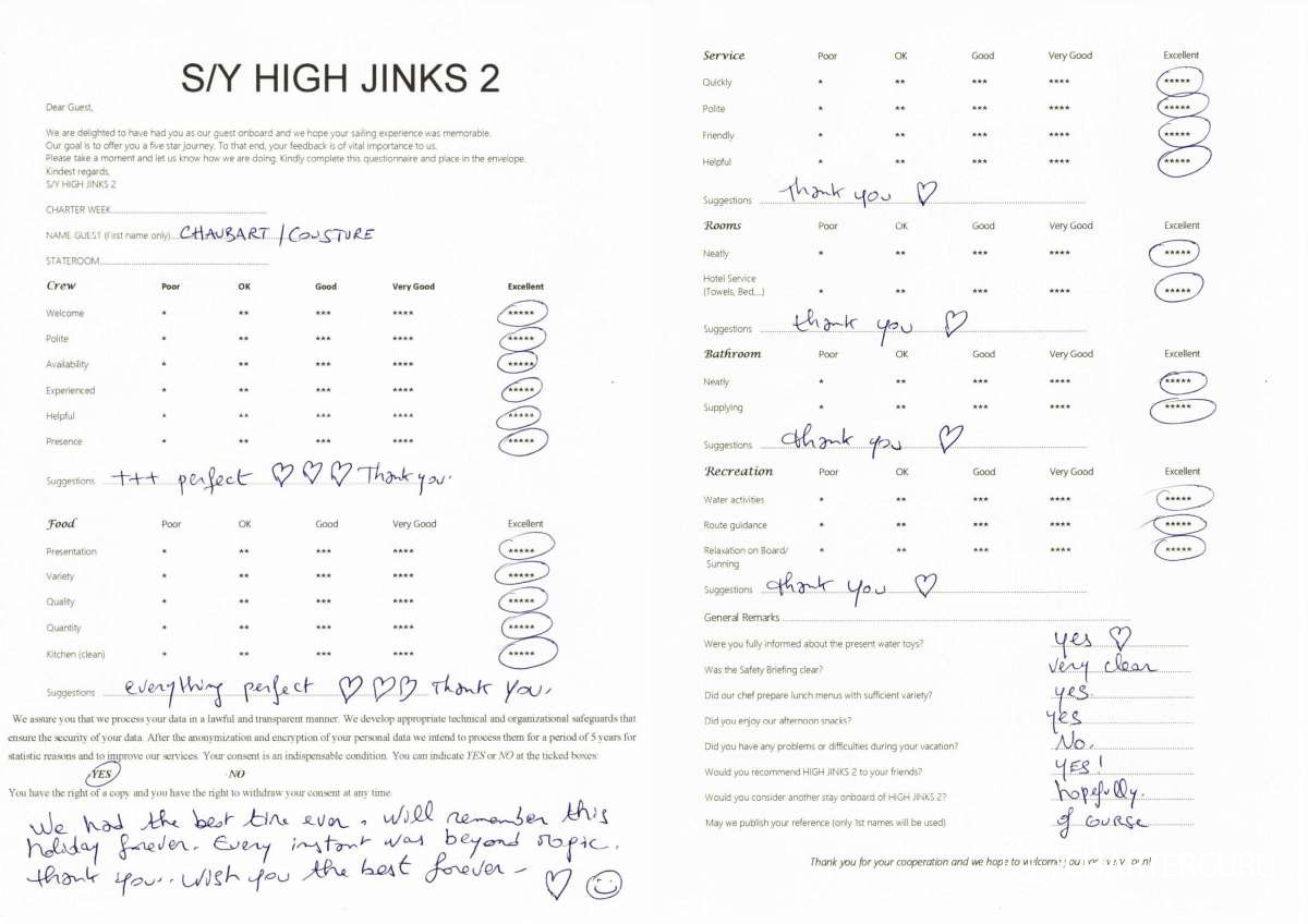 For a sailing catamaran like HIGH FIVE, the expected APA is 20% to 35% of the charter price (€4,000 - €7,000), making the charter cost €24,000 to €27,000. Exact amount will be confirmed after inquiry.