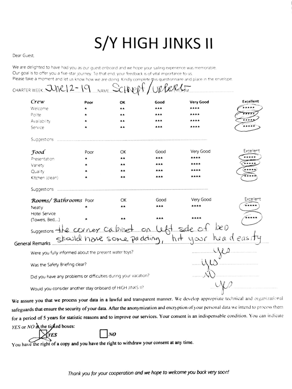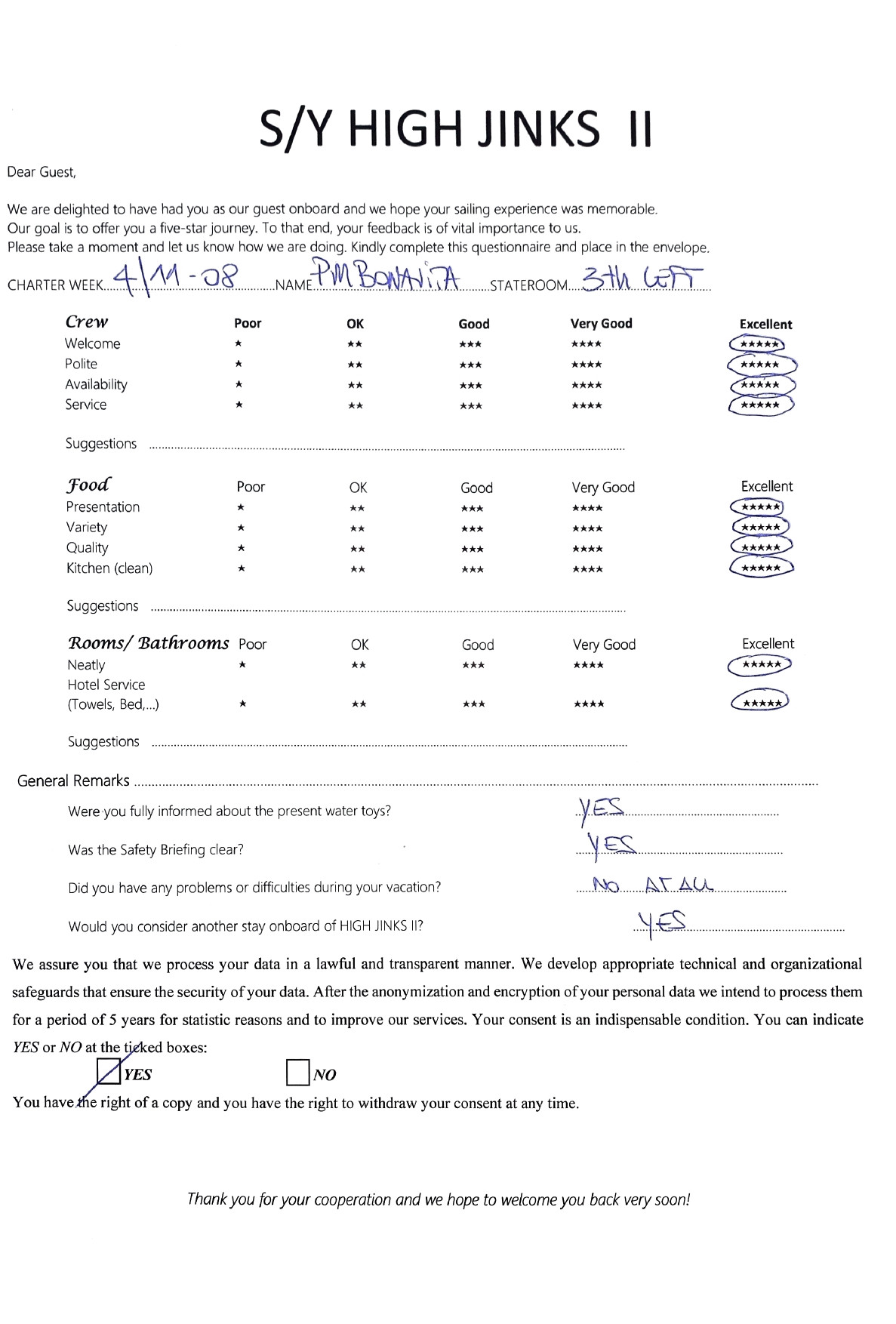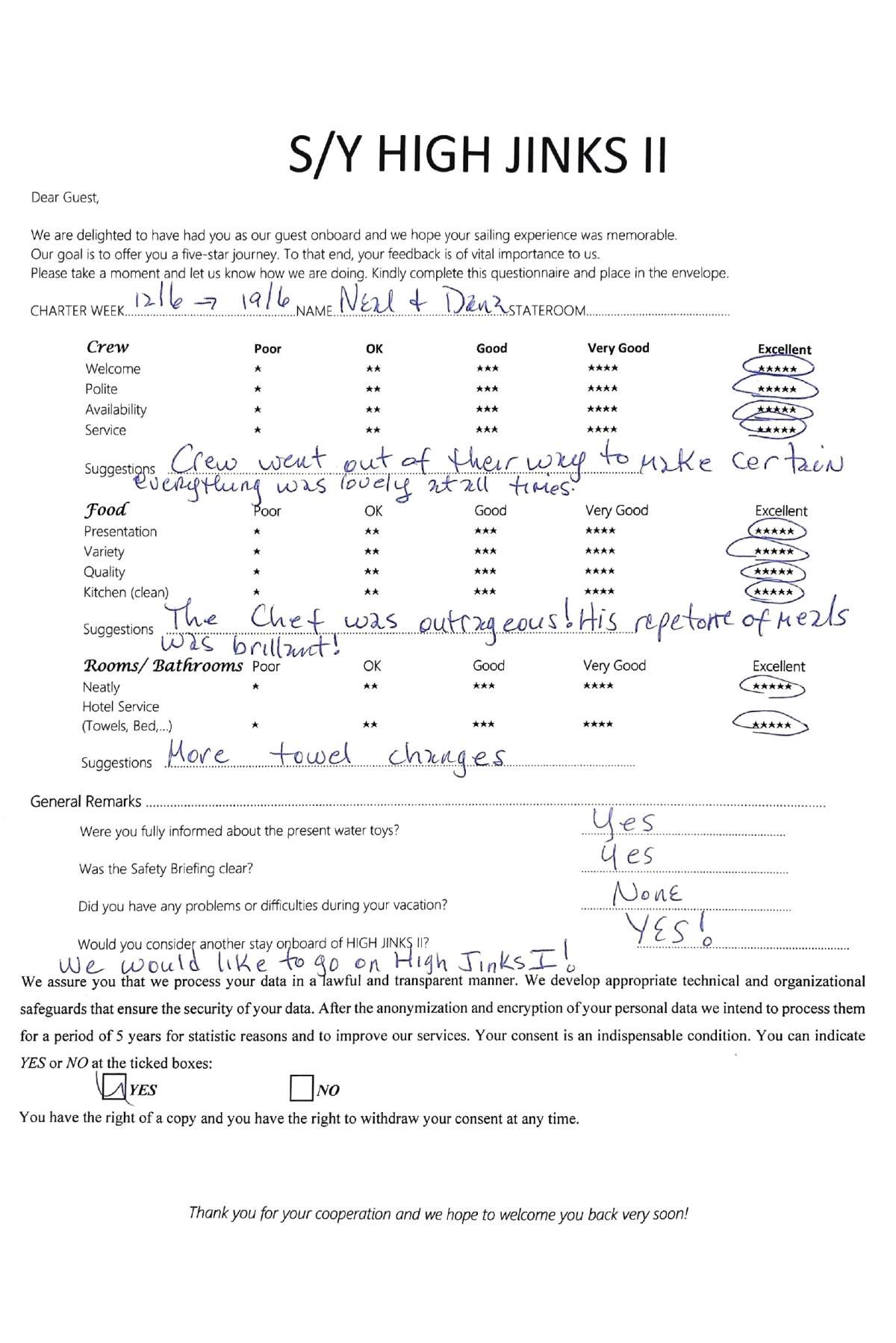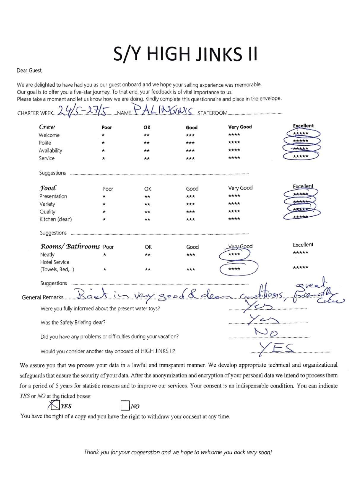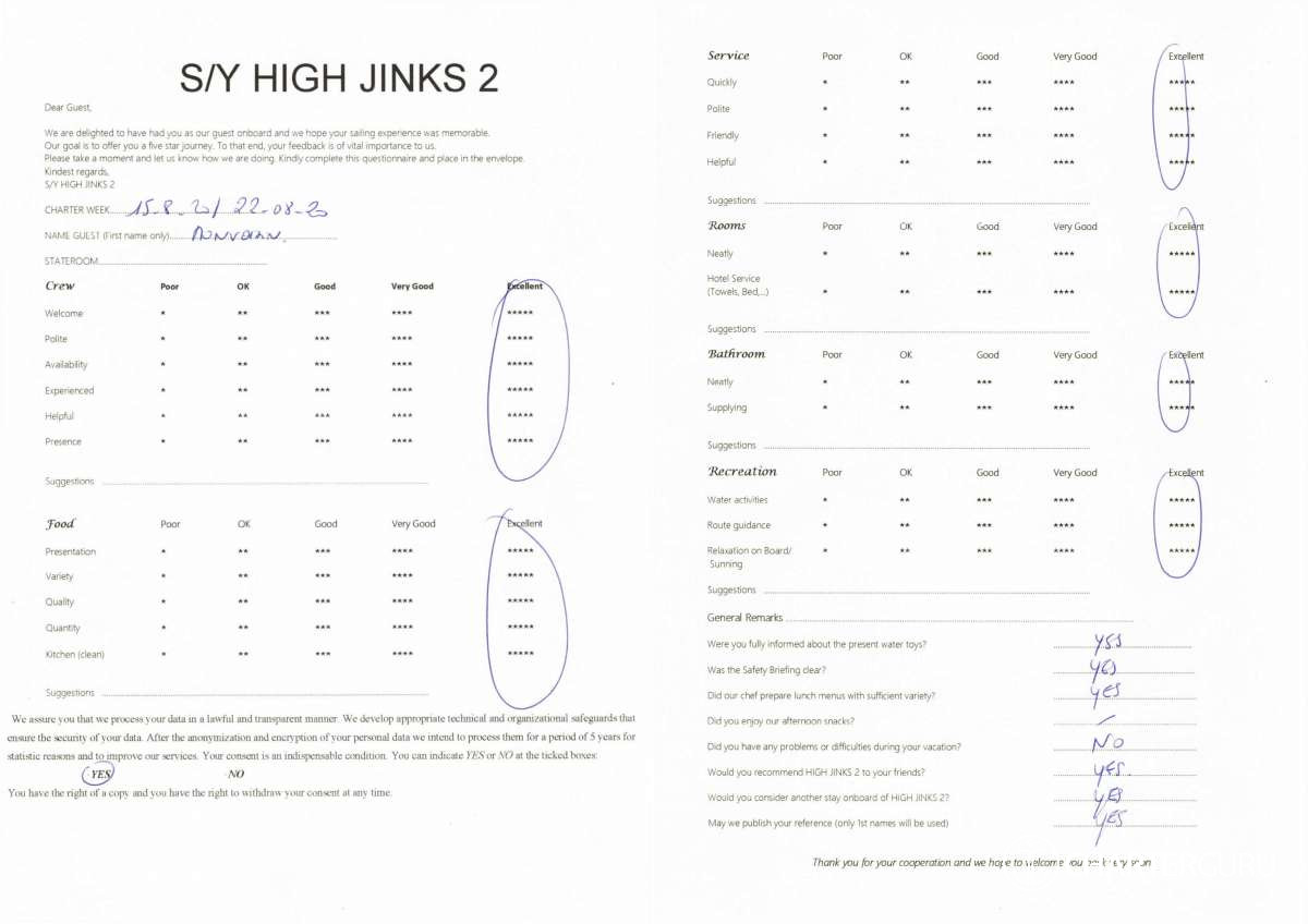 For a sailing catamaran like HIGH FIVE, the expected APA is 20% to 35% of the charter price (€4,000 - €7,000), making the charter cost €24,000 to €27,000. Exact amount will be confirmed after inquiry.