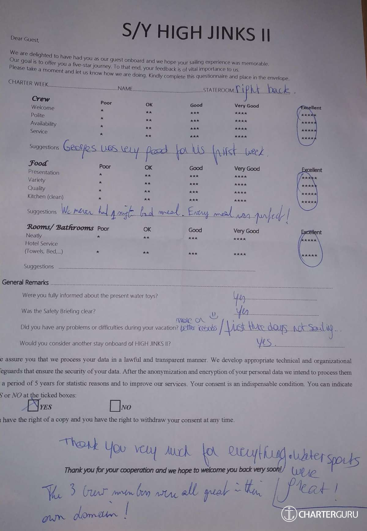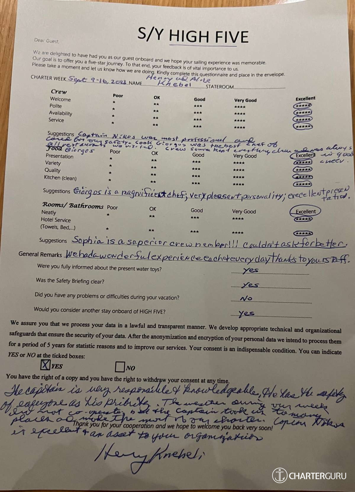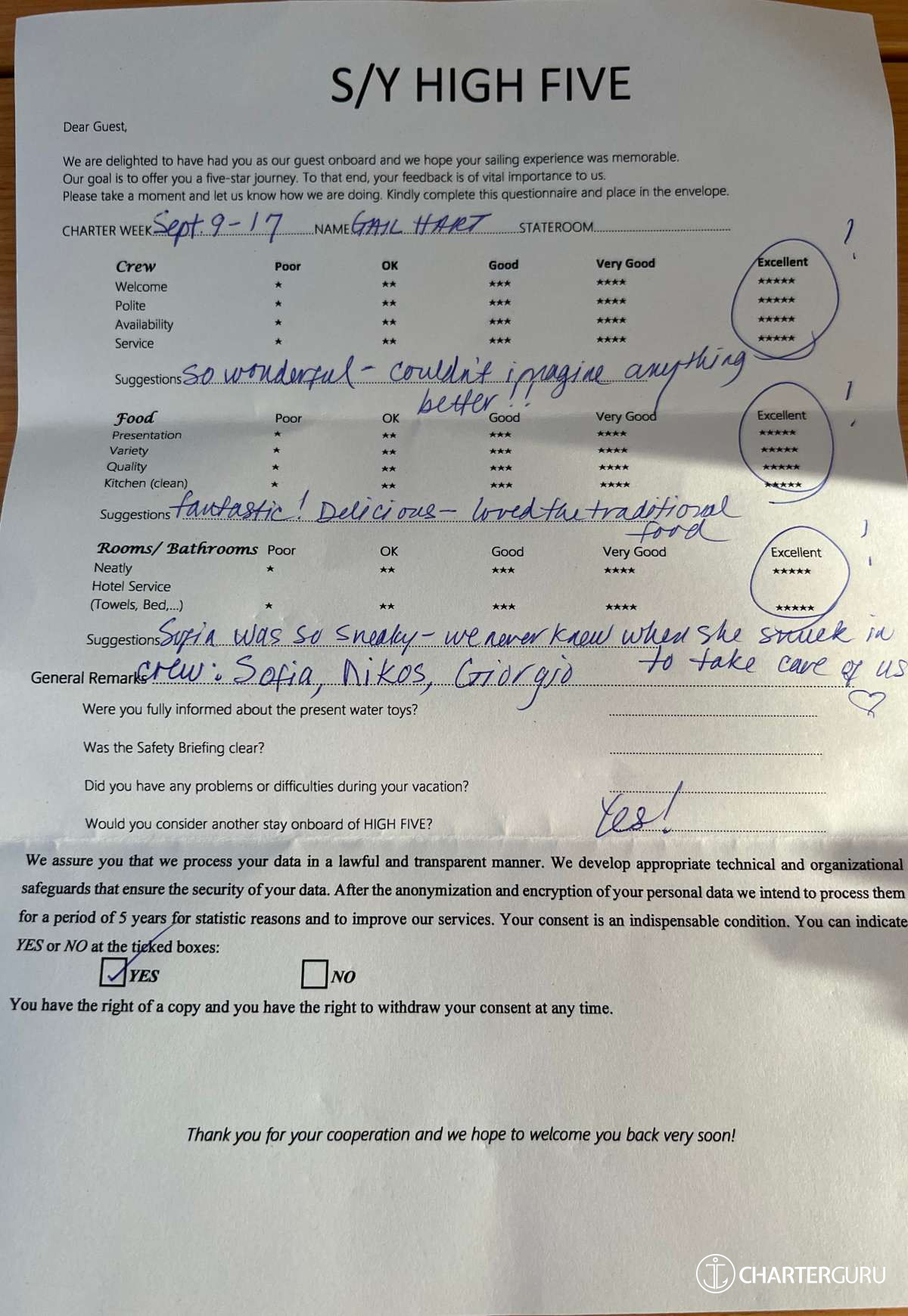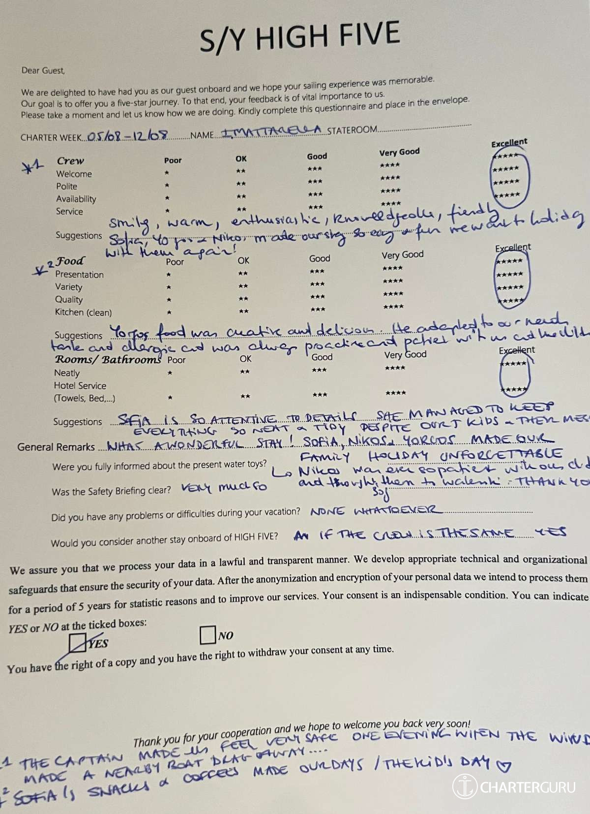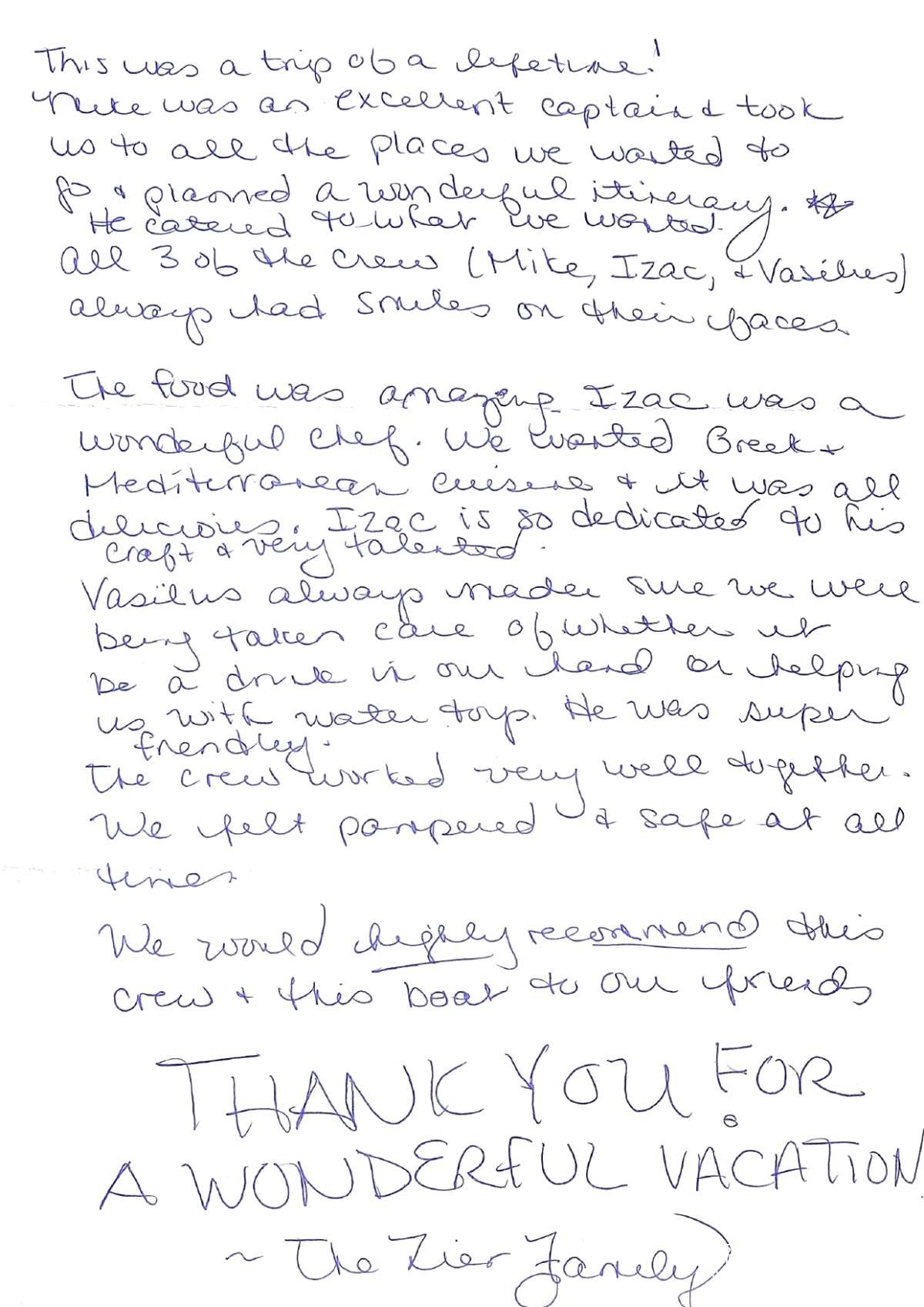 The crew were amazing. Capt Costas did a great job organizing and managing the trip. Very friendly and personable, working to make sure everything was just right. Chef Spiros was spectacular. From helping my son fishing to preparing meals that had the kids drooling. Crew Marielena worked constantly with those little touches to make everyone perfect.