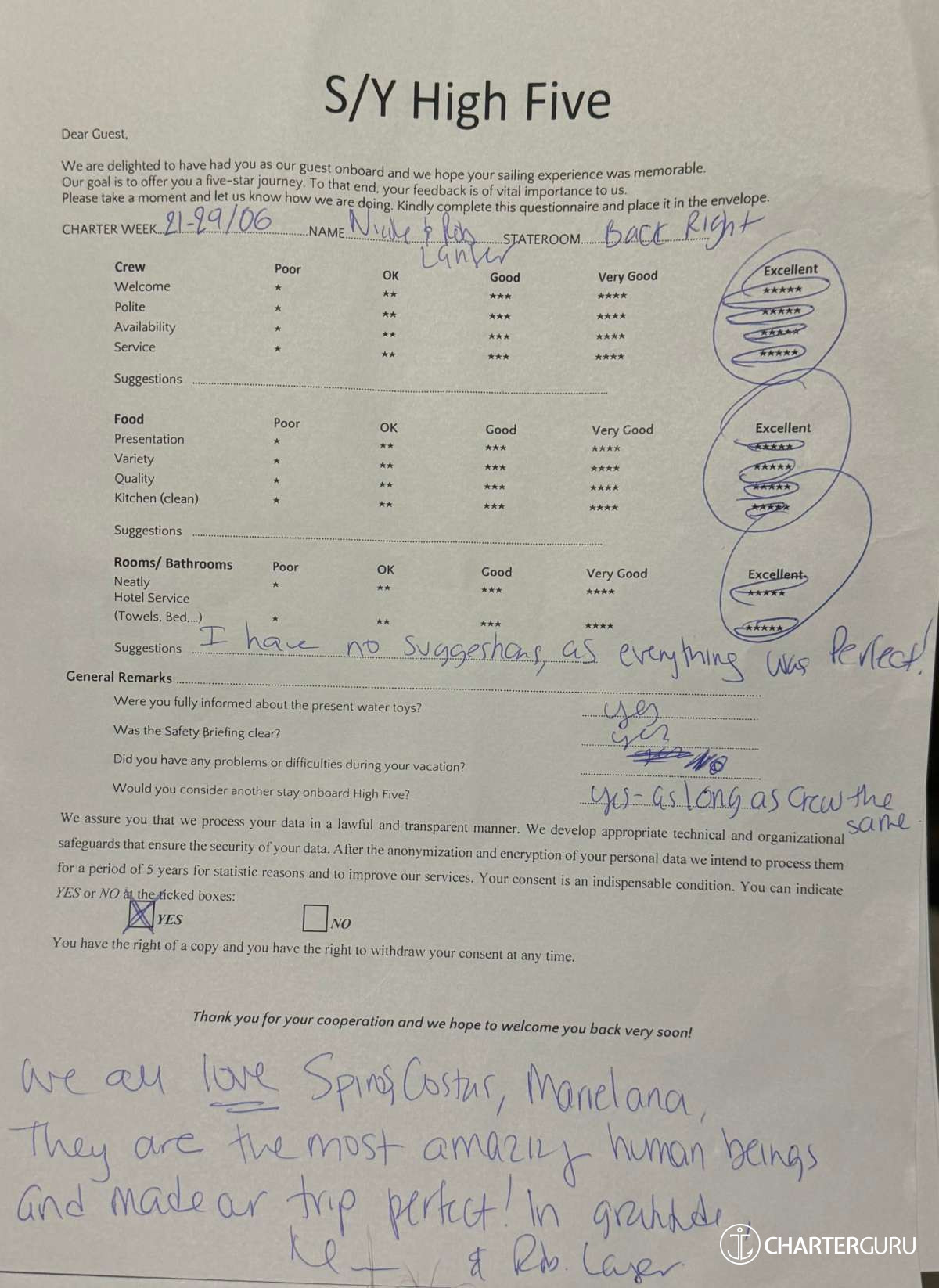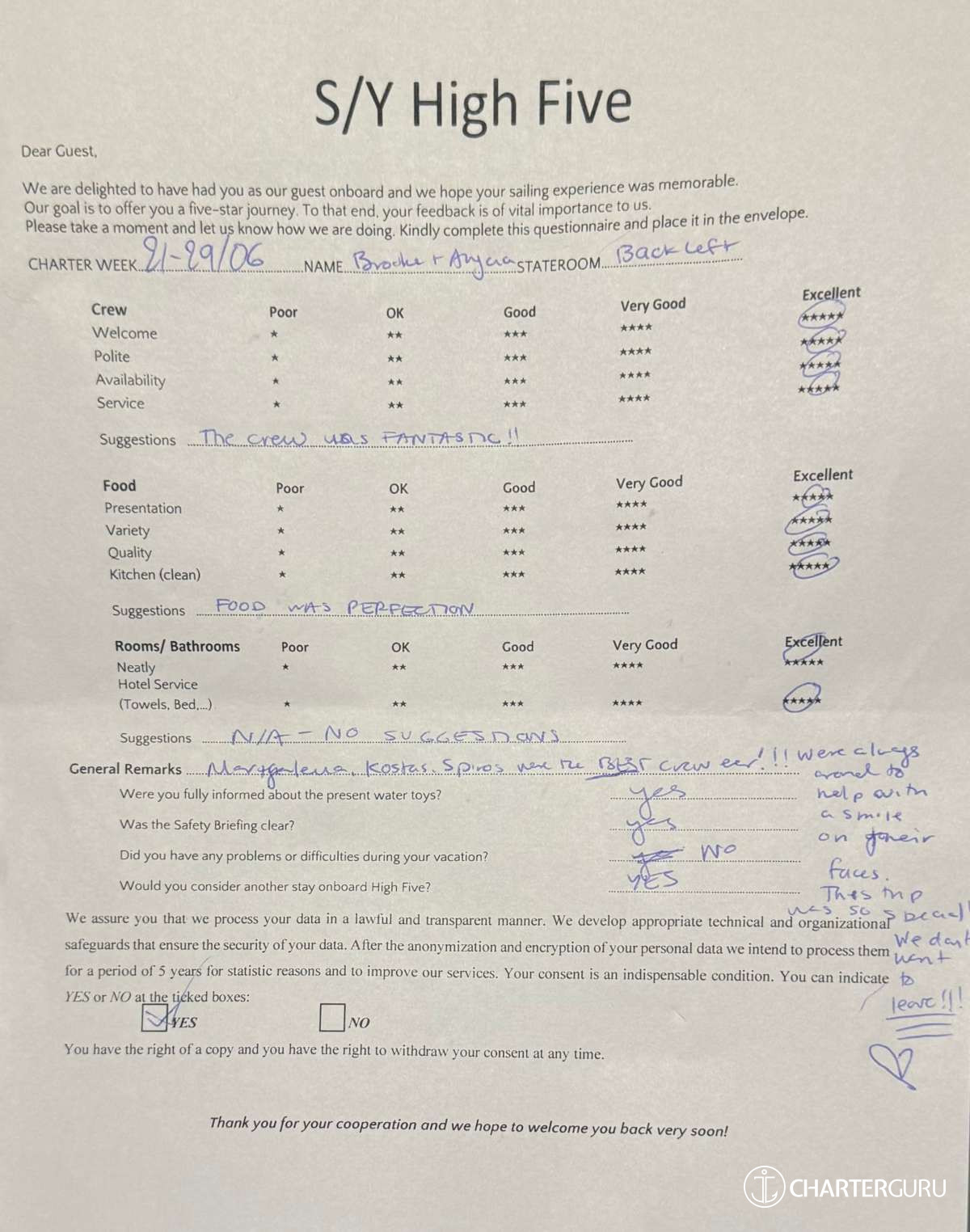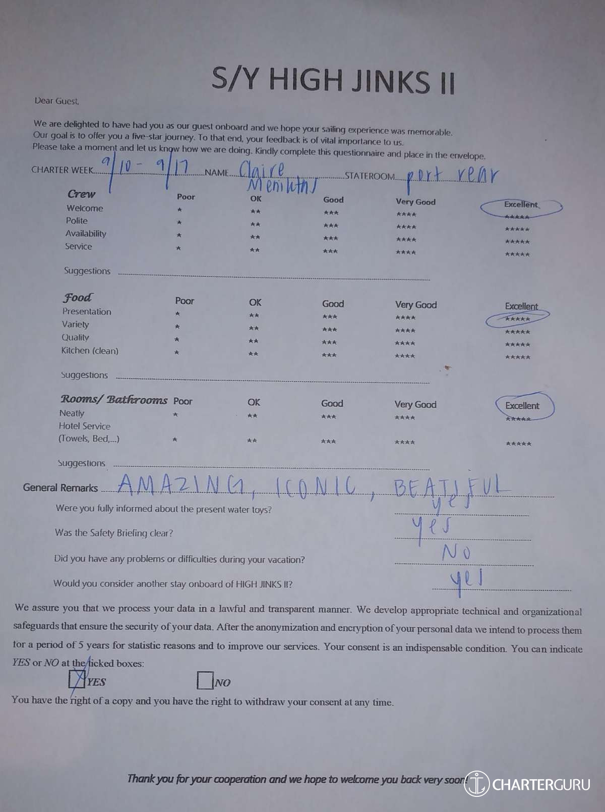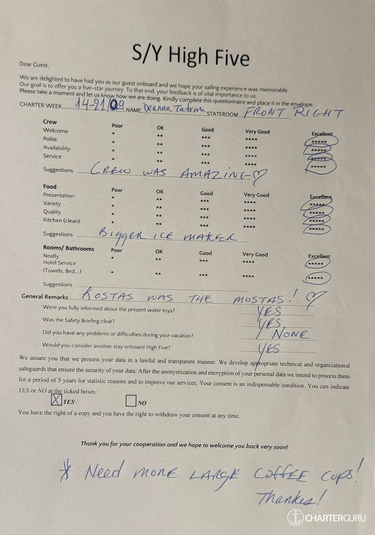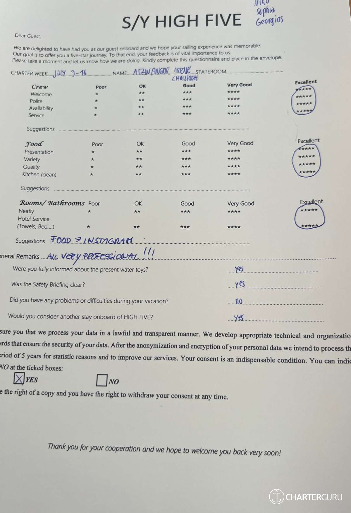 The crew were amazing. Capt Costas did a great job organizing and managing the trip. Very friendly and personable, working to make sure everything was just right. Chef Spiros was spectacular. From helping my son fishing to preparing meals that had the kids drooling. Crew Marielena worked constantly with those little touches to make everyone perfect.