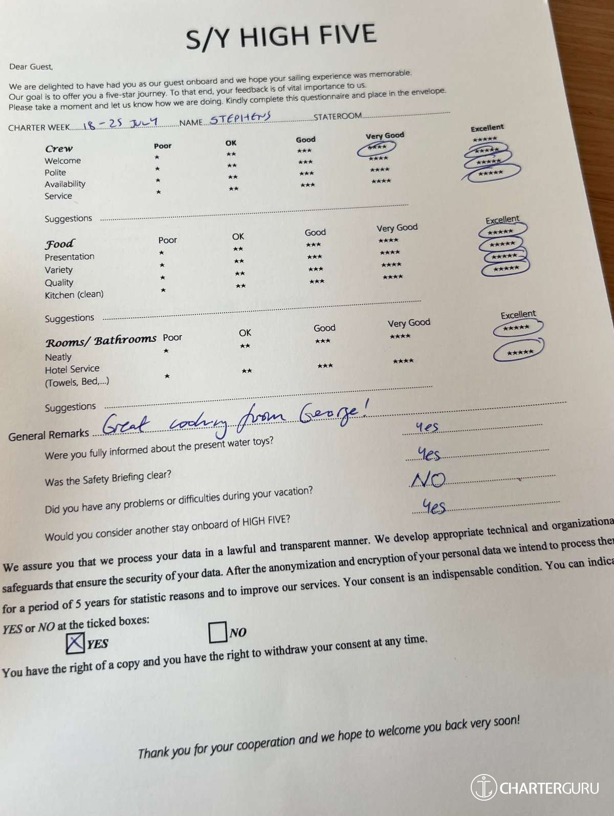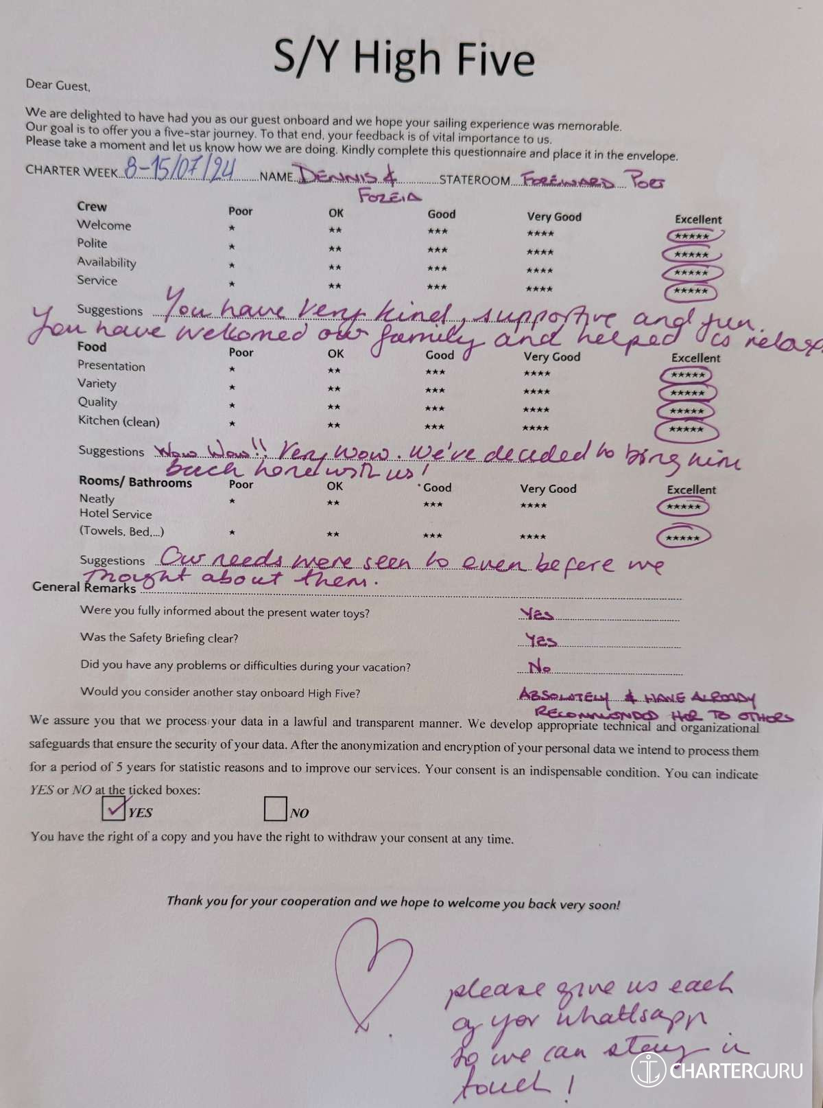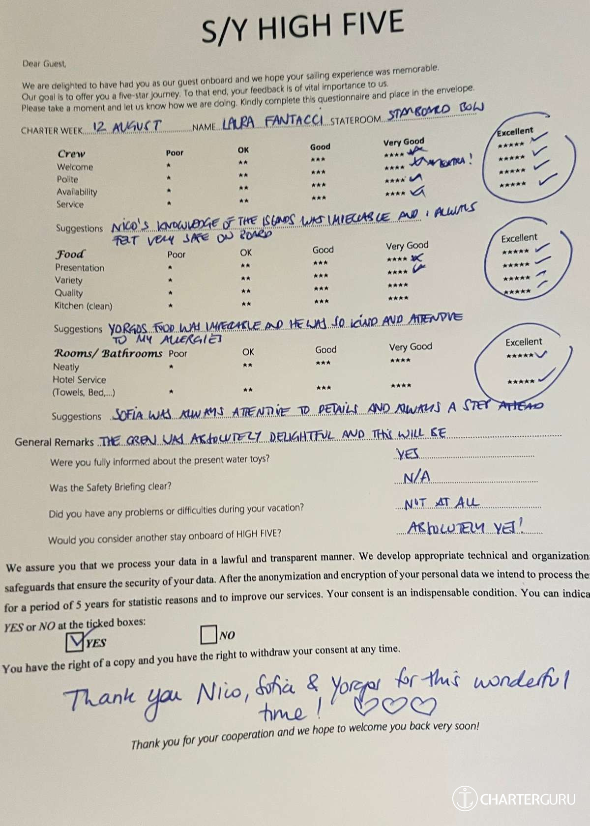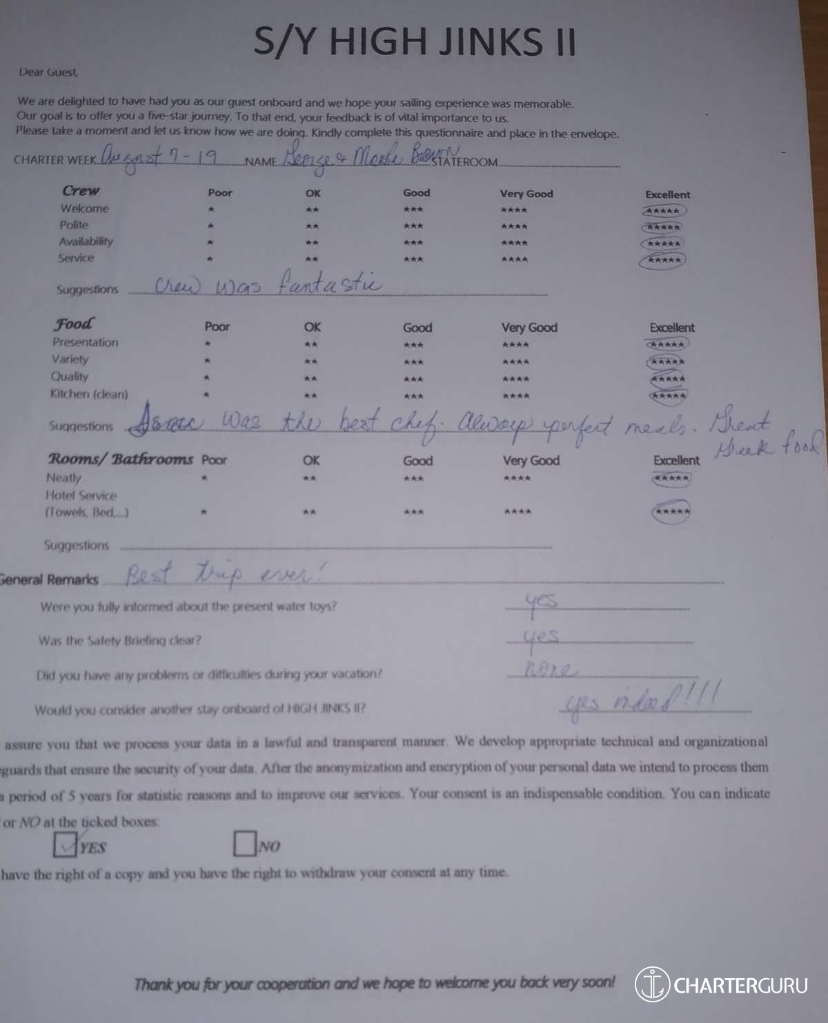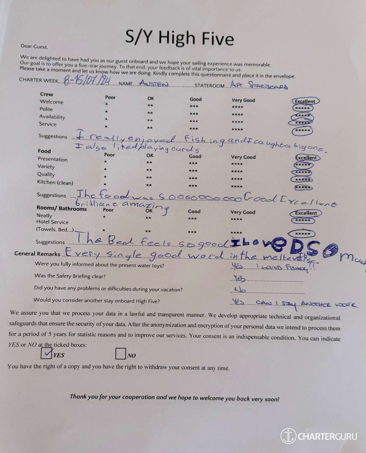 The crew were amazing. Capt Costas did a great job organizing and managing the trip. Very friendly and personable, working to make sure everything was just right. Chef Spiros was spectacular. From helping my son fishing to preparing meals that had the kids drooling. Crew Marielena worked constantly with those little touches to make everyone perfect.