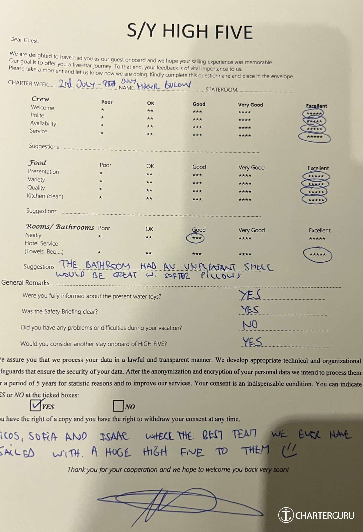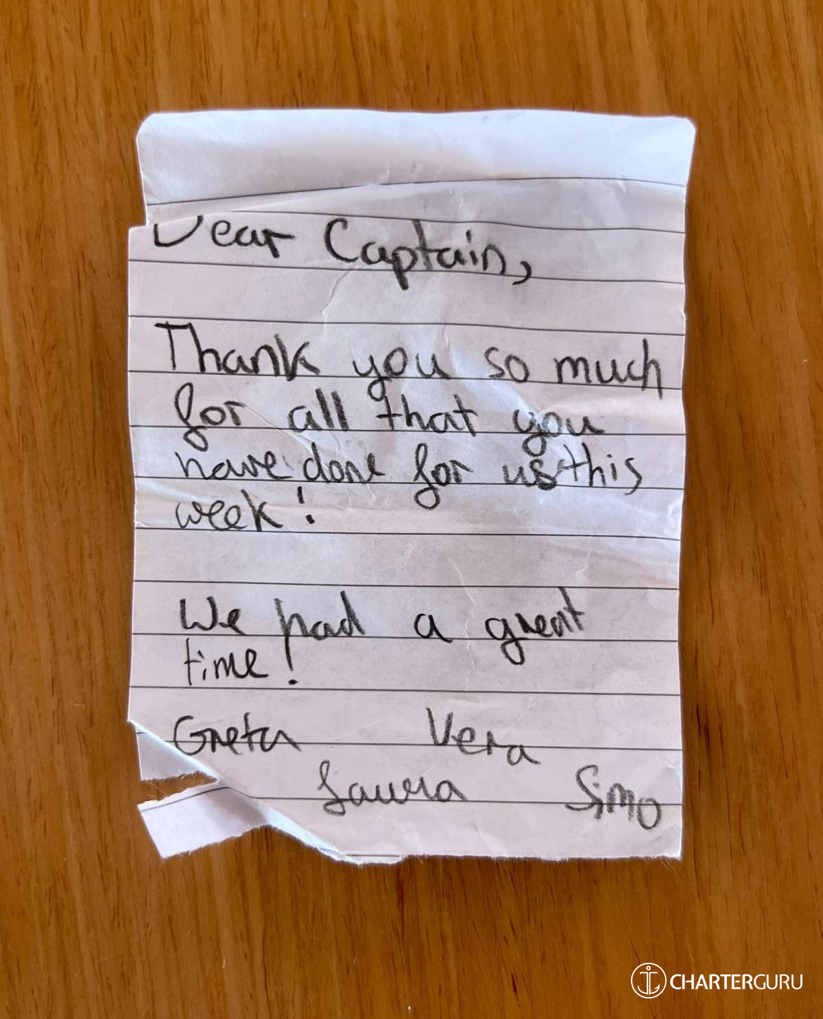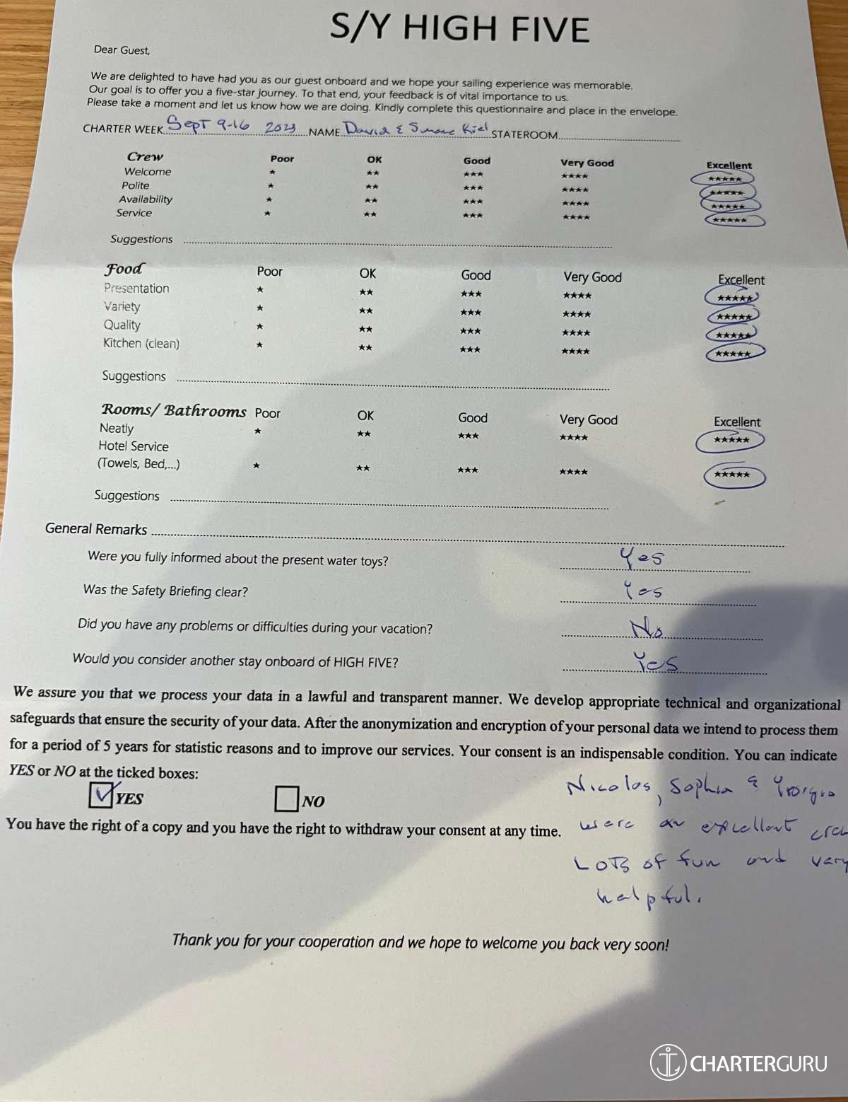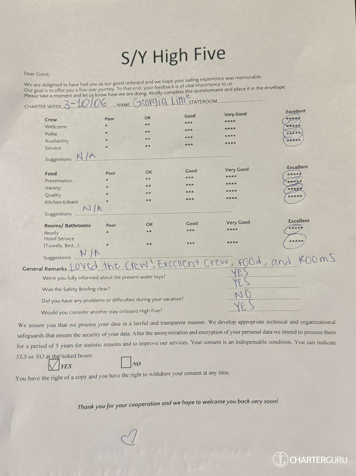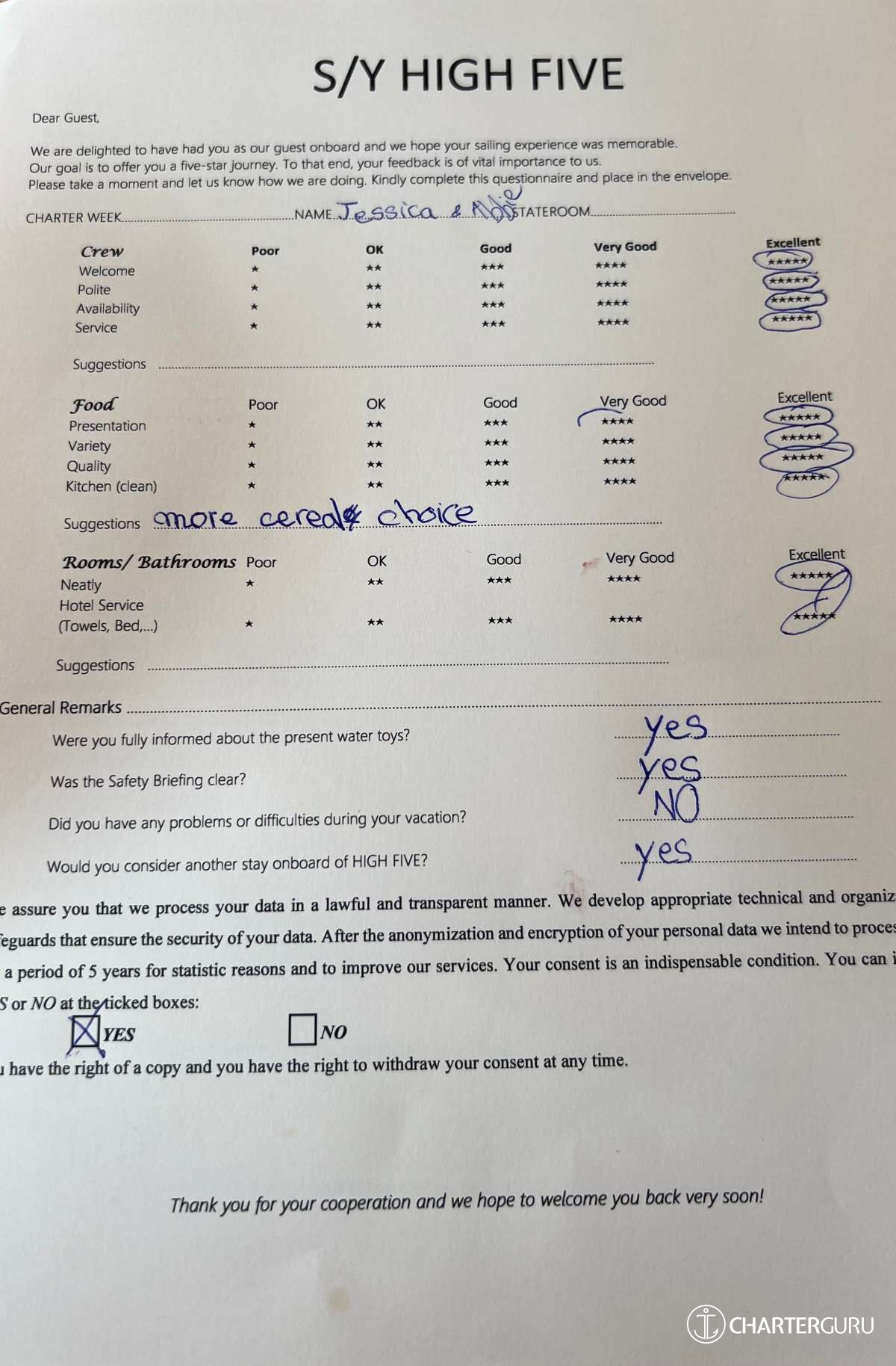 The crew were amazing. Capt Costas did a great job organizing and managing the trip. Very friendly and personable, working to make sure everything was just right. Chef Spiros was spectacular. From helping my son fishing to preparing meals that had the kids drooling. Crew Marielena worked constantly with those little touches to make everyone perfect.