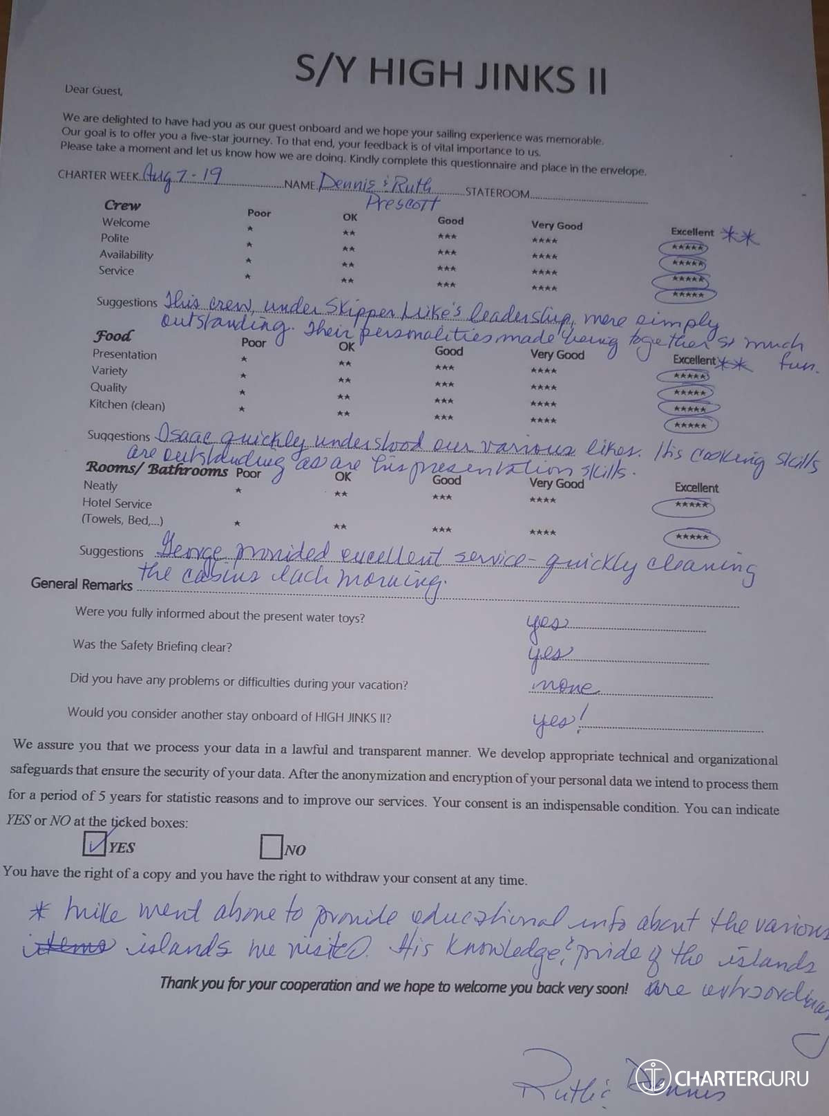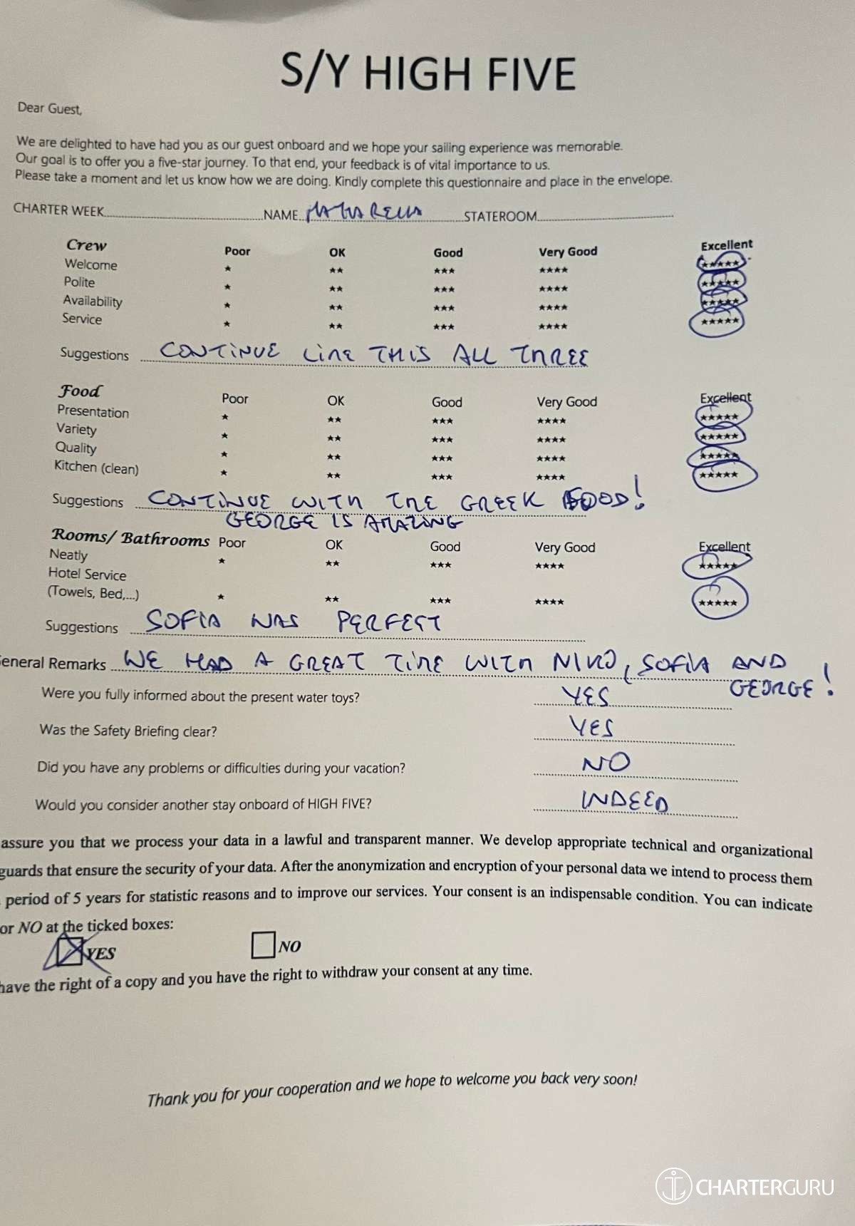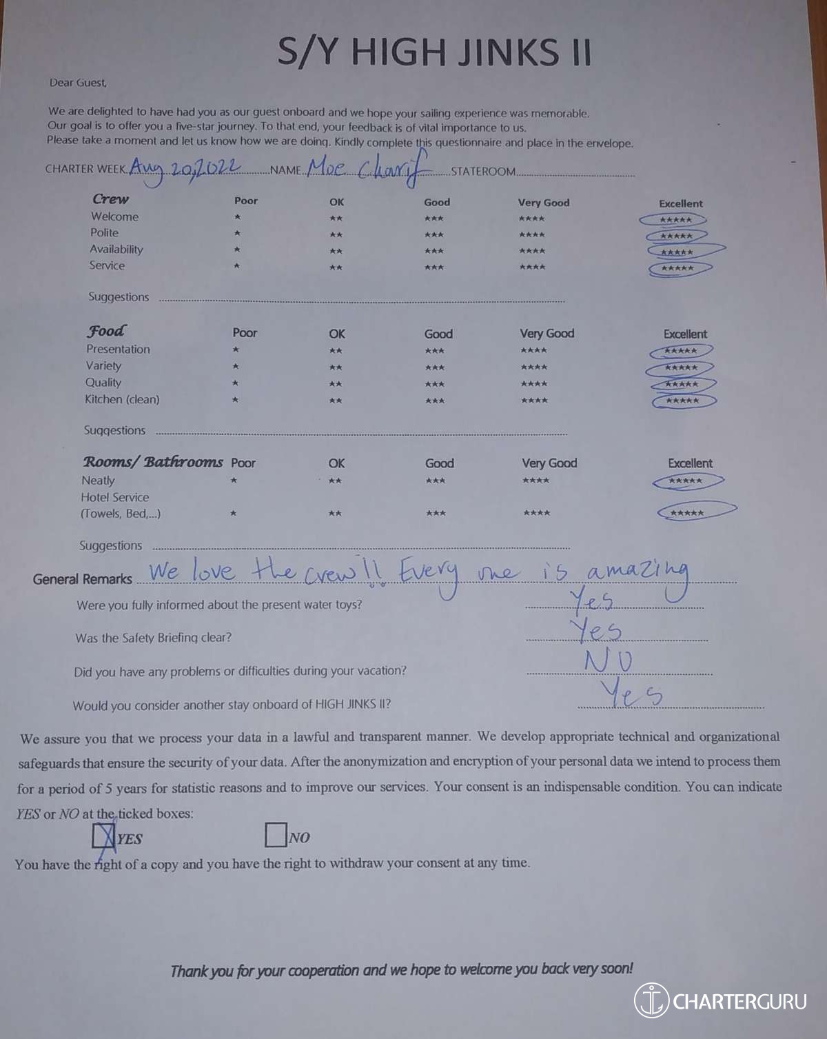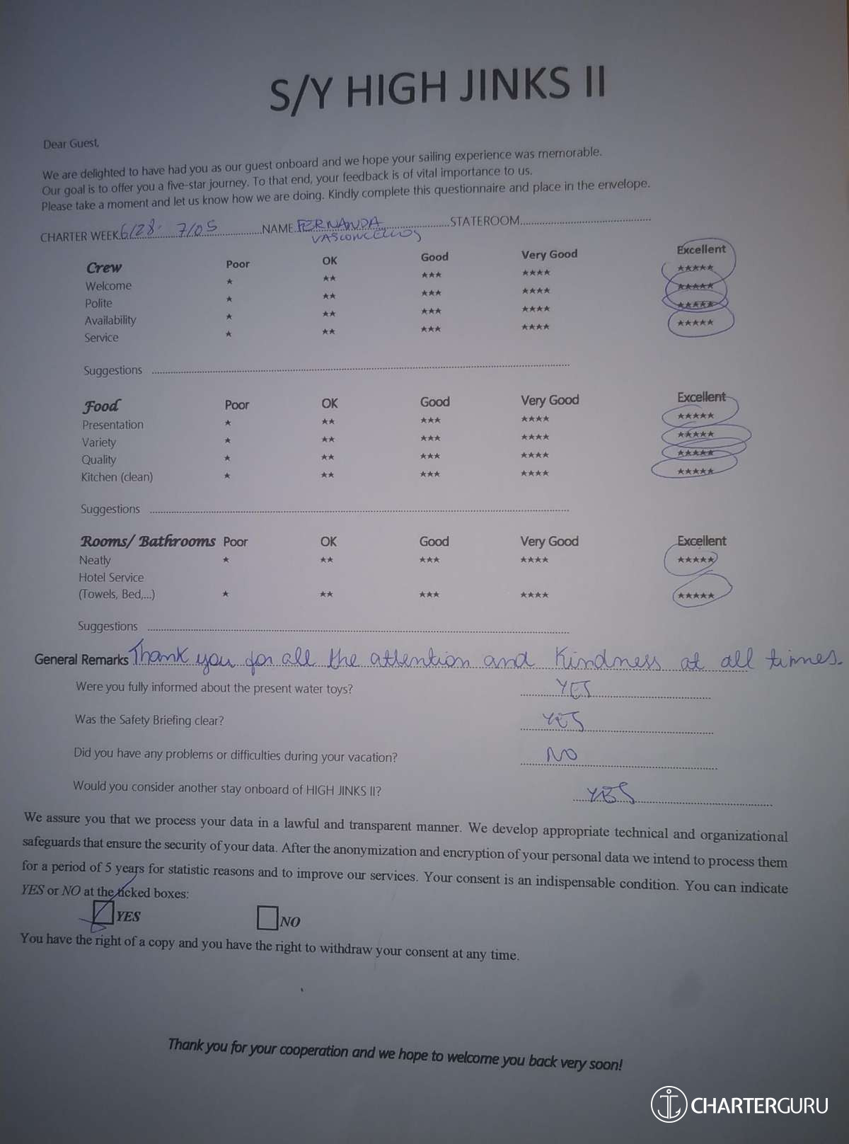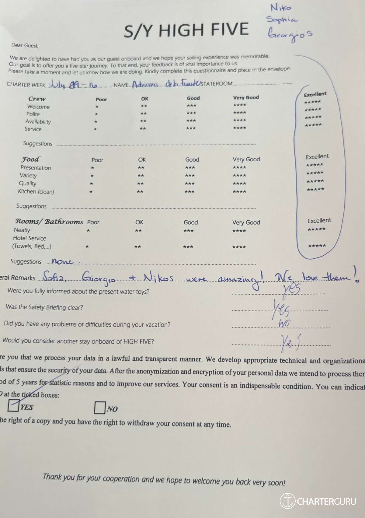 The crew were amazing. Capt Costas did a great job organizing and managing the trip. Very friendly and personable, working to make sure everything was just right. Chef Spiros was spectacular. From helping my son fishing to preparing meals that had the kids drooling. Crew Marielena worked constantly with those little touches to make everyone perfect.