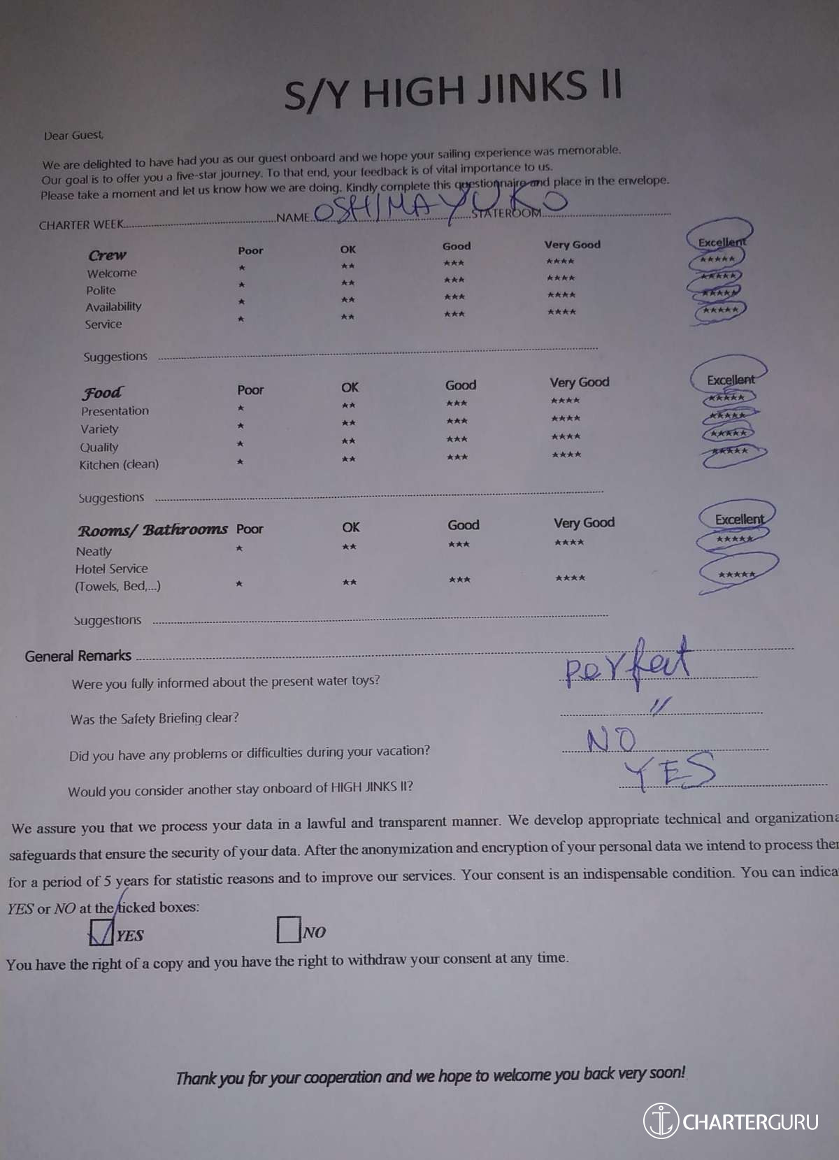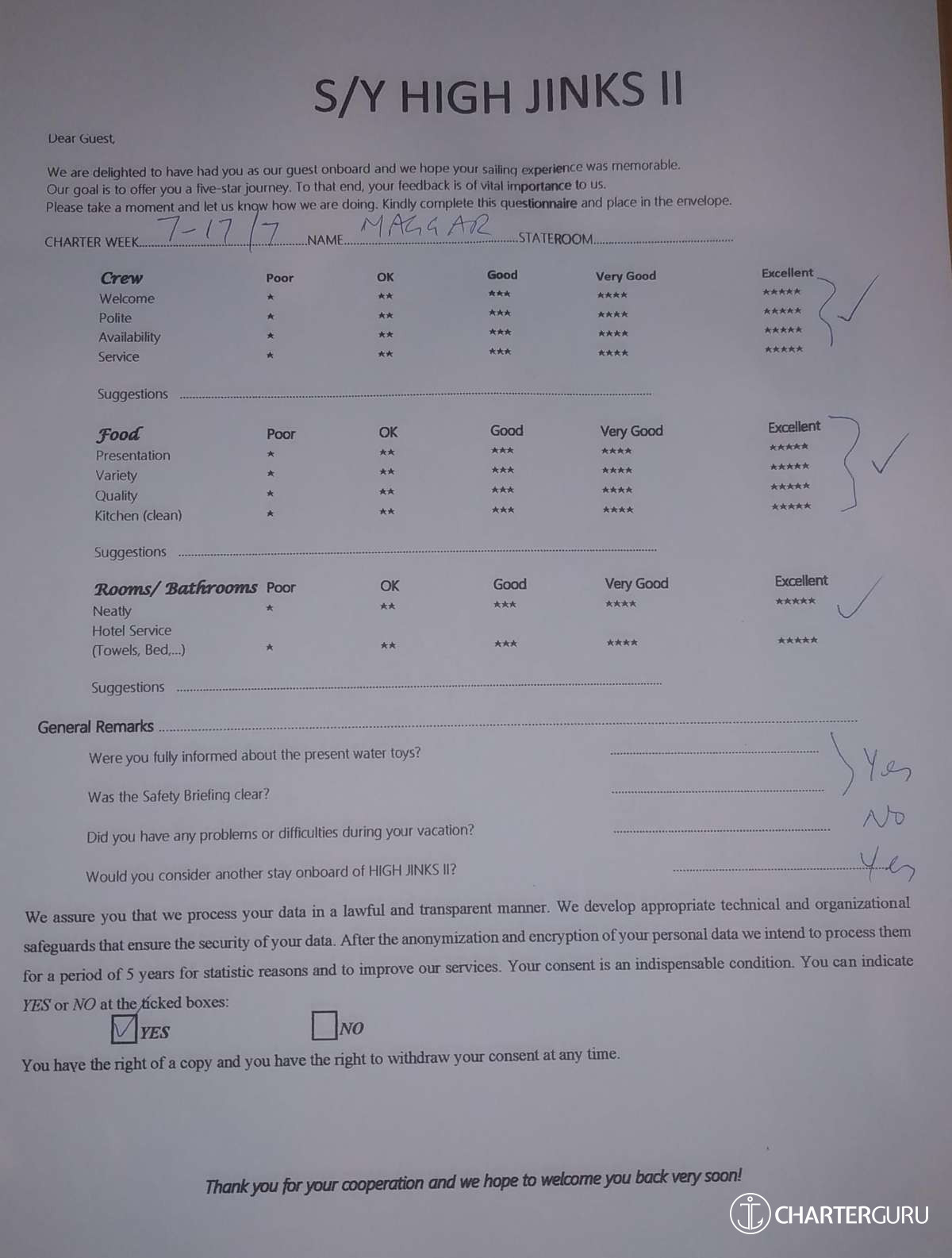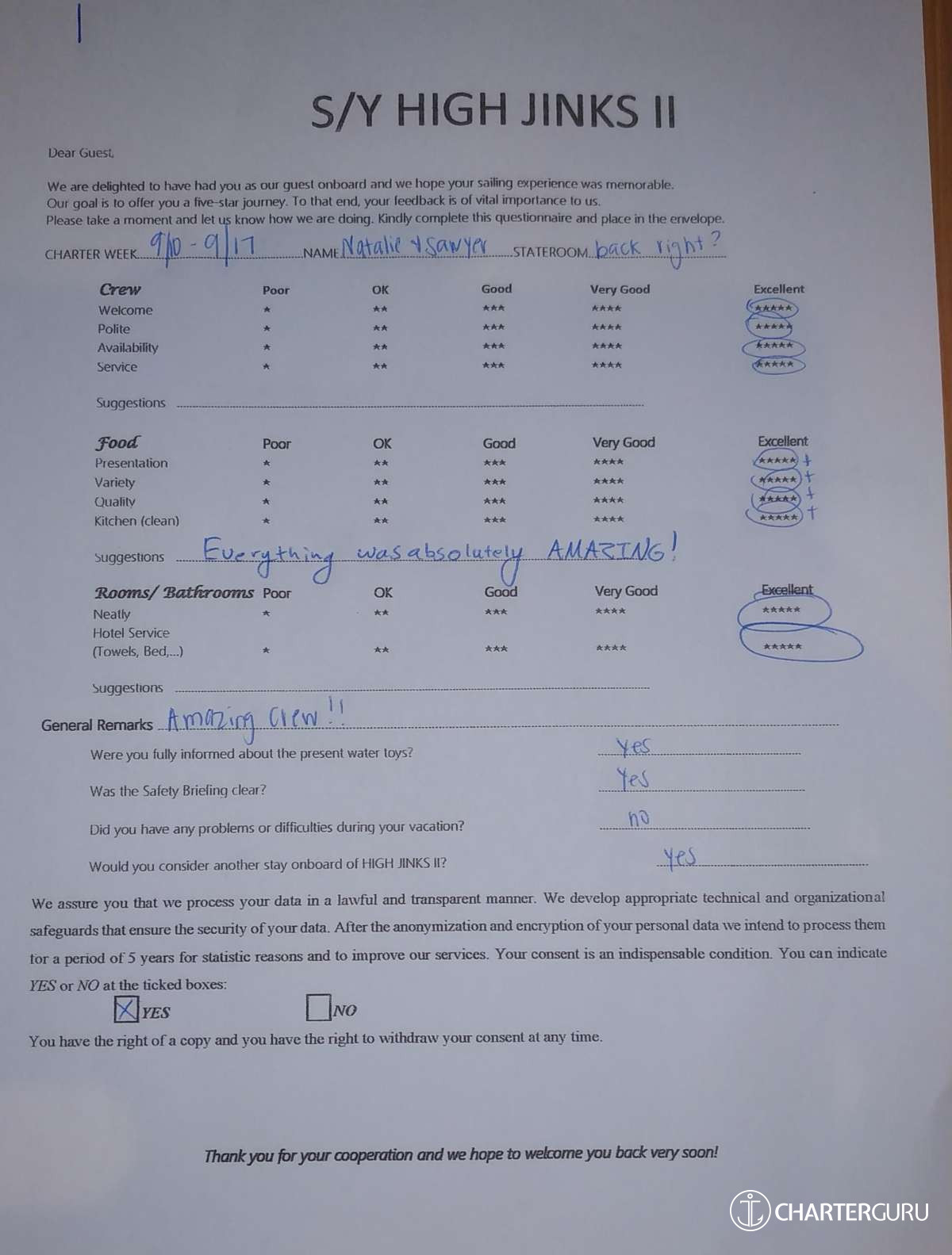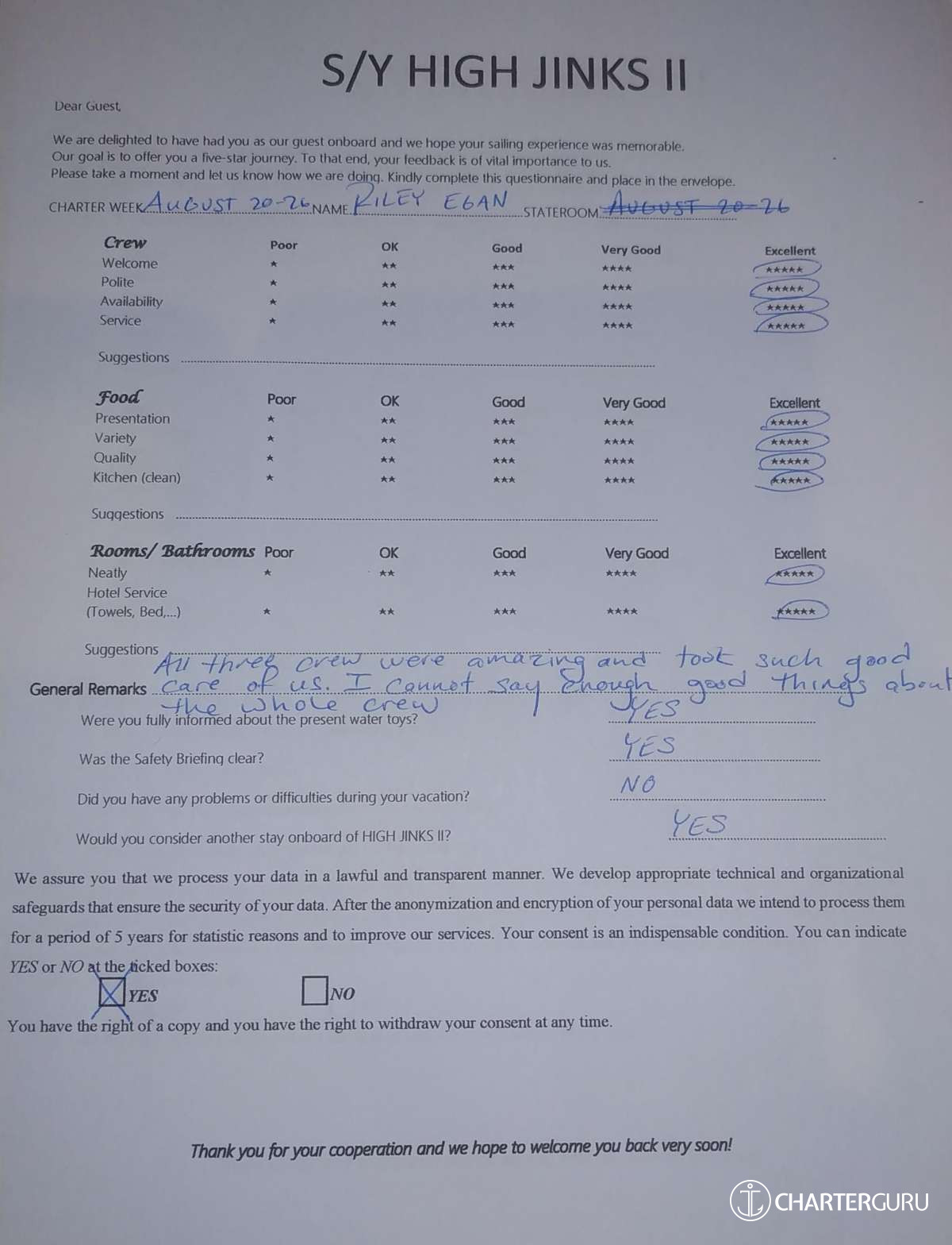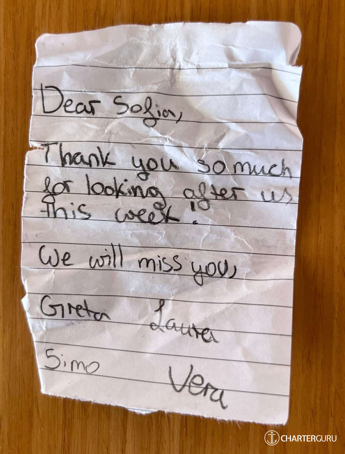 The crew were amazing. Capt Costas did a great job organizing and managing the trip. Very friendly and personable, working to make sure everything was just right. Chef Spiros was spectacular. From helping my son fishing to preparing meals that had the kids drooling. Crew Marielena worked constantly with those little touches to make everyone perfect.
