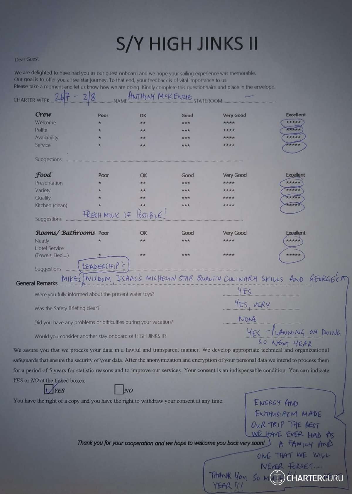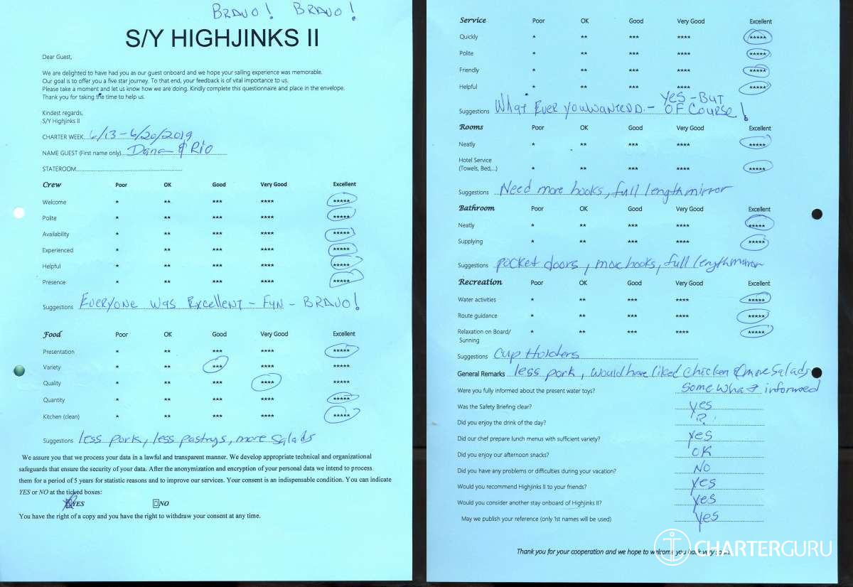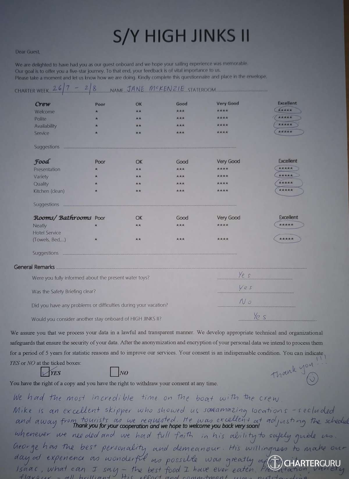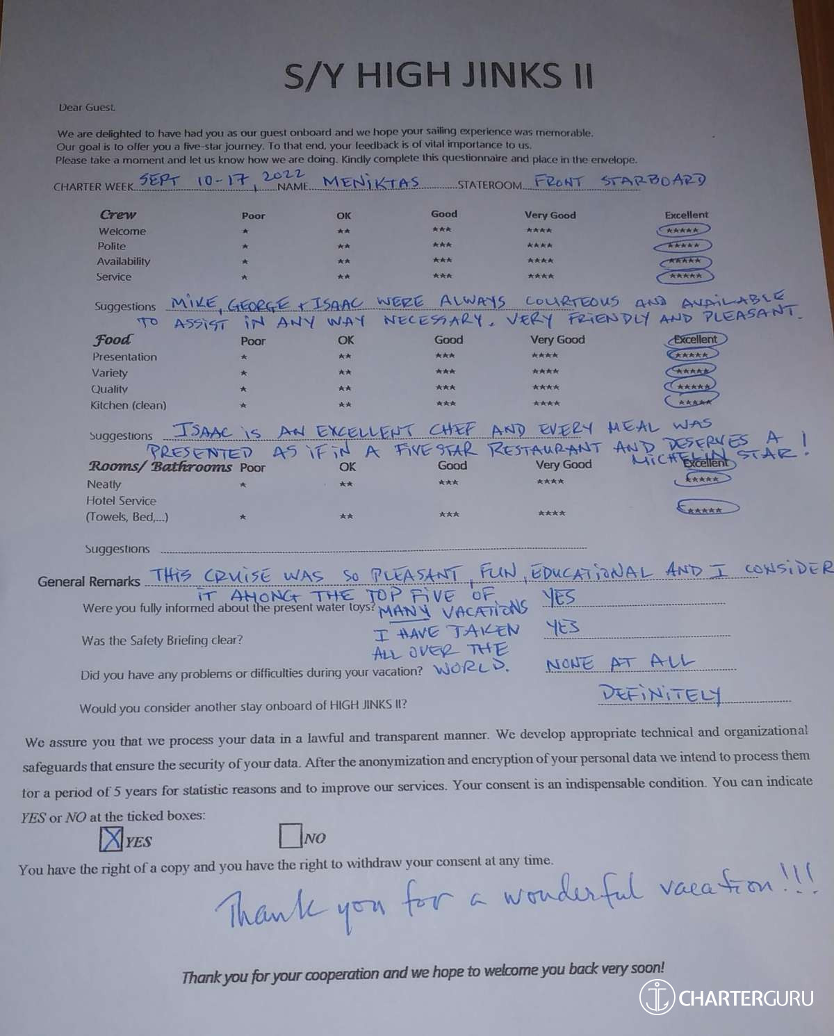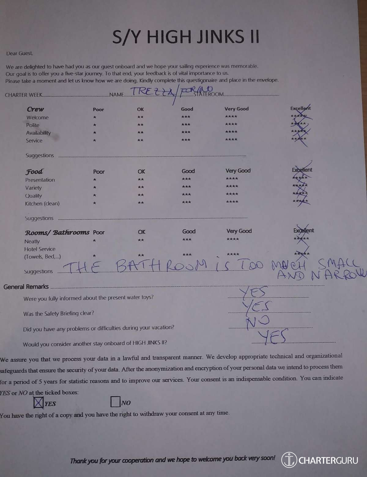 The crew were amazing. Capt Costas did a great job organizing and managing the trip. Very friendly and personable, working to make sure everything was just right. Chef Spiros was spectacular. From helping my son fishing to preparing meals that had the kids drooling. Crew Marielena worked constantly with those little touches to make everyone perfect.