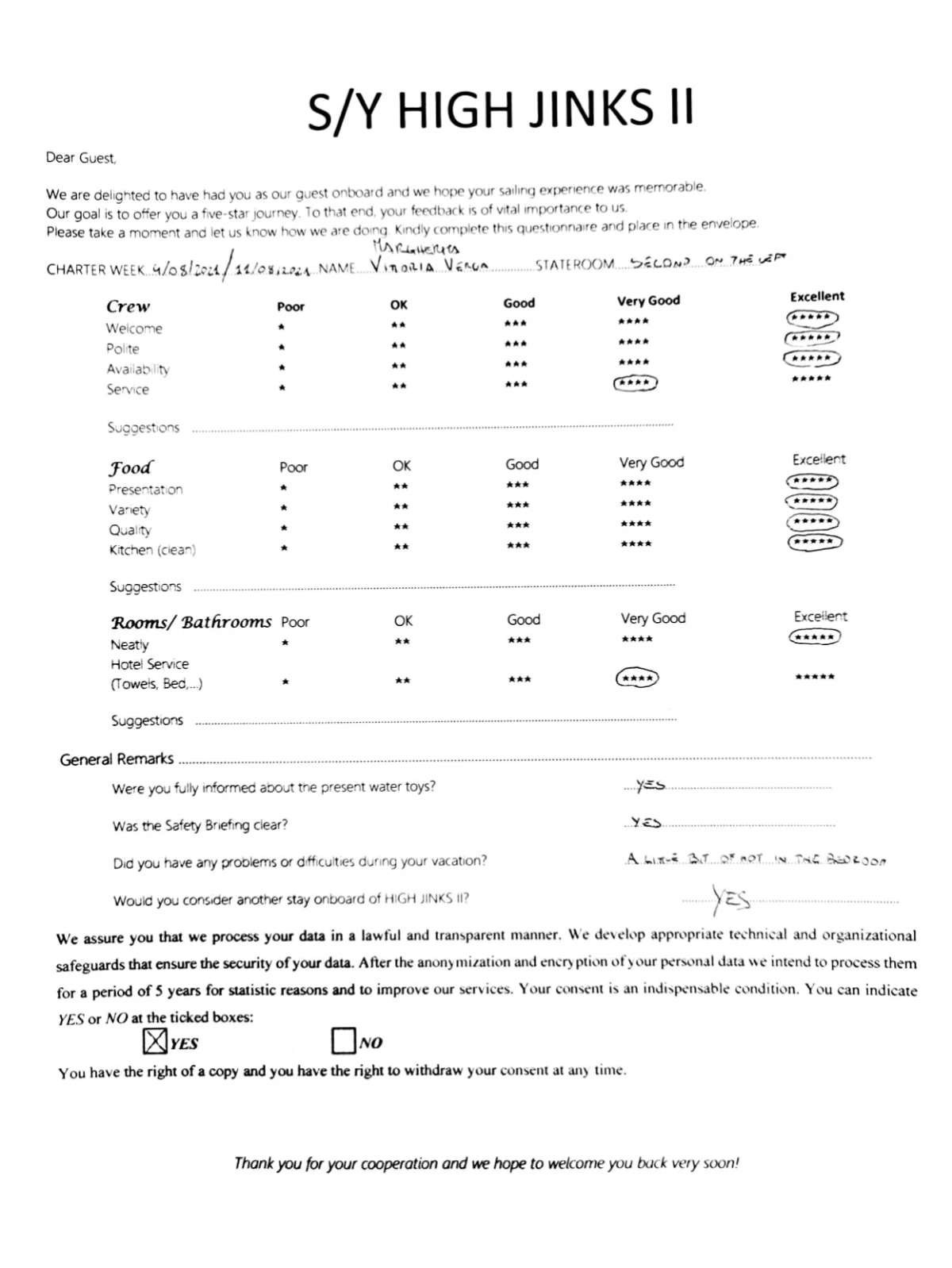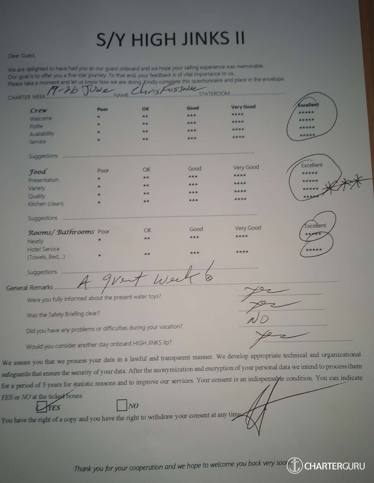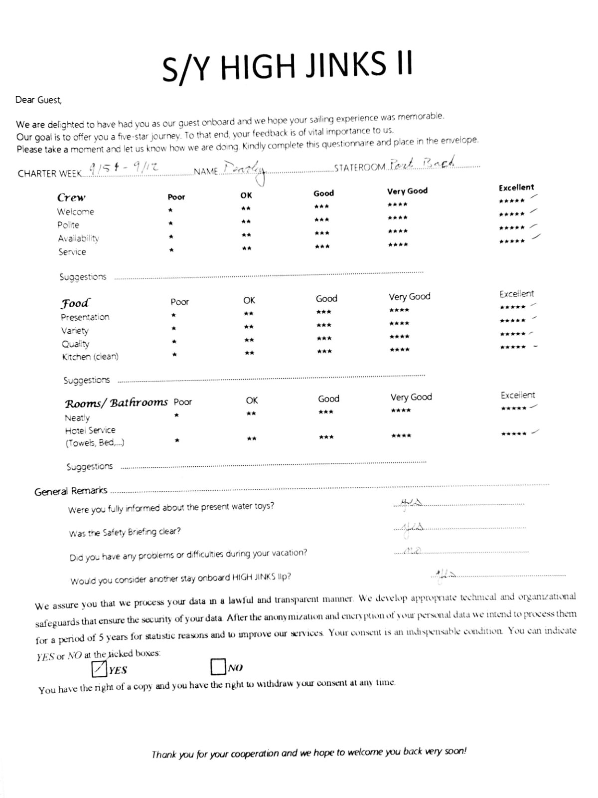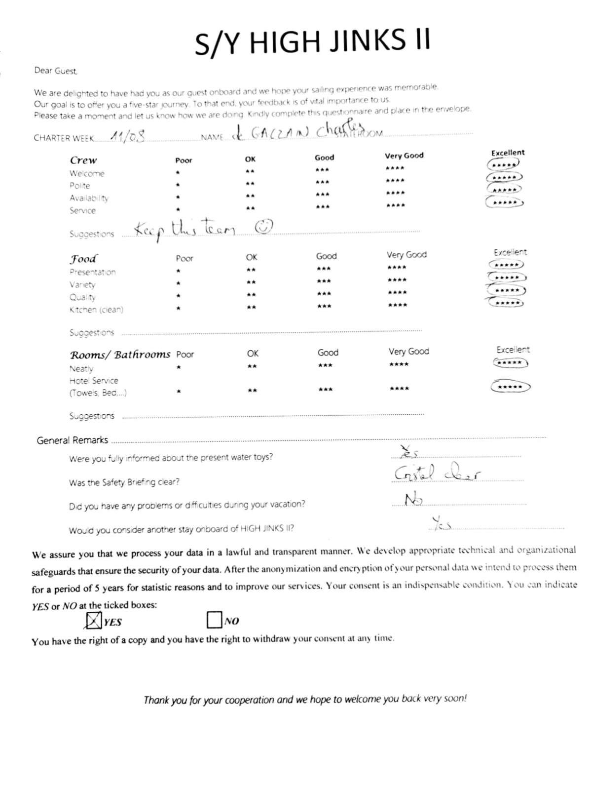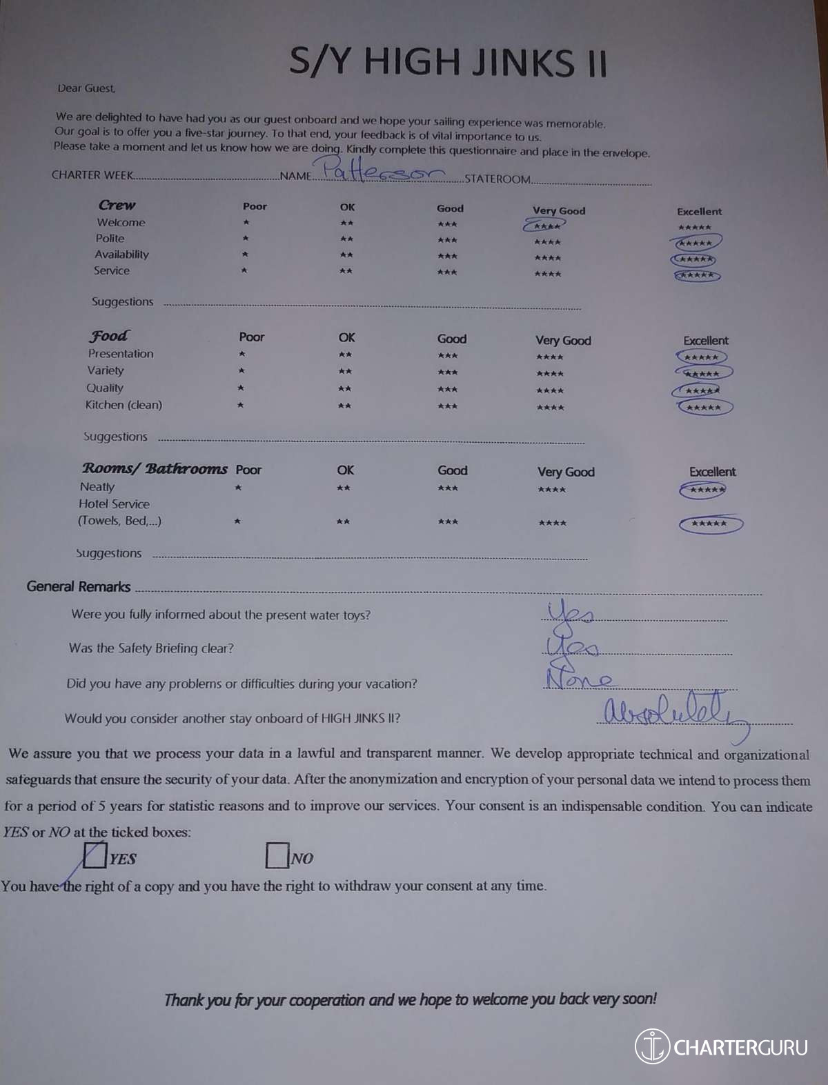 The crew were amazing. Capt Costas did a great job organizing and managing the trip. Very friendly and personable, working to make sure everything was just right. Chef Spiros was spectacular. From helping my son fishing to preparing meals that had the kids drooling. Crew Marielena worked constantly with those little touches to make everyone perfect.