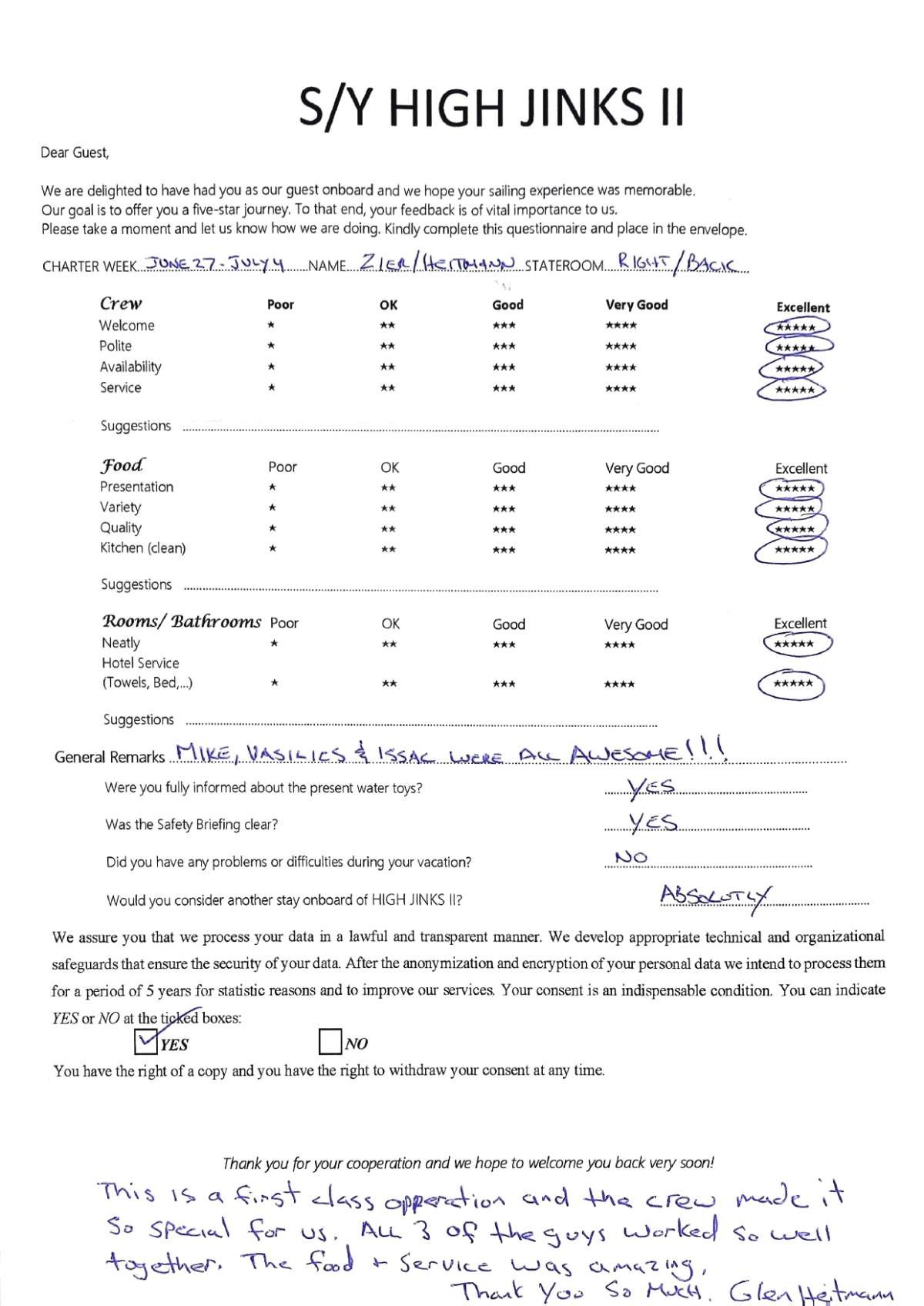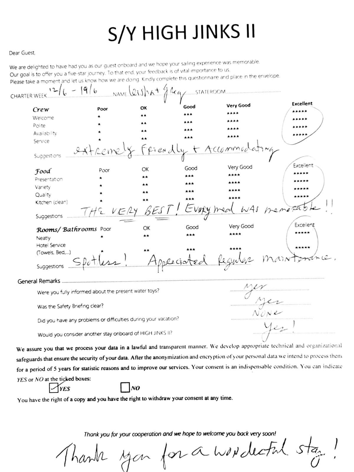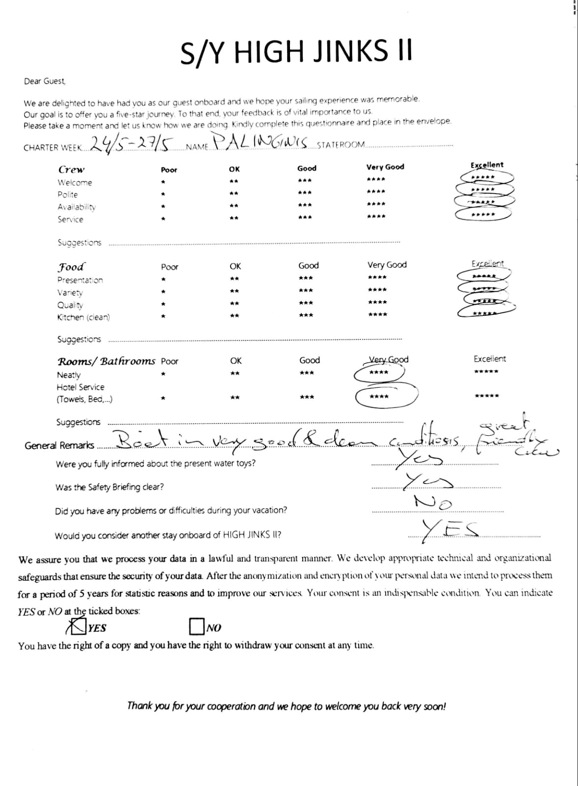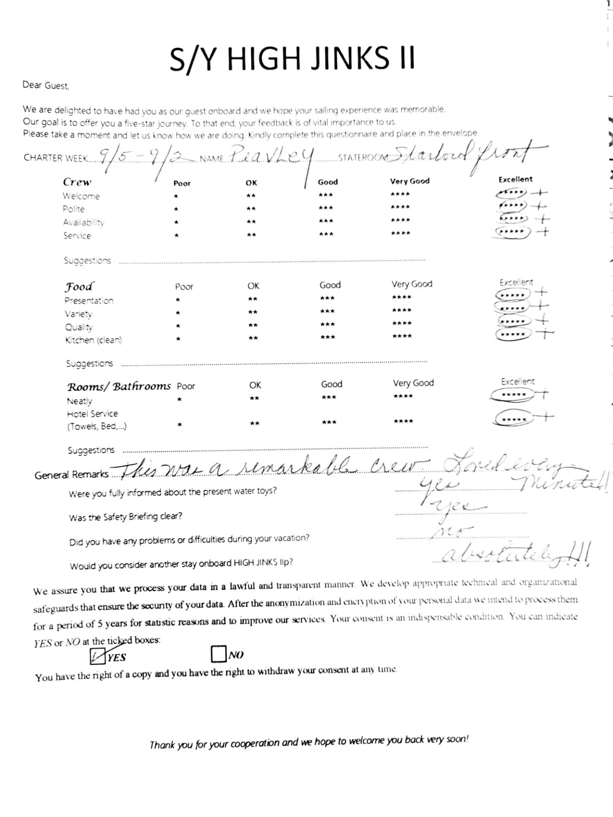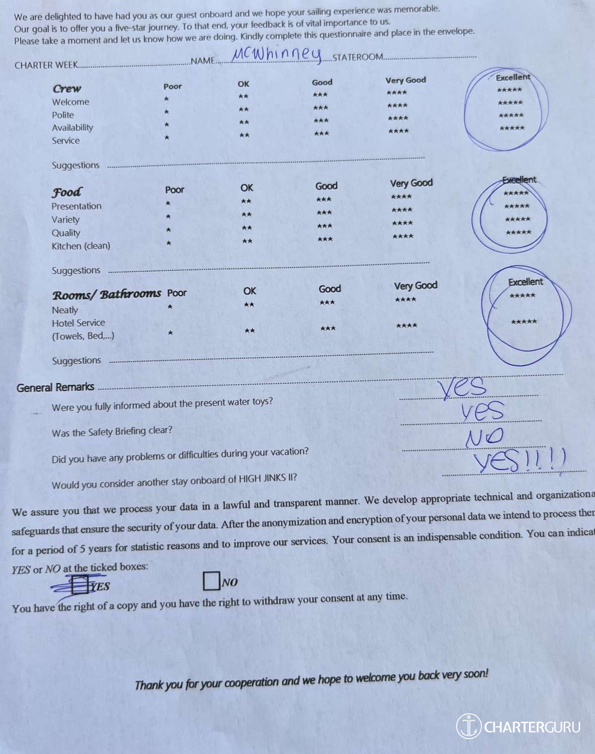 The crew were amazing. Capt Costas did a great job organizing and managing the trip. Very friendly and personable, working to make sure everything was just right. Chef Spiros was spectacular. From helping my son fishing to preparing meals that had the kids drooling. Crew Marielena worked constantly with those little touches to make everyone perfect.