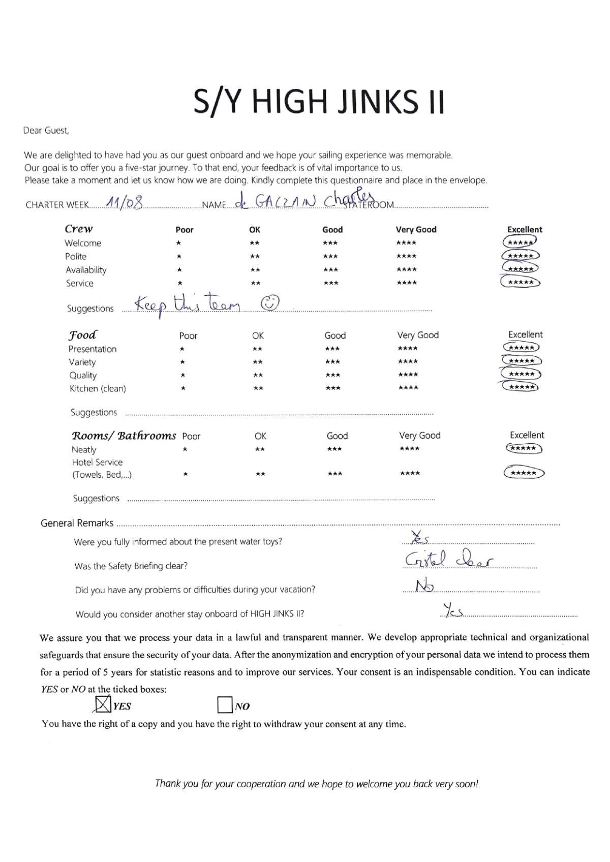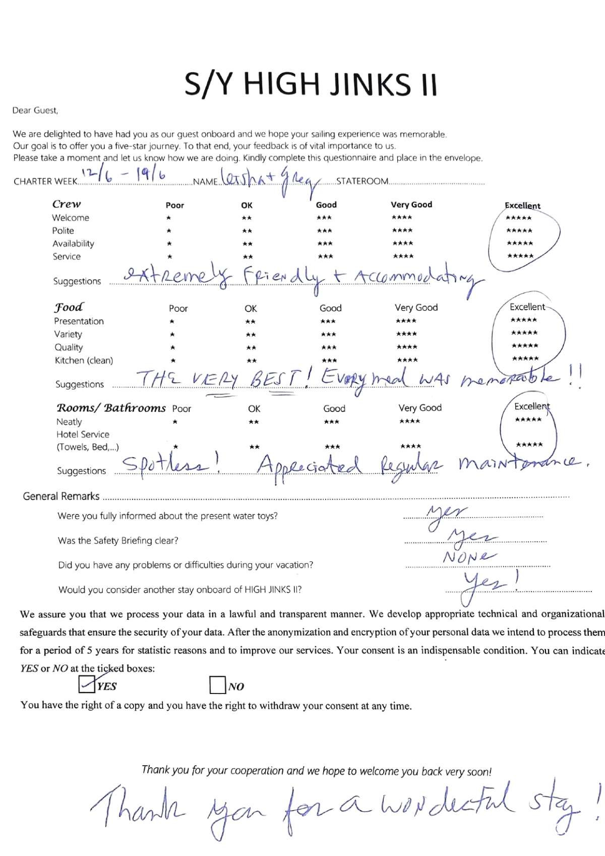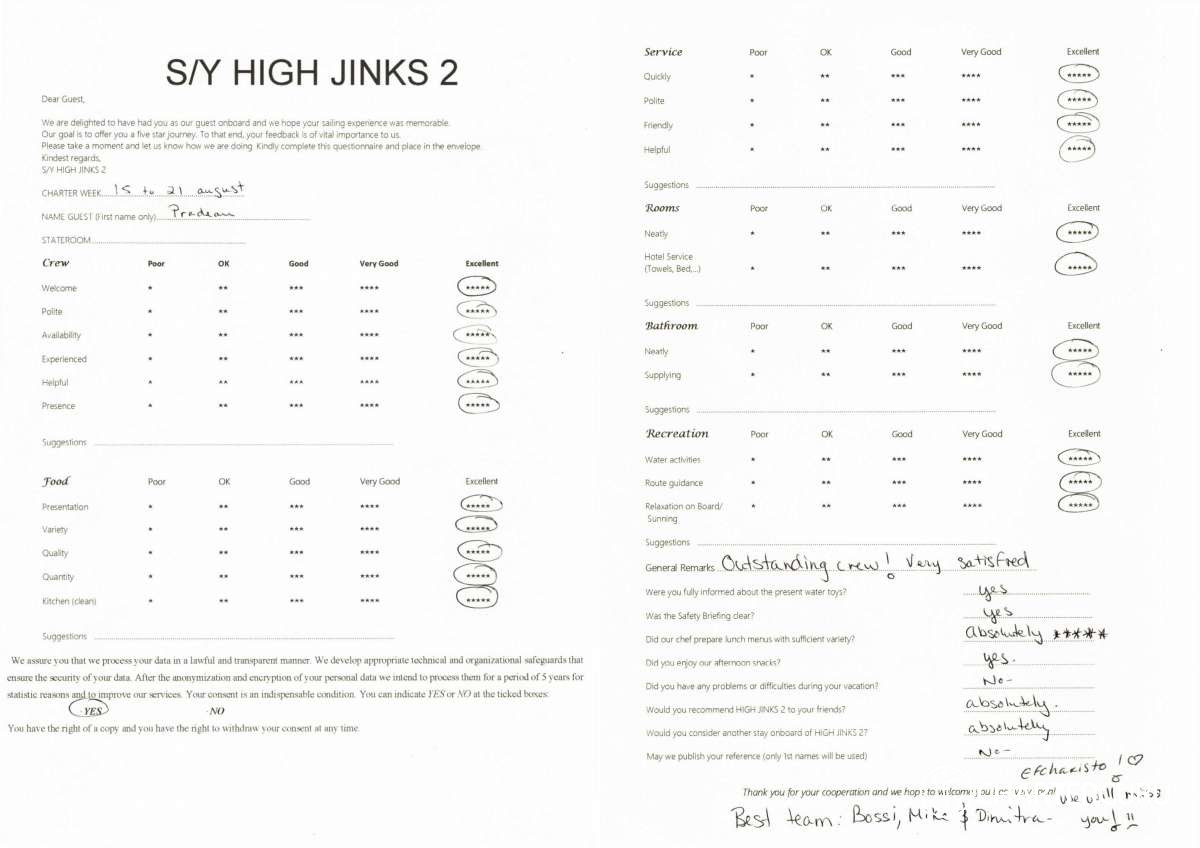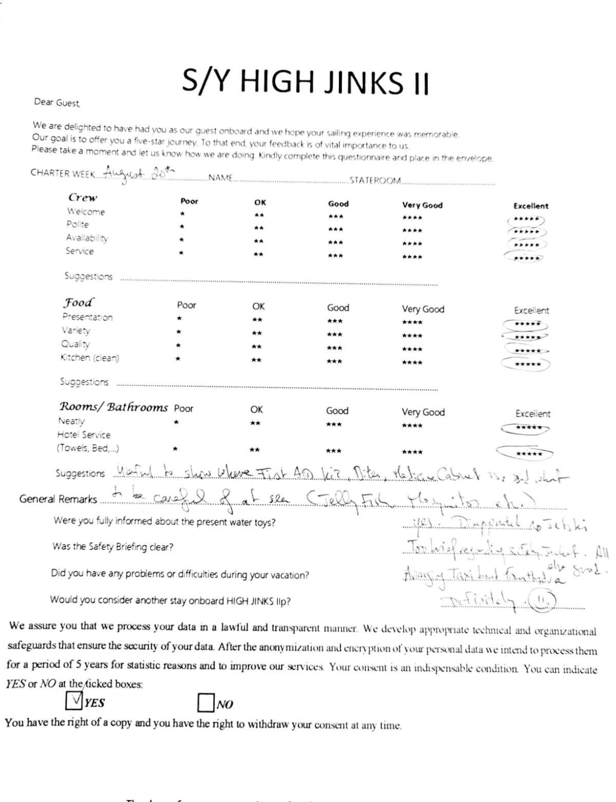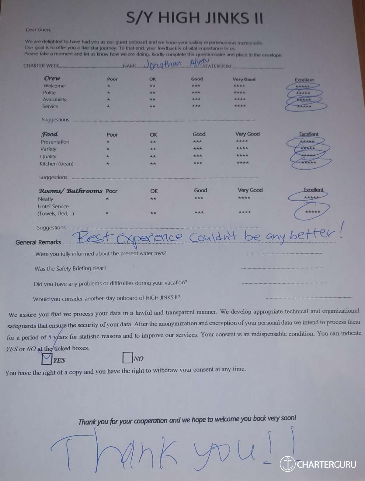 The crew were amazing. Capt Costas did a great job organizing and managing the trip. Very friendly and personable, working to make sure everything was just right. Chef Spiros was spectacular. From helping my son fishing to preparing meals that had the kids drooling. Crew Marielena worked constantly with those little touches to make everyone perfect.