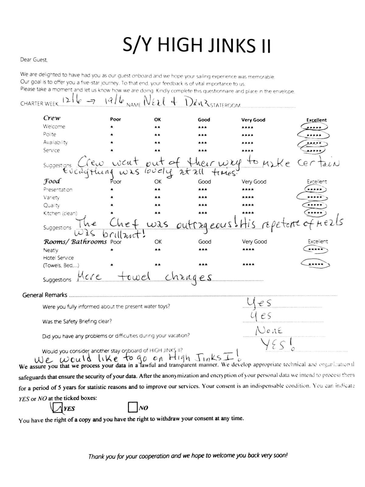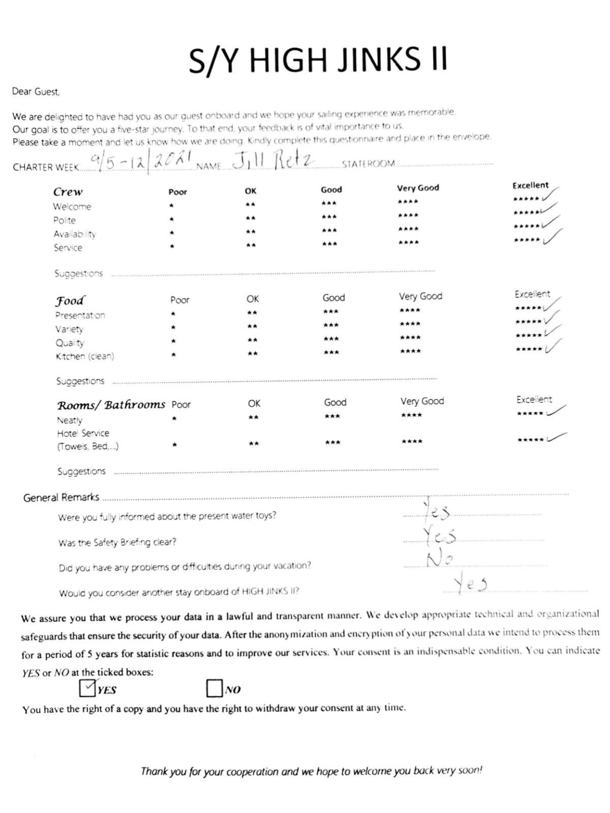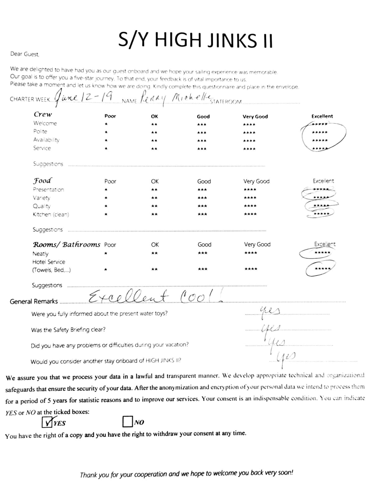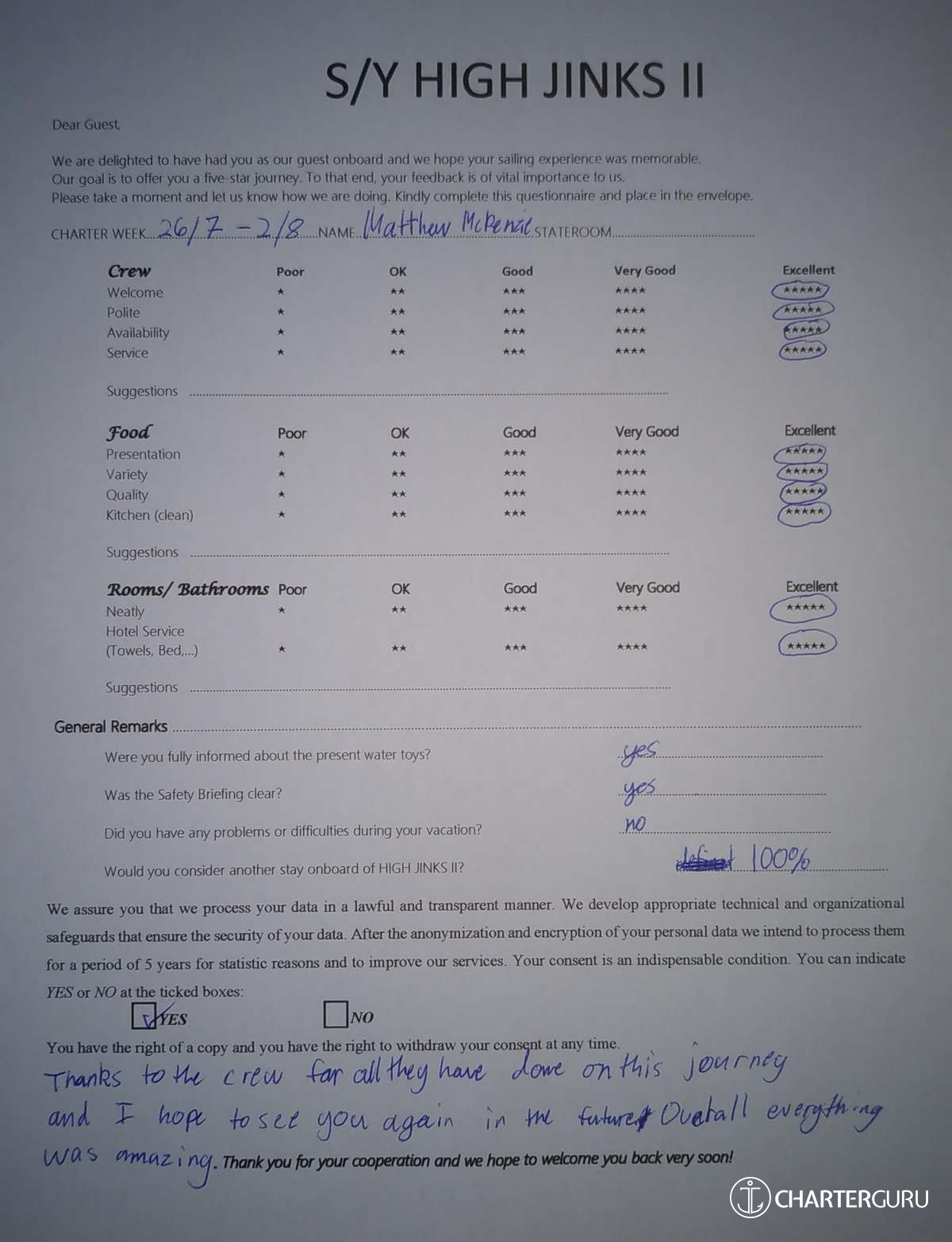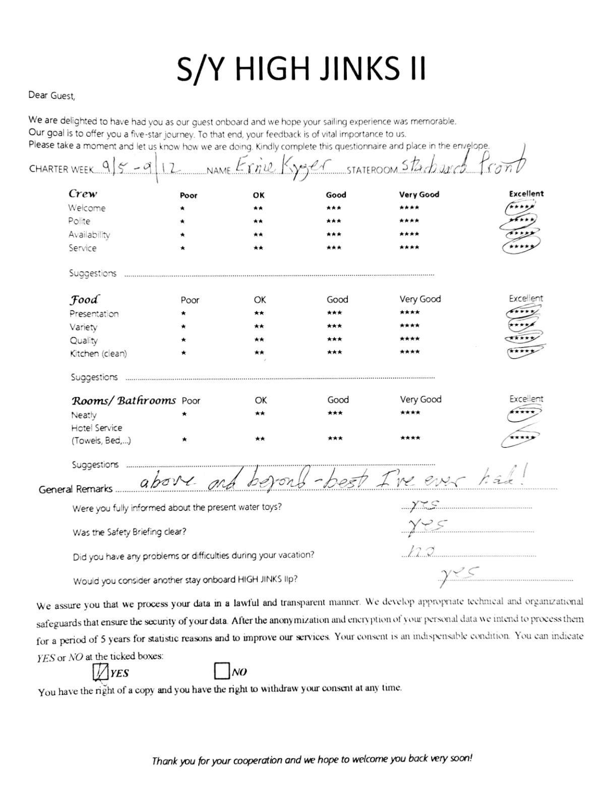 The crew were amazing. Capt Costas did a great job organizing and managing the trip. Very friendly and personable, working to make sure everything was just right. Chef Spiros was spectacular. From helping my son fishing to preparing meals that had the kids drooling. Crew Marielena worked constantly with those little touches to make everyone perfect.