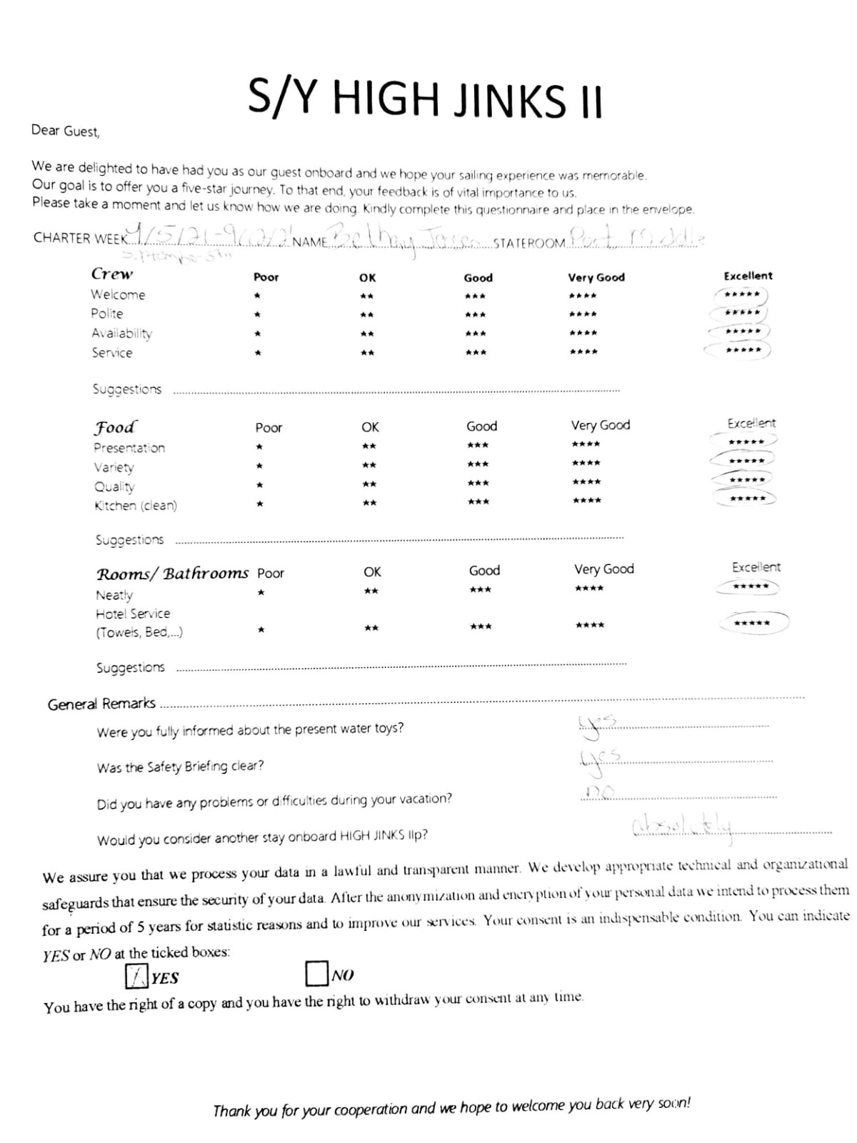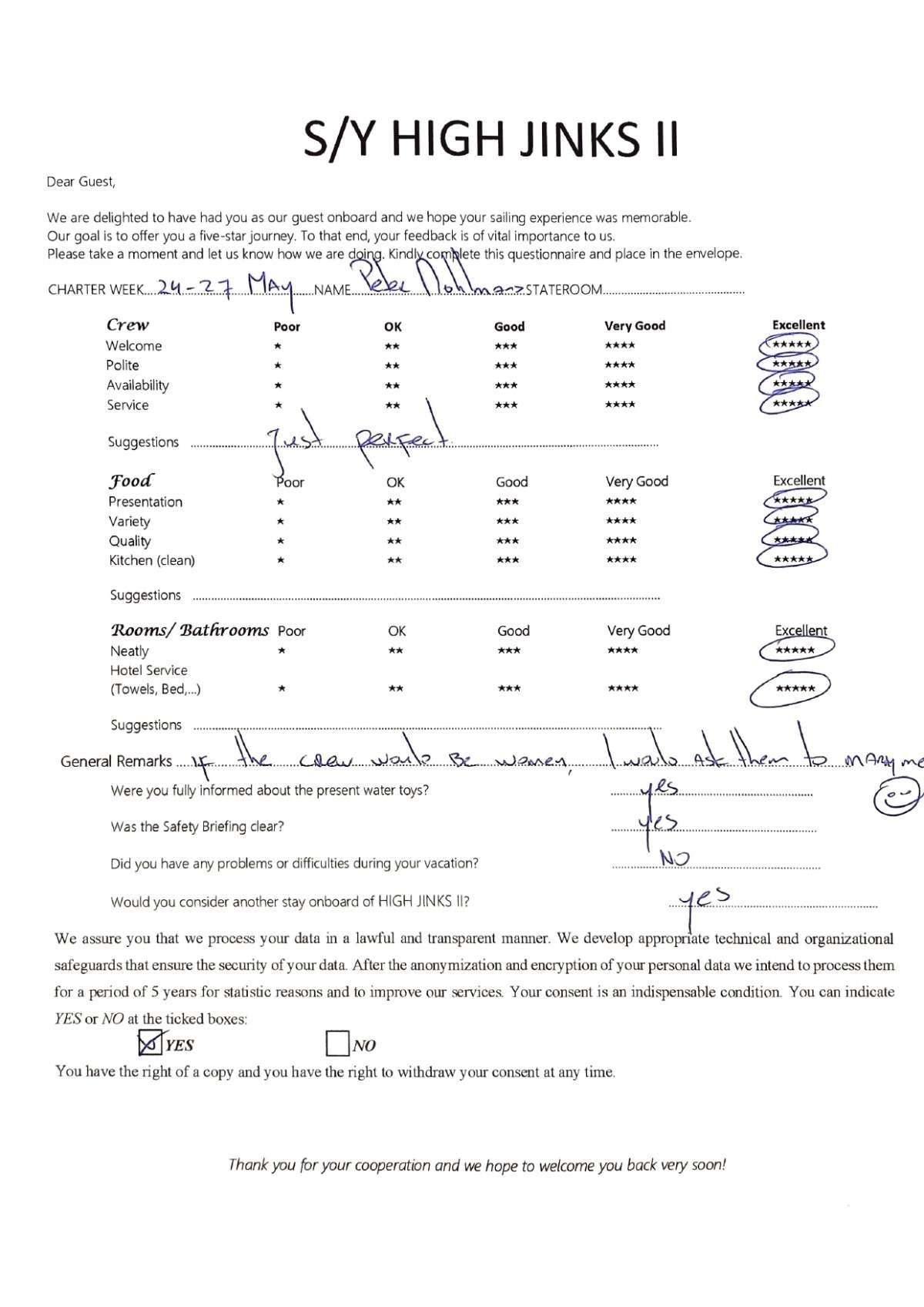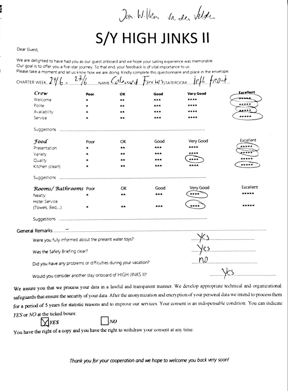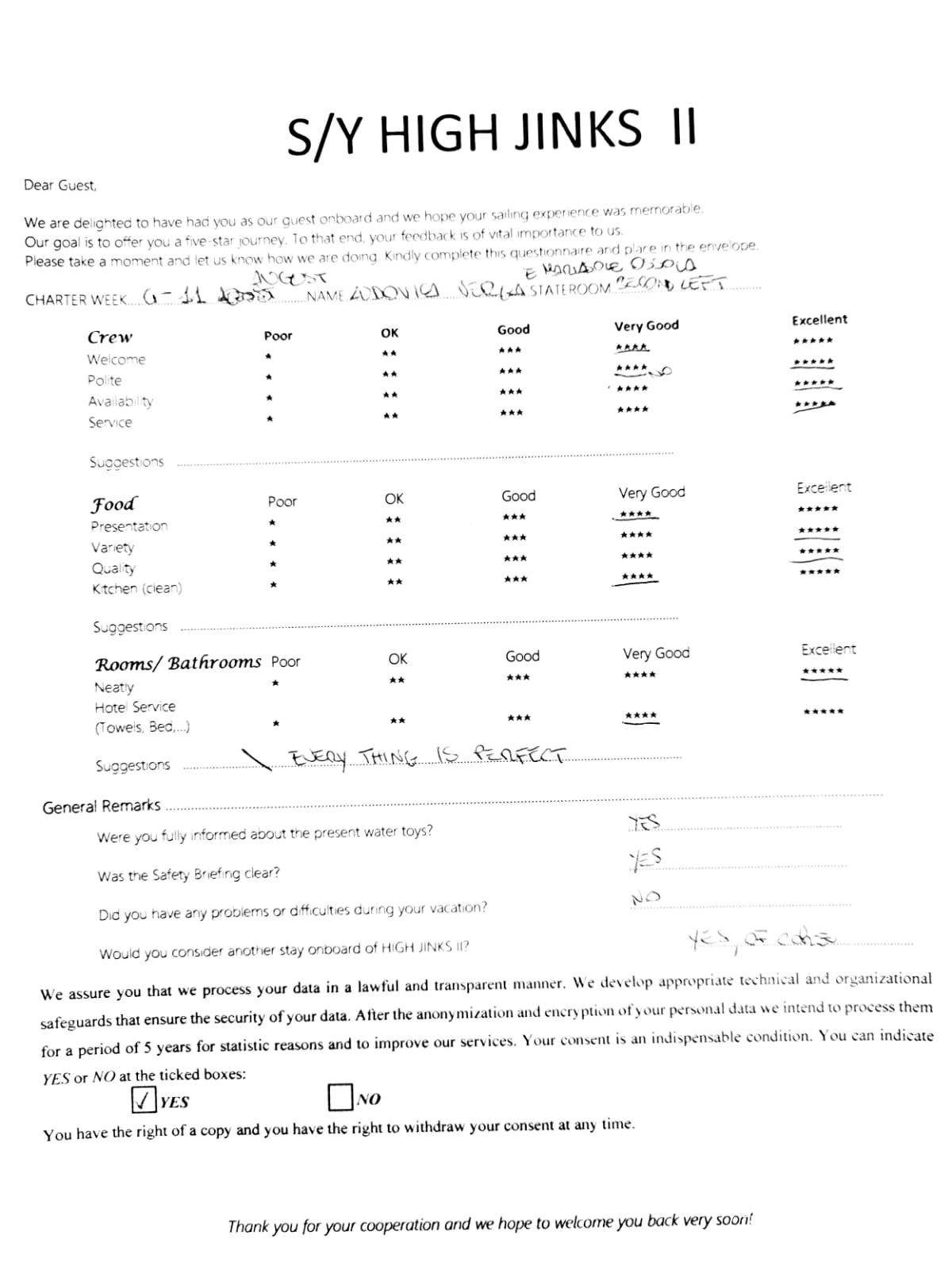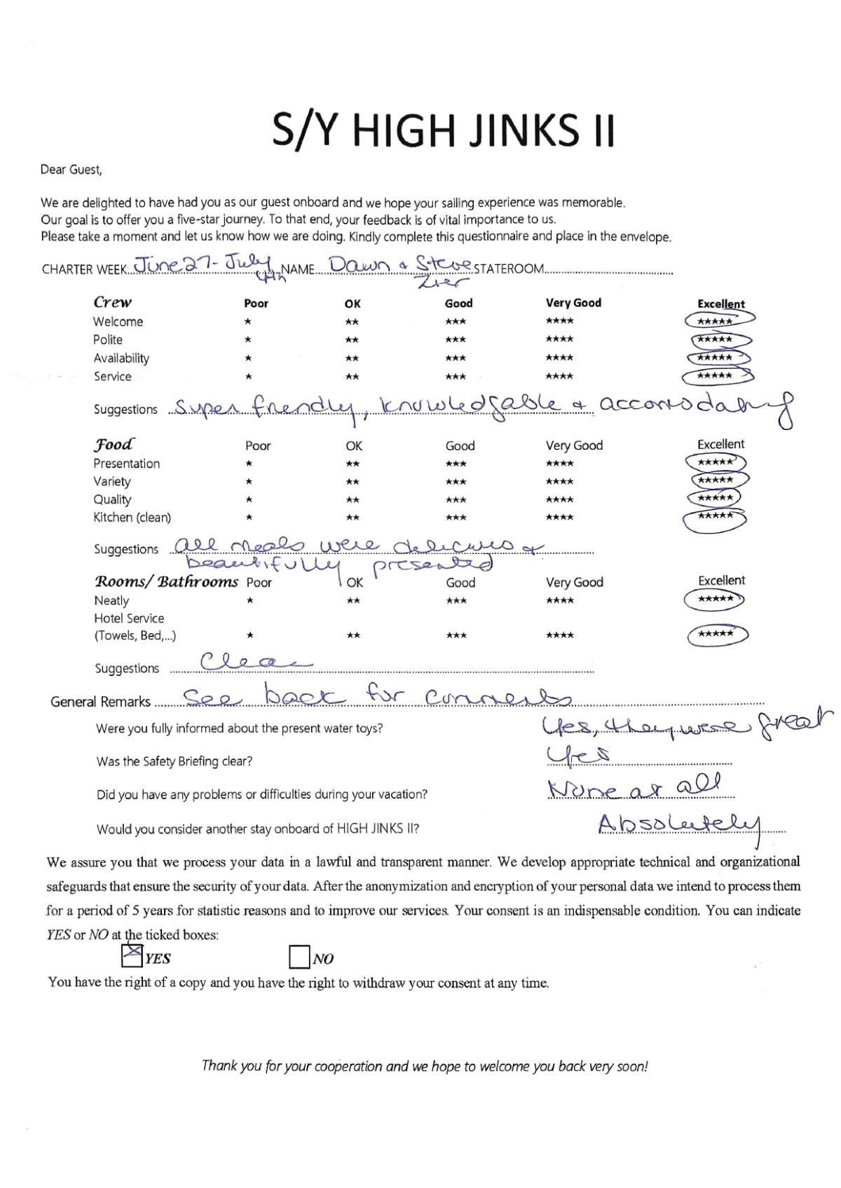 The crew were amazing. Capt Costas did a great job organizing and managing the trip. Very friendly and personable, working to make sure everything was just right. Chef Spiros was spectacular. From helping my son fishing to preparing meals that had the kids drooling. Crew Marielena worked constantly with those little touches to make everyone perfect.