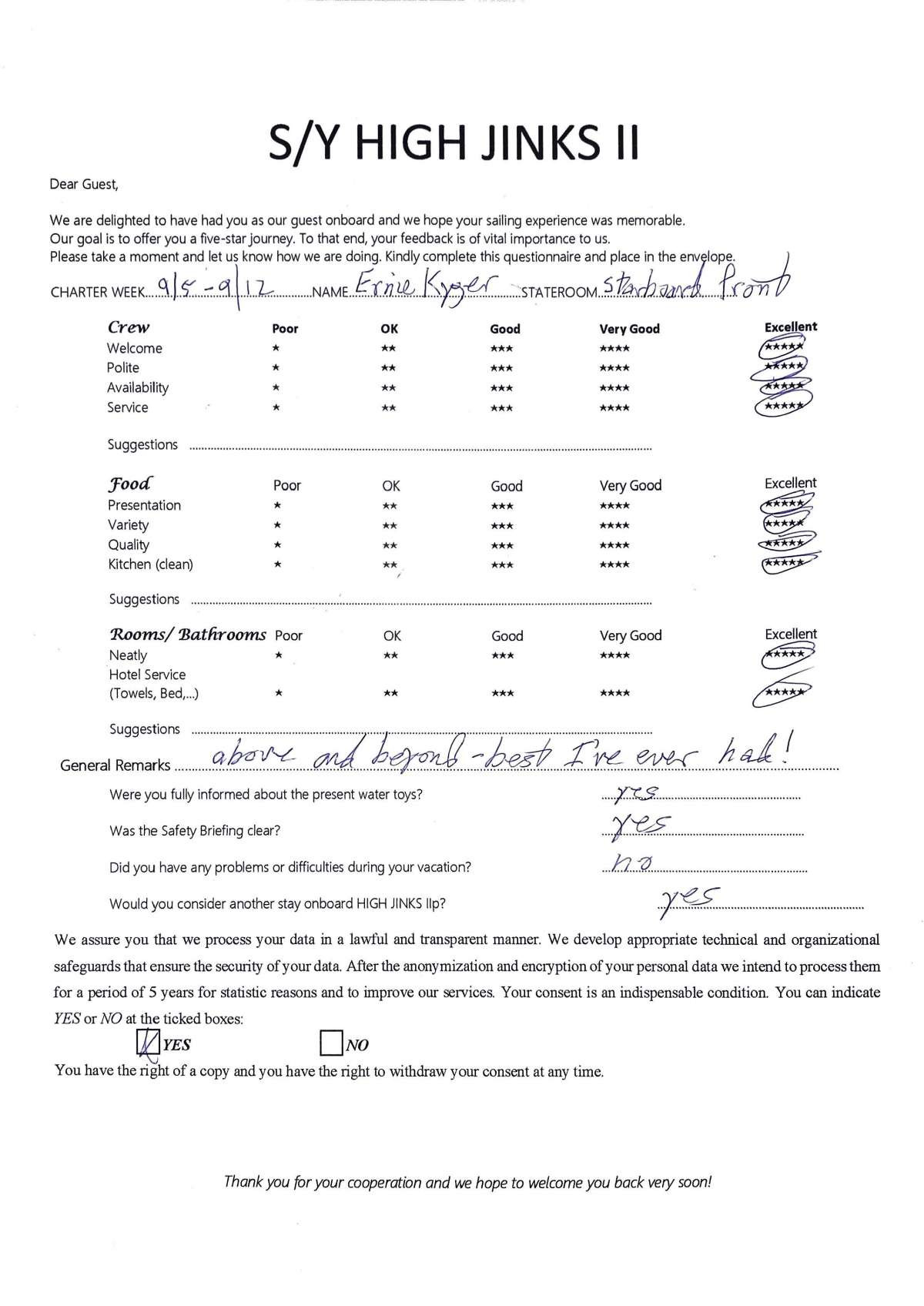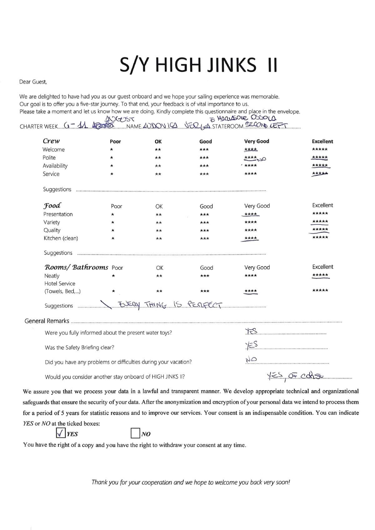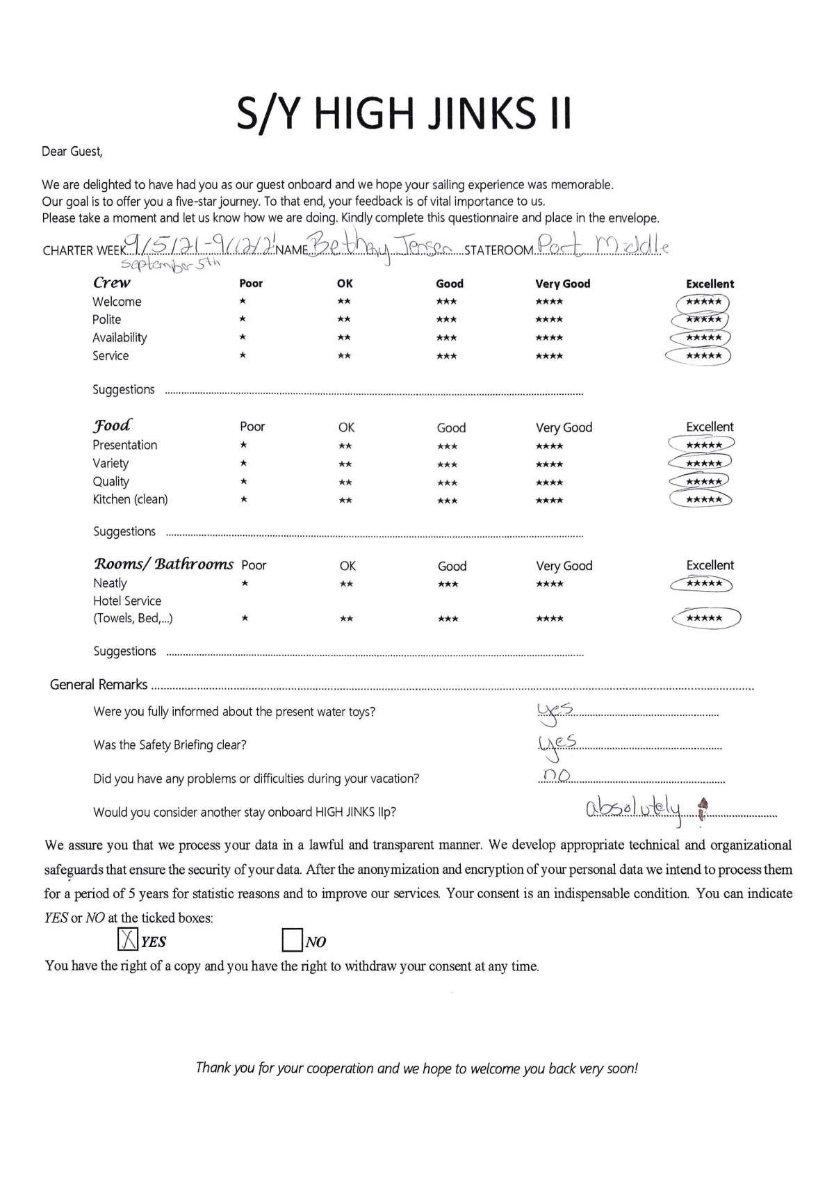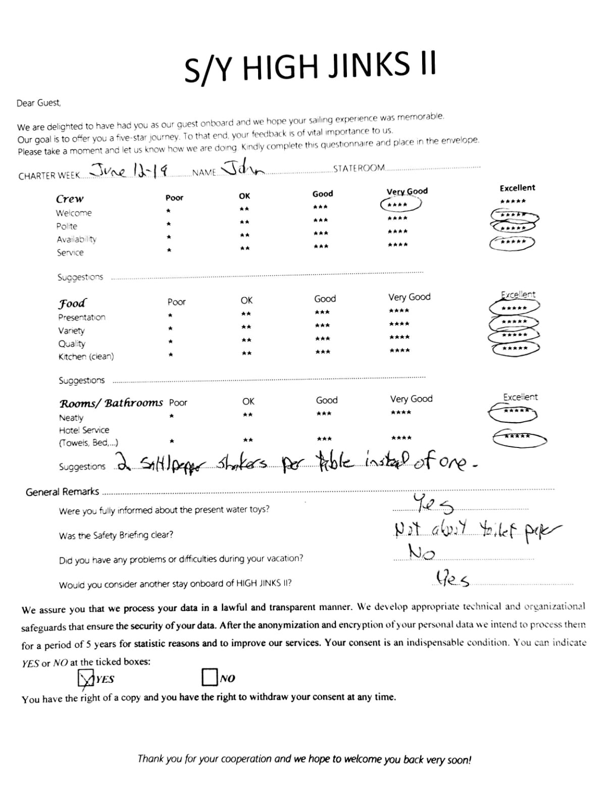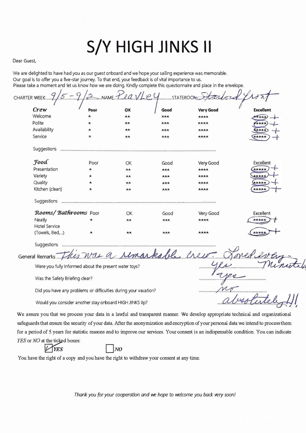 The crew were amazing. Capt Costas did a great job organizing and managing the trip. Very friendly and personable, working to make sure everything was just right. Chef Spiros was spectacular. From helping my son fishing to preparing meals that had the kids drooling. Crew Marielena worked constantly with those little touches to make everyone perfect.