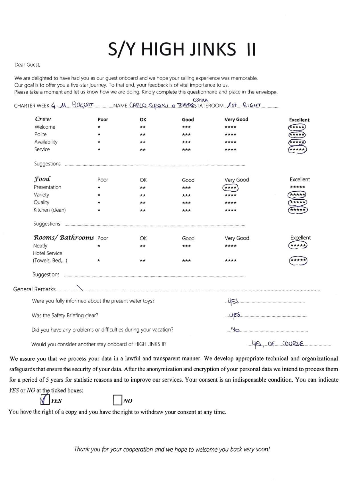 Introducing Spyros, the esteemed chef aboard High Five! Armed with a Cook certification obtained in 2022 and enriched by seminars focusing on Mediterranean cuisine in 2019, Spyros boasts a culinary journey spanning back to 2001. His recent job assignments include distinguished roles in Santorini's prestigious 5-star establishments and esteemed restaurants, where he refined his craft and acquired a nuanced understanding of Mediterranean flavors. With a dedication to excellence and a flair for gastronomic innovation, Spyros promises a dining experience of unparalleled sophistication aboard High Five. With his kind attitude, his team spirit and adaptability to different guest preferences, he is sure to make any charter experience a total success! Prepare to indulge in a symphony of flavors!