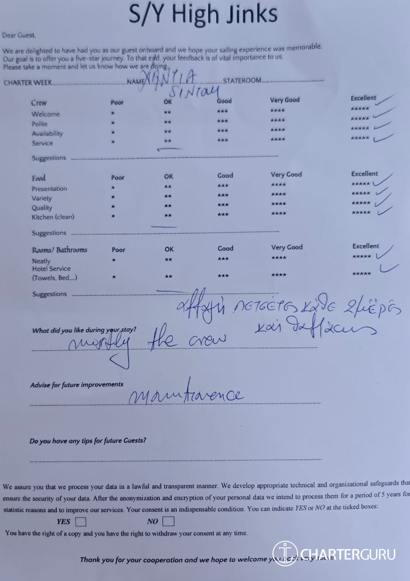 Thank you for the beautiful time on Highjinks! Exceptional crew, we have been looked after as well. Lovely food Maria and thank you for the waterskiing Antonis! Pantelis, you have been a great captain getting us to all the beautiful bays. Highjinks is a beautiful boat I enjoyed every minute!