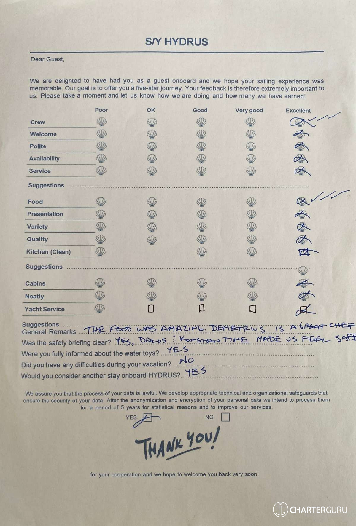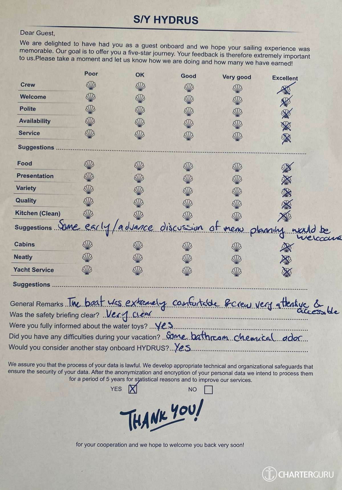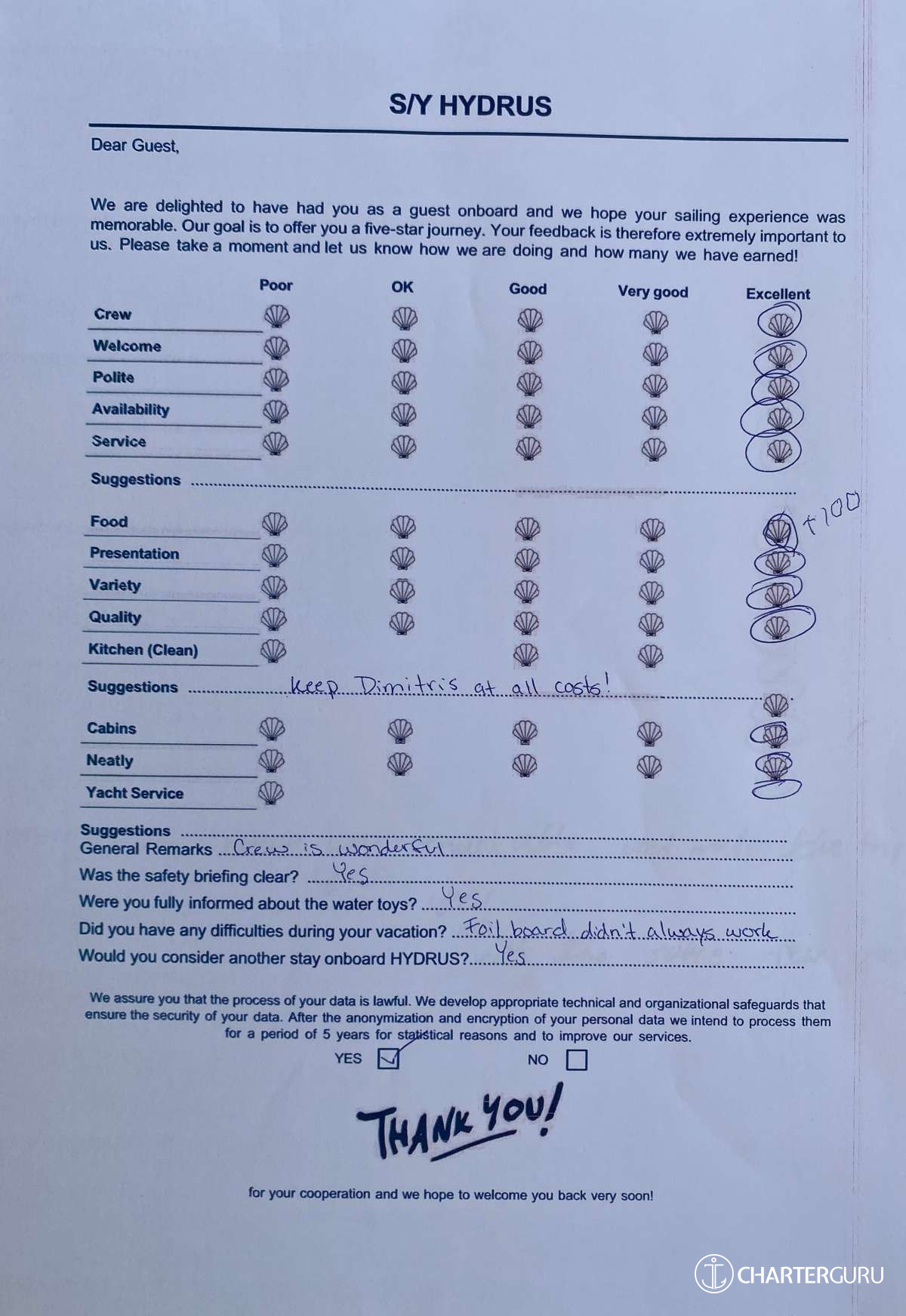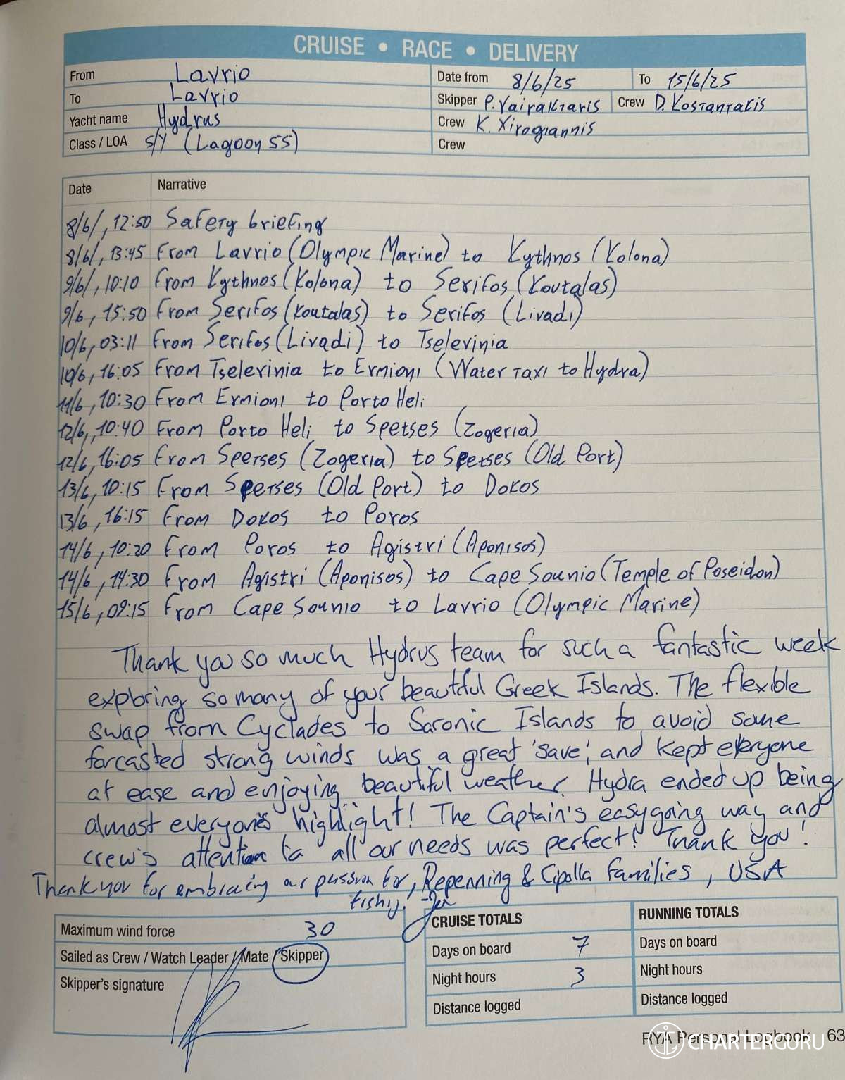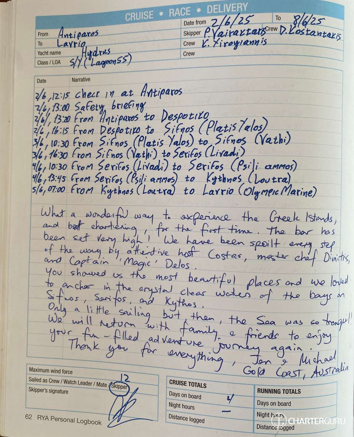 For a sailing catamaran like HYDRUS, the expected APA is 20% to 35% of the charter price (€4,400 - €7,700), making the charter cost €26,400 to €29,700. Exact amount will be confirmed after inquiry.