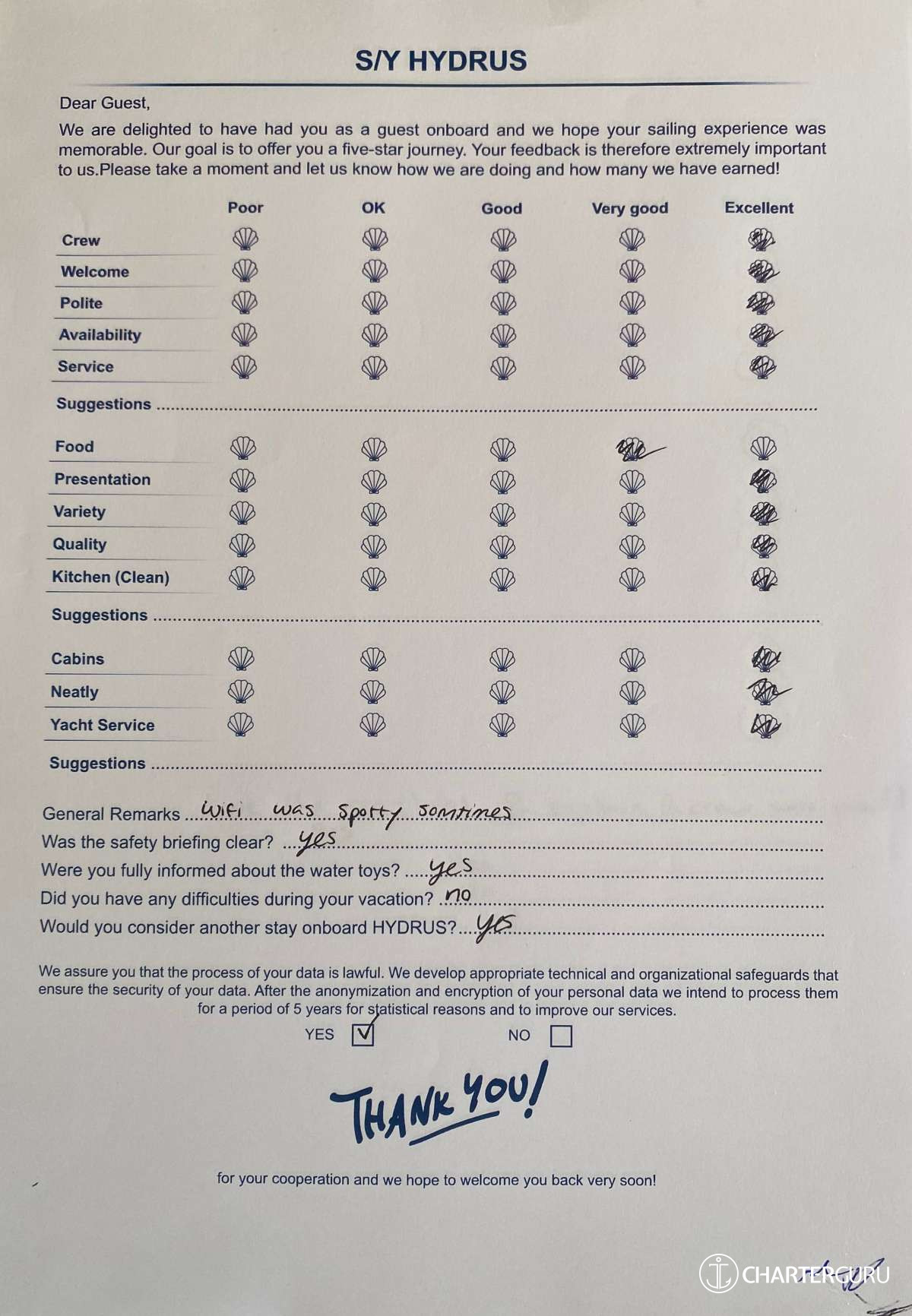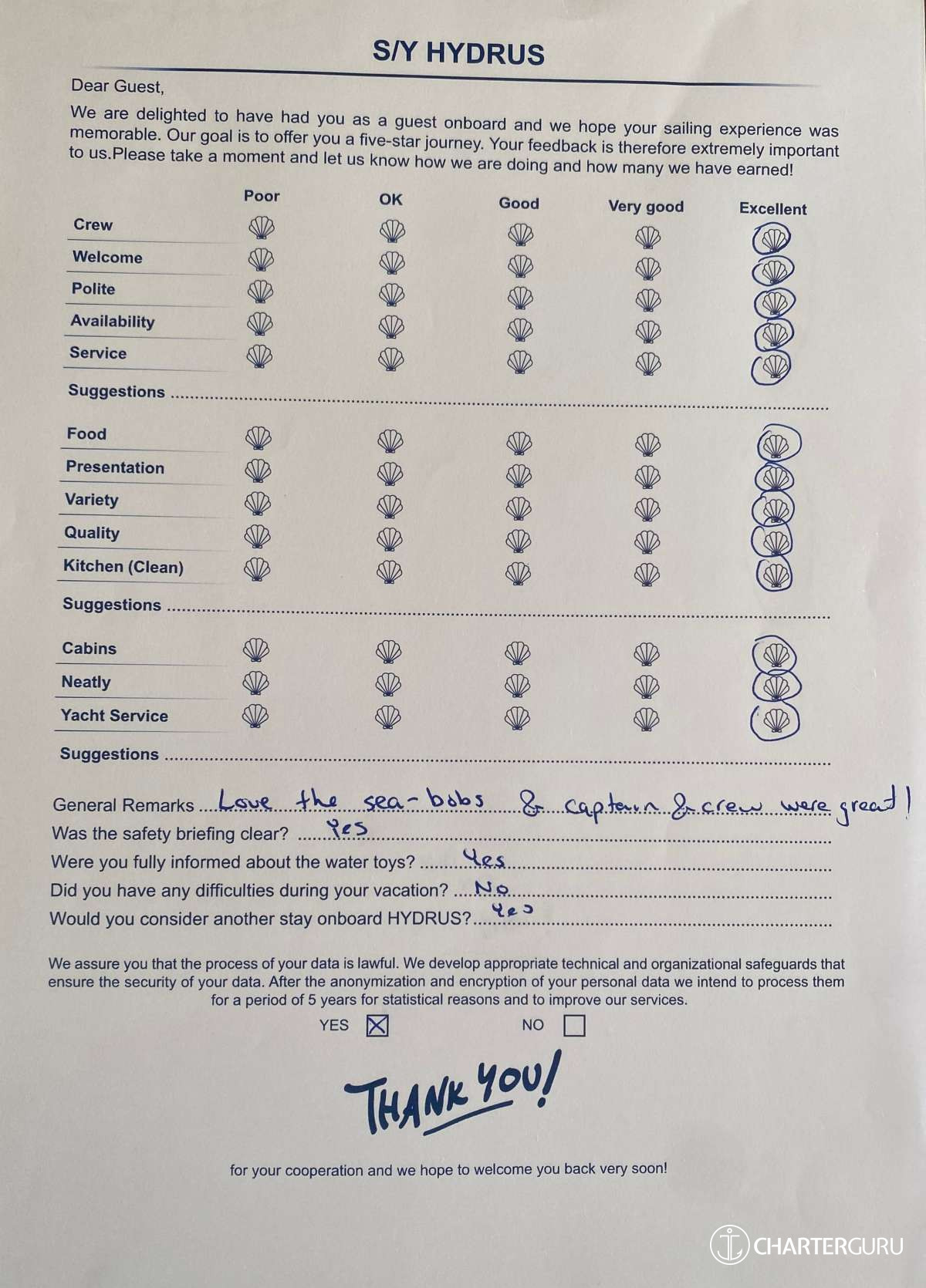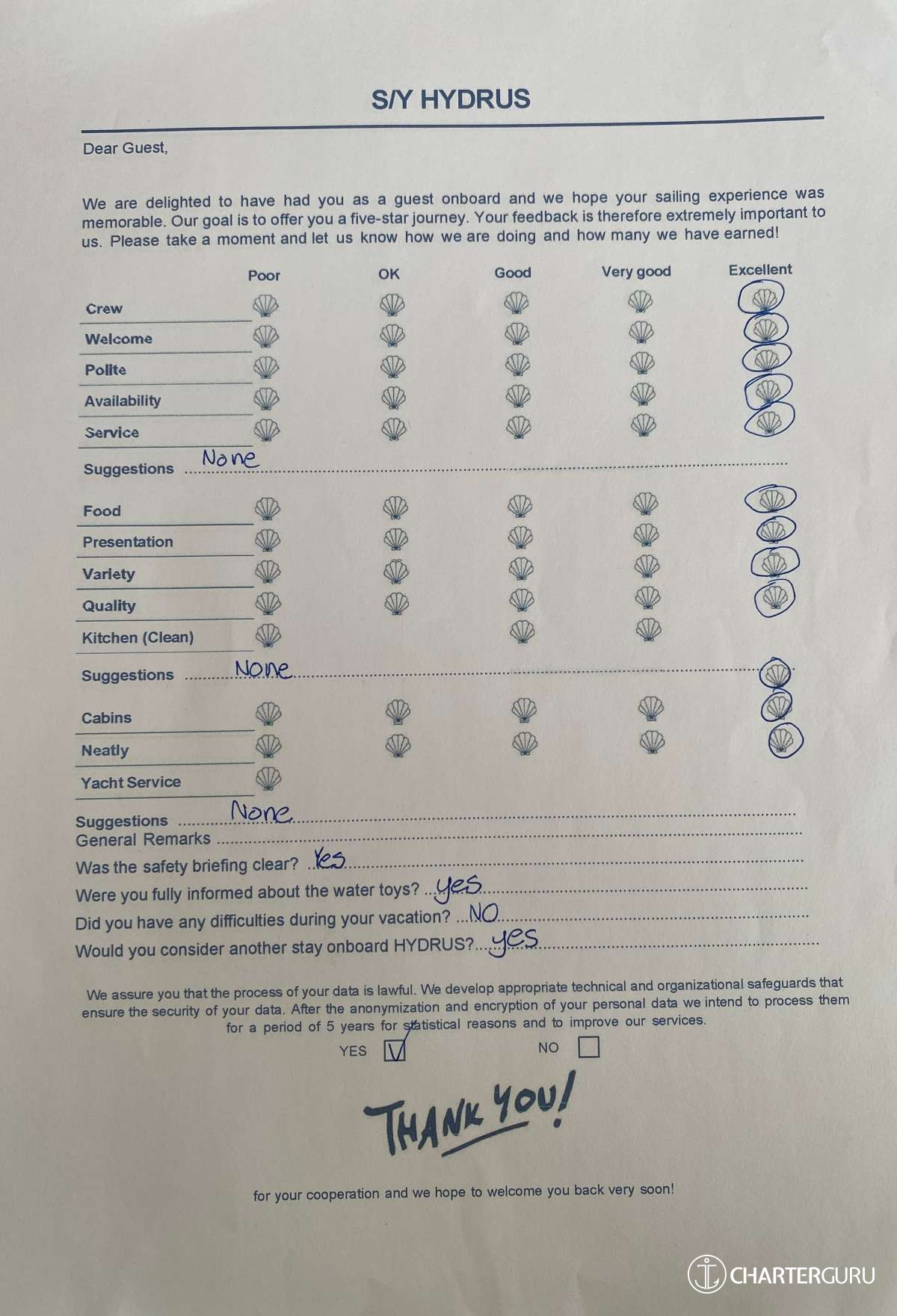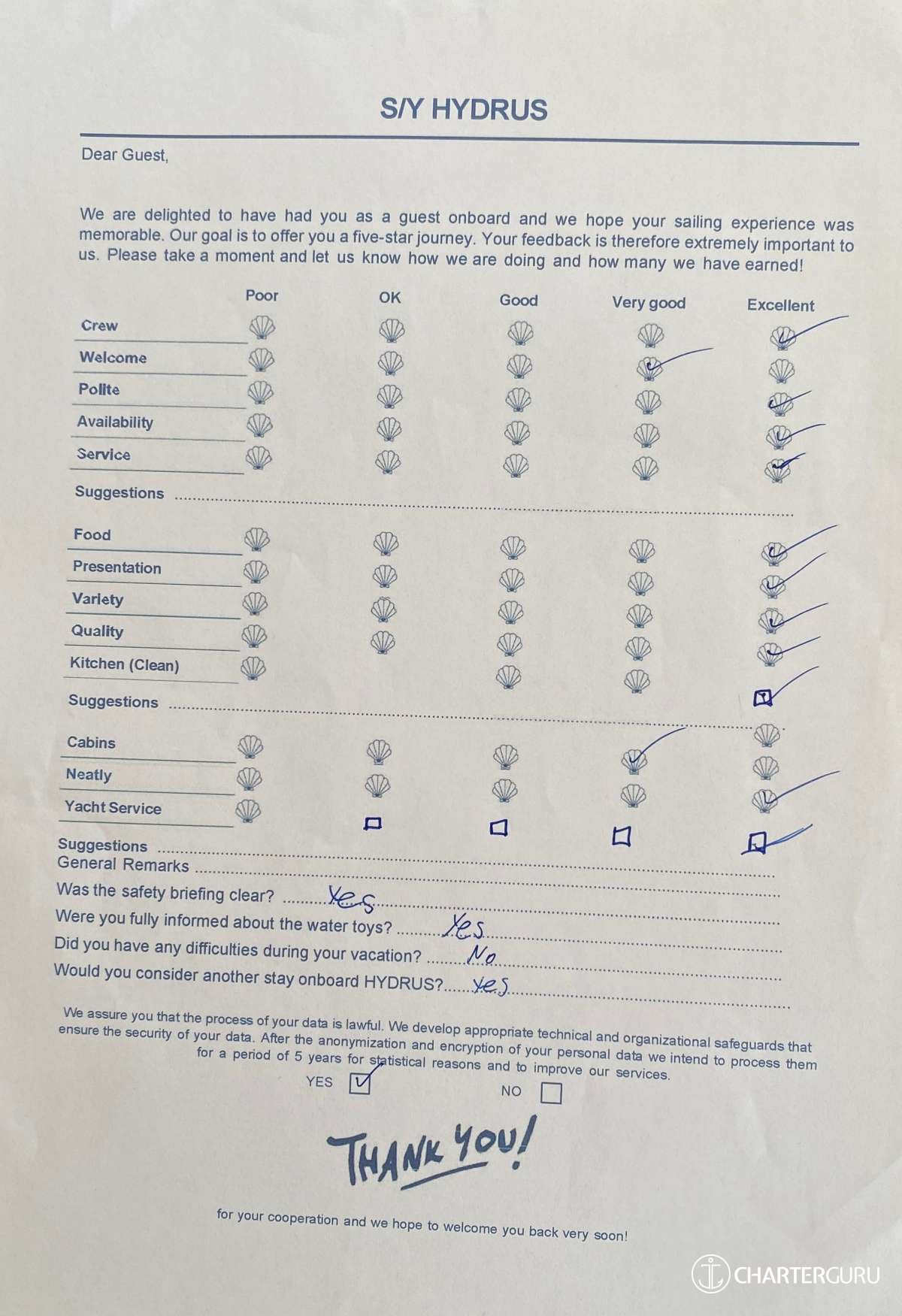 For a sailing catamaran like HYDRUS, the expected APA is 20% to 35% of the charter price (€4,400 - €7,700), making the charter cost €26,400 to €29,700. Exact amount will be confirmed after inquiry.