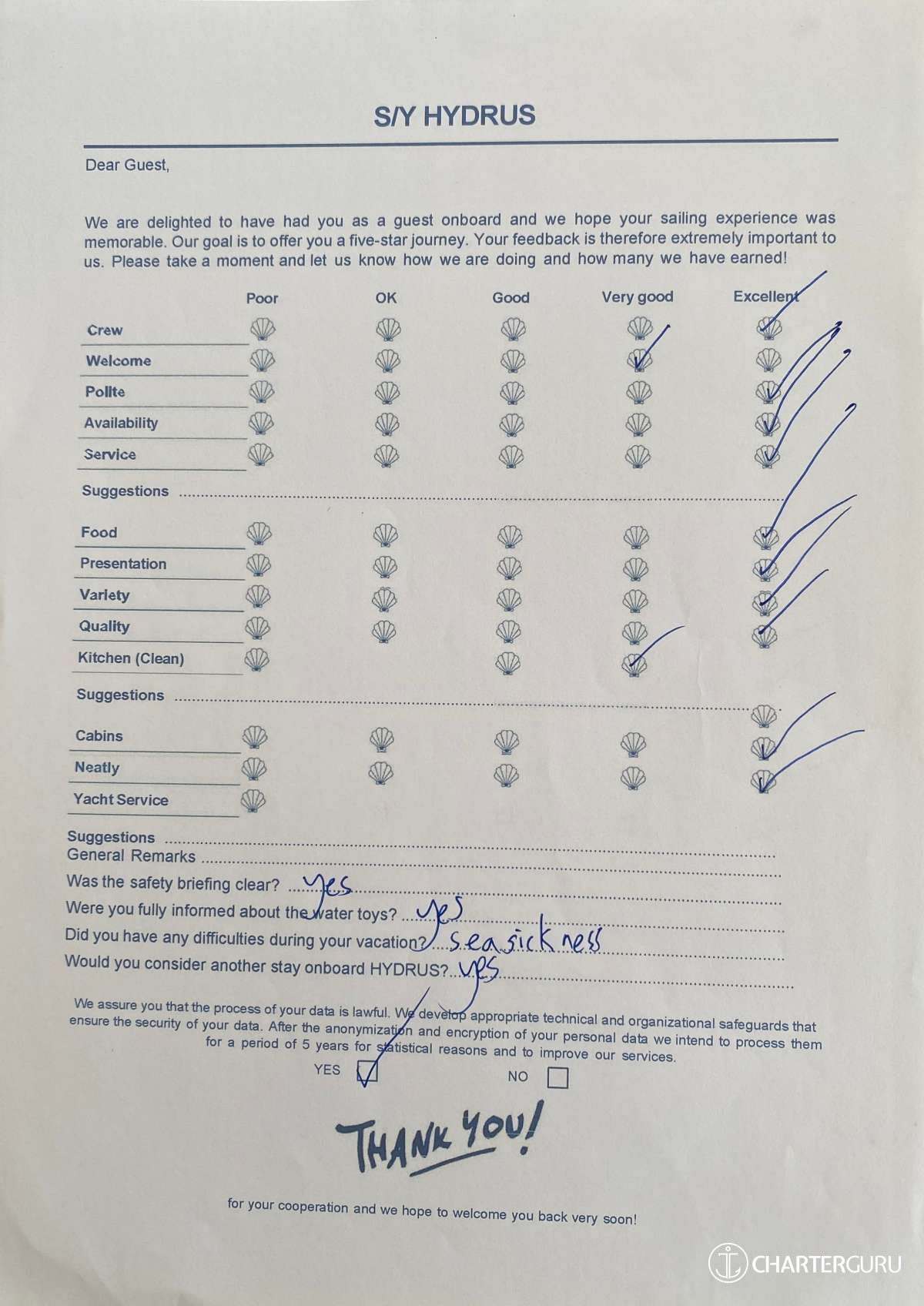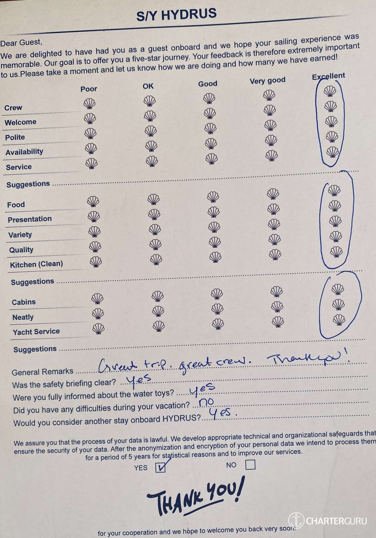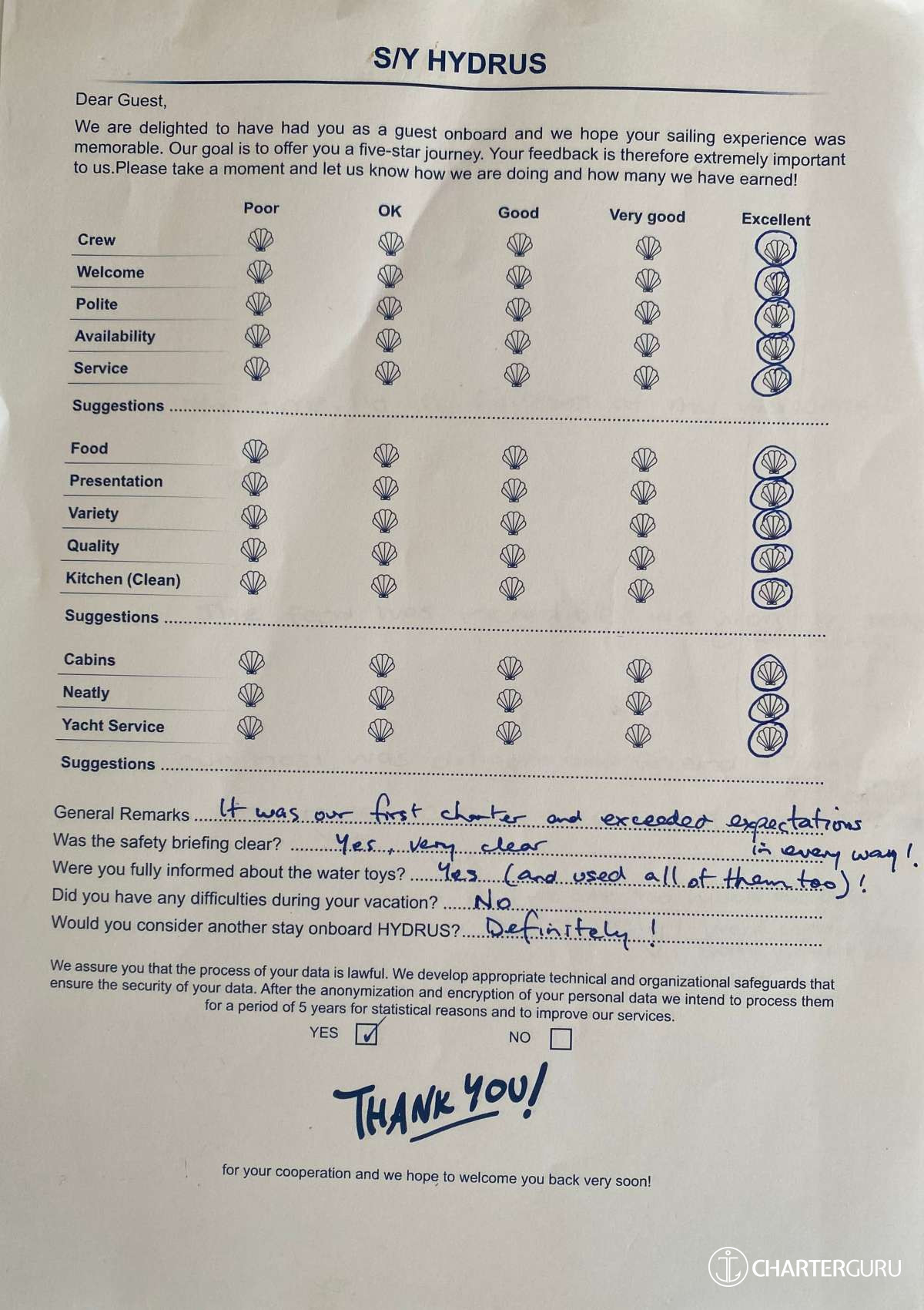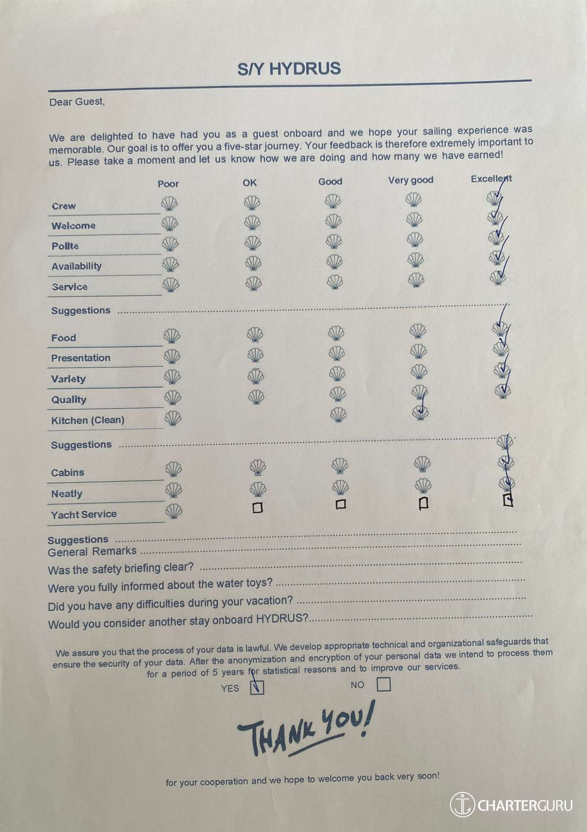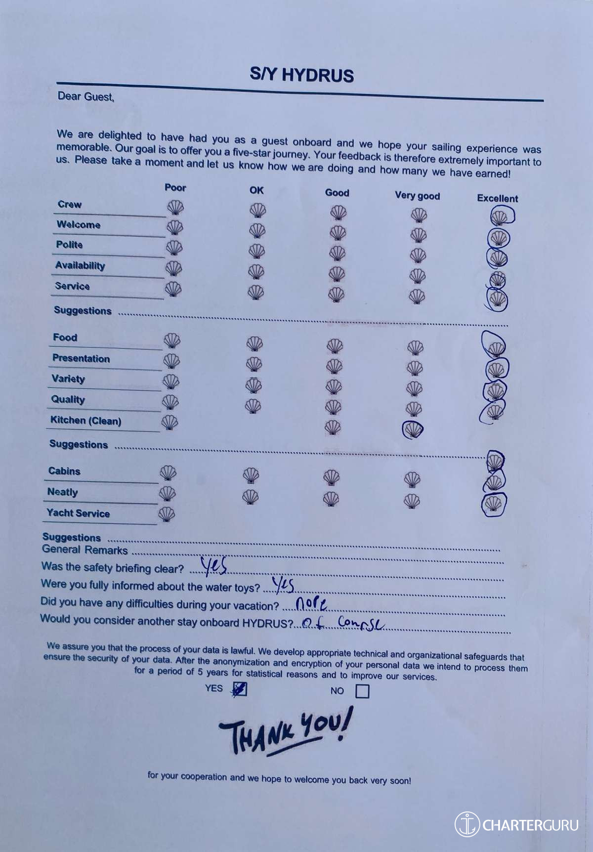 For a sailing catamaran like HYDRUS, the expected APA is 20% to 35% of the charter price (€4,400 - €7,700), making the charter cost €26,400 to €29,700. Exact amount will be confirmed after inquiry.