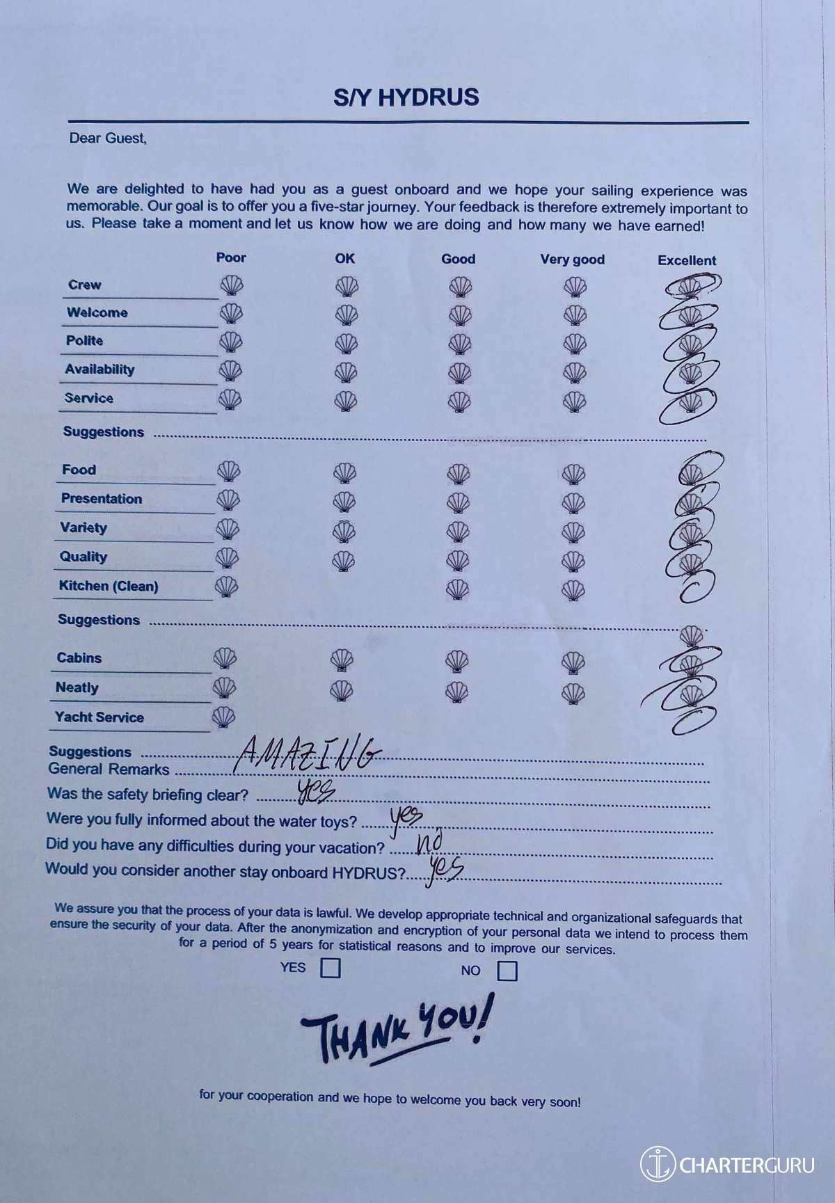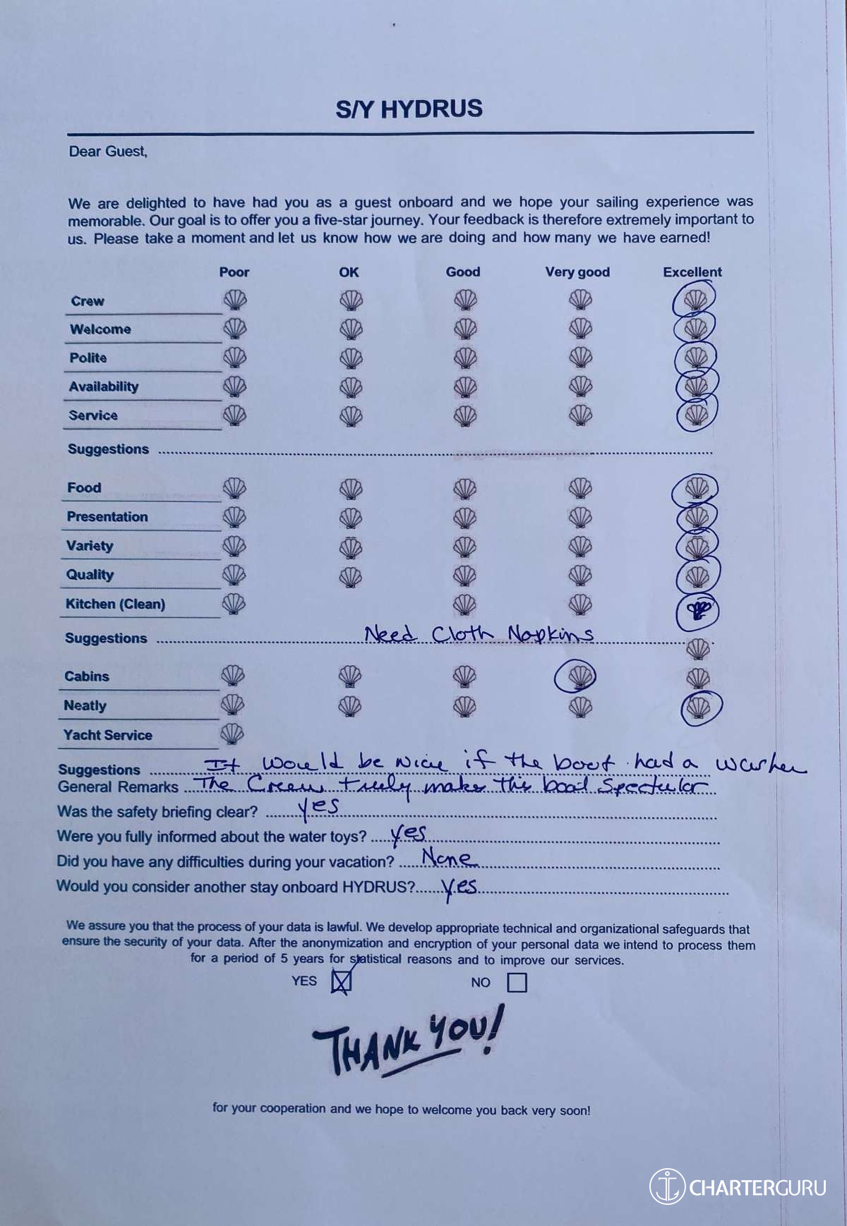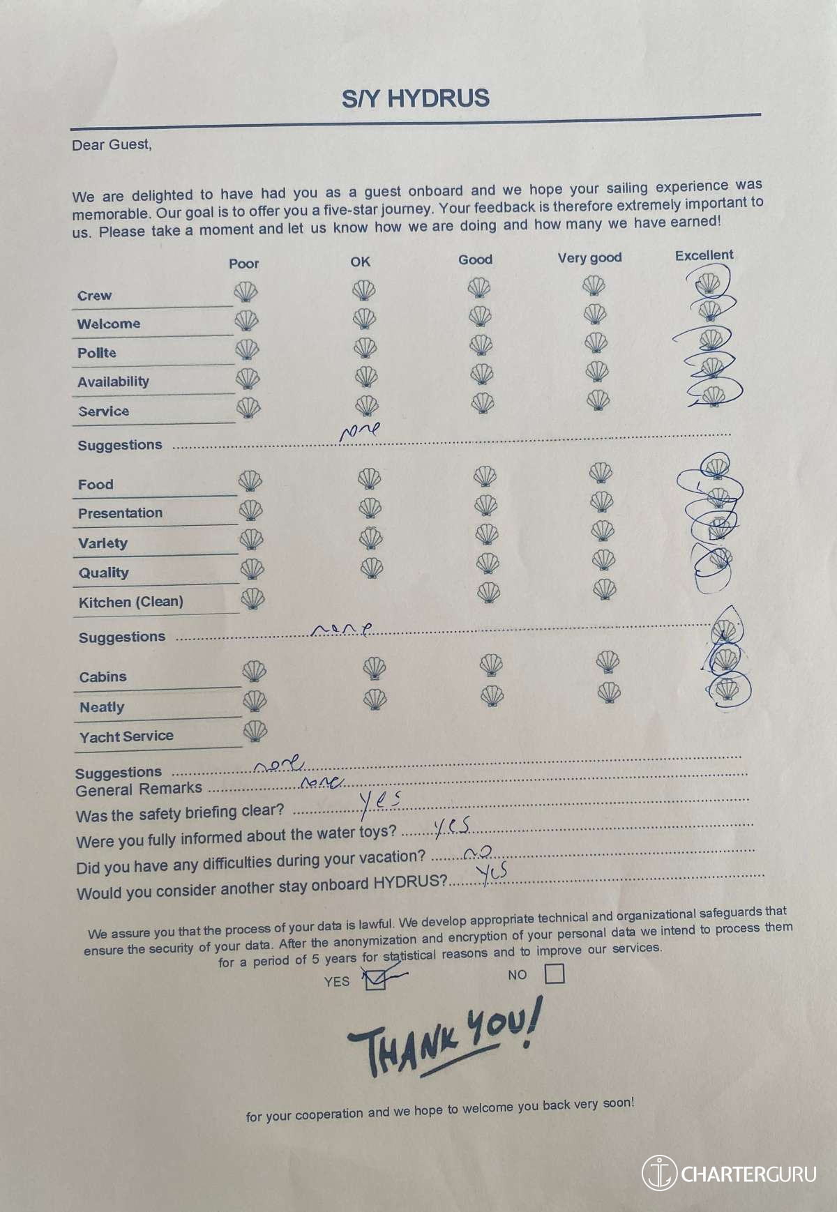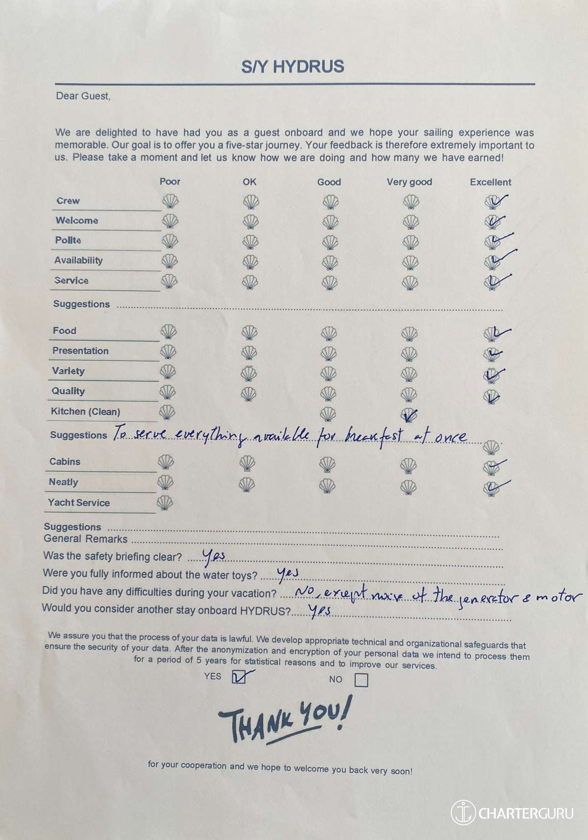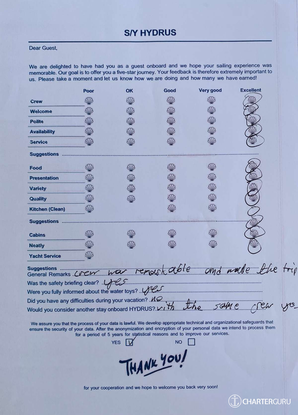 For a sailing catamaran like HYDRUS, the expected APA is 20% to 35% of the charter price (€4,400 - €7,700), making the charter cost €26,400 to €29,700. Exact amount will be confirmed after inquiry.