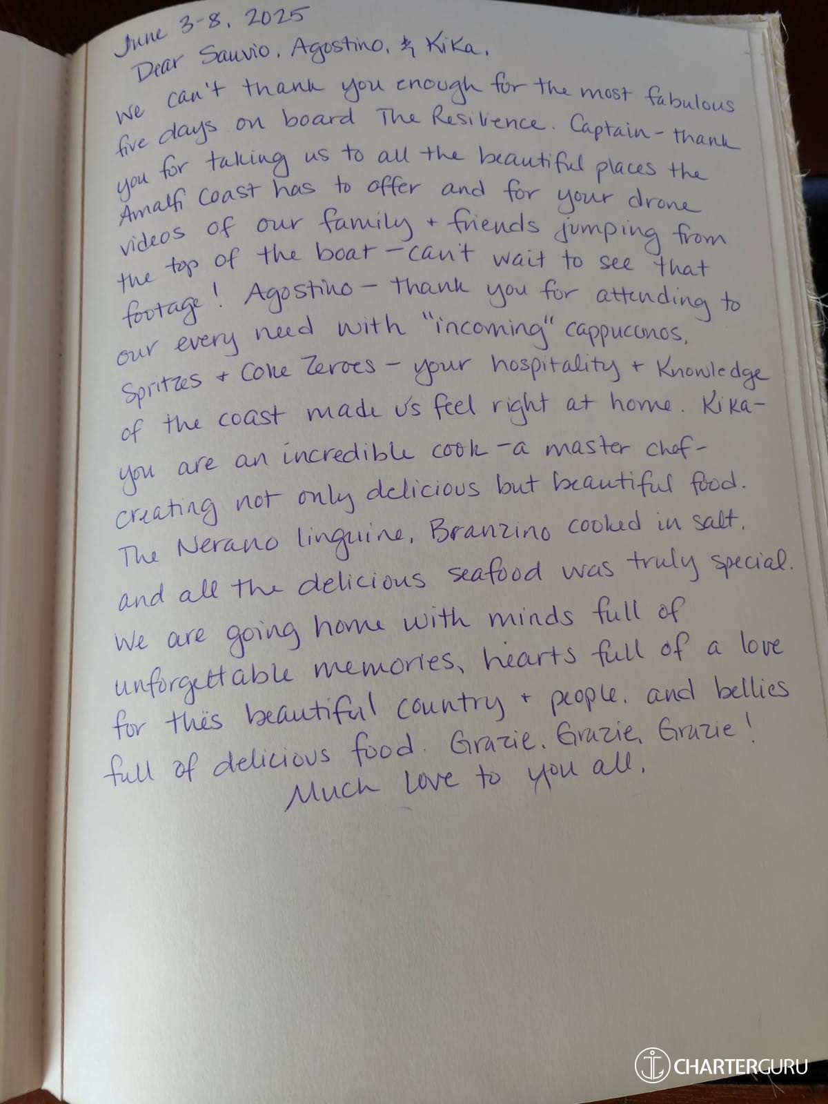 We can’t thank you enough for the most fabulous 5 days aboard Resilience. Captain thank you for taking us to all the beautiful places of Amalfi Cost and for your drone videos! Agostino thank you for attending to our every need with incoming cappucinos, Kika you are an incredible master chef: nerano linguine and branzino were truly special!! We come back home full of unforgettable memories… Grazie, Grazie, Grazie Much love to you all!