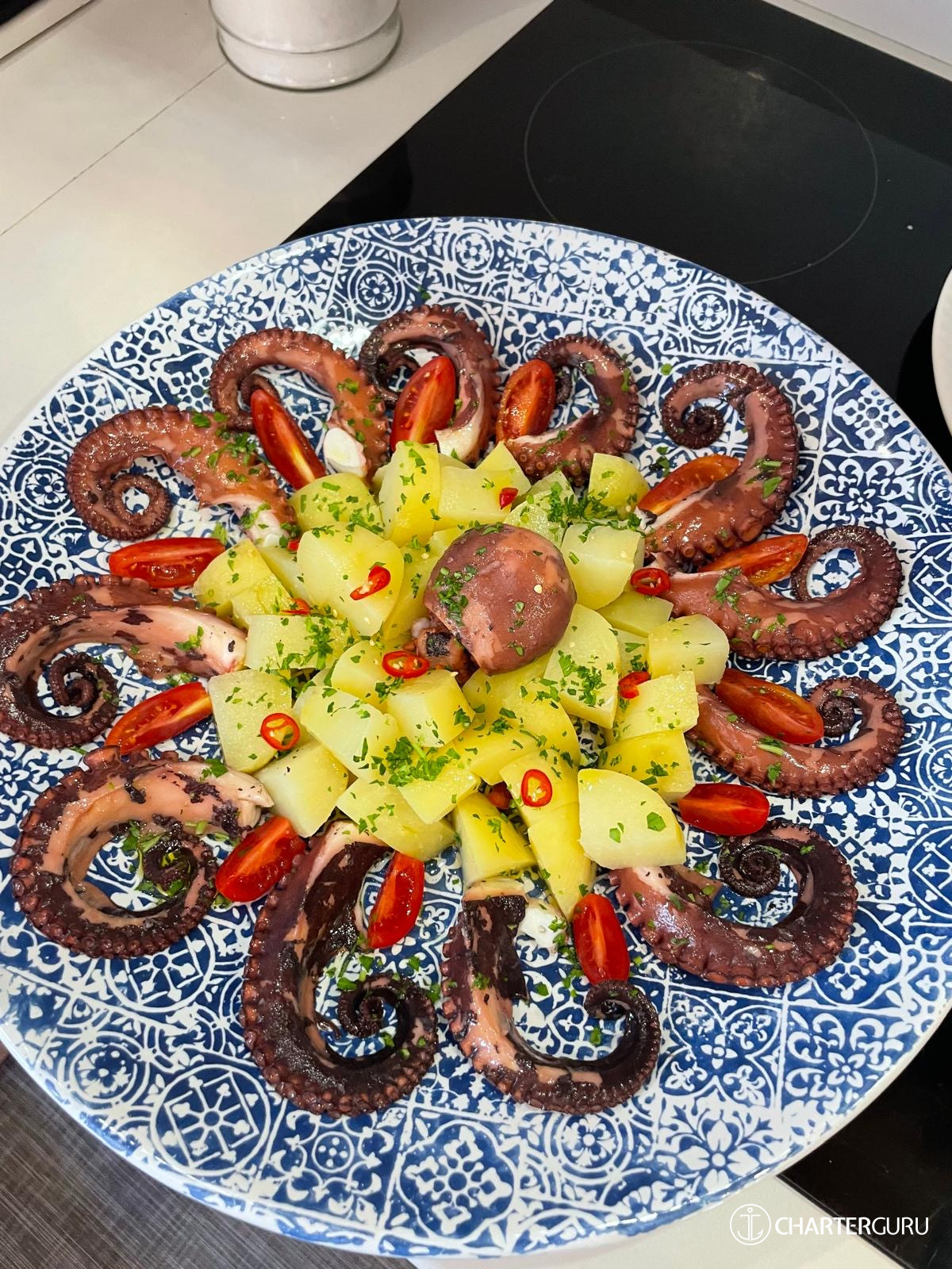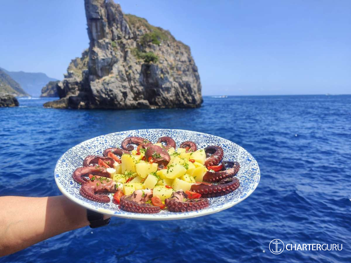 Octopus and potatoes with Salinas cucungi and capers with citrus zest