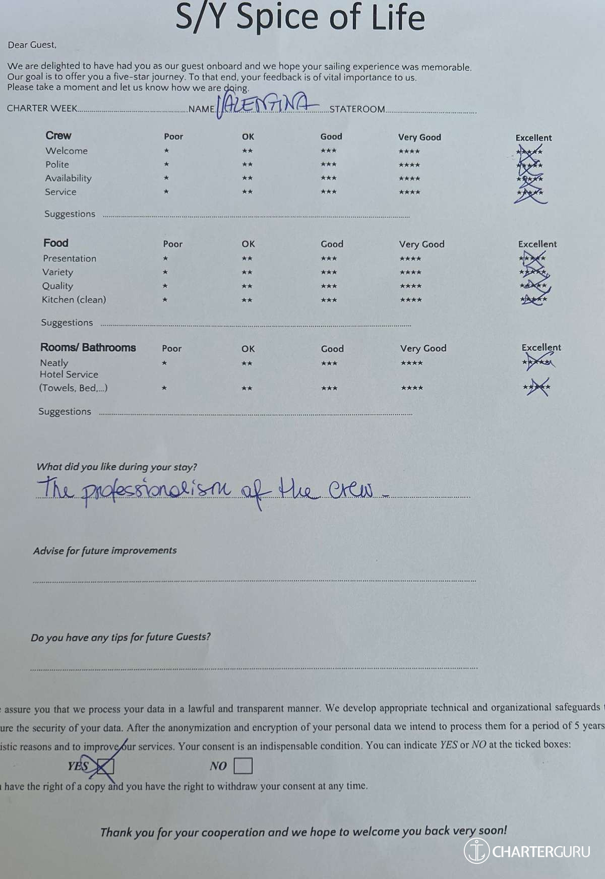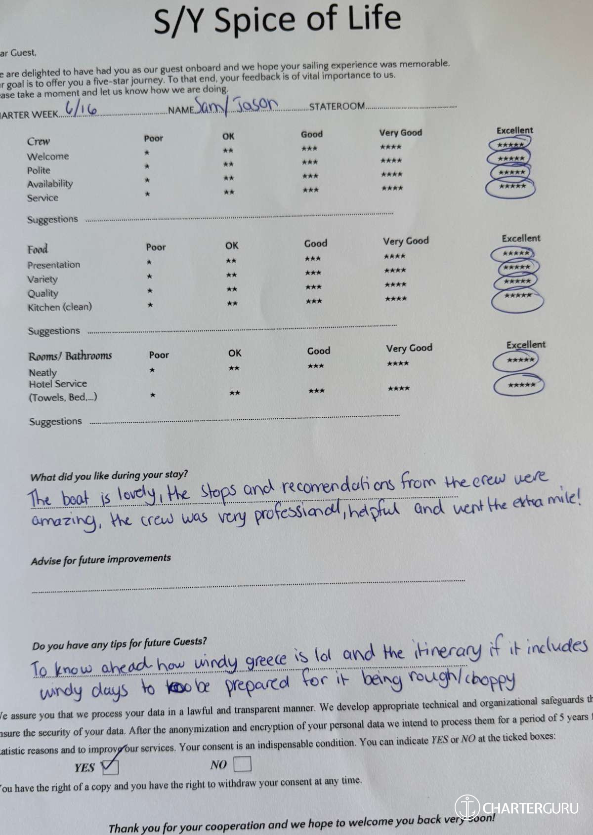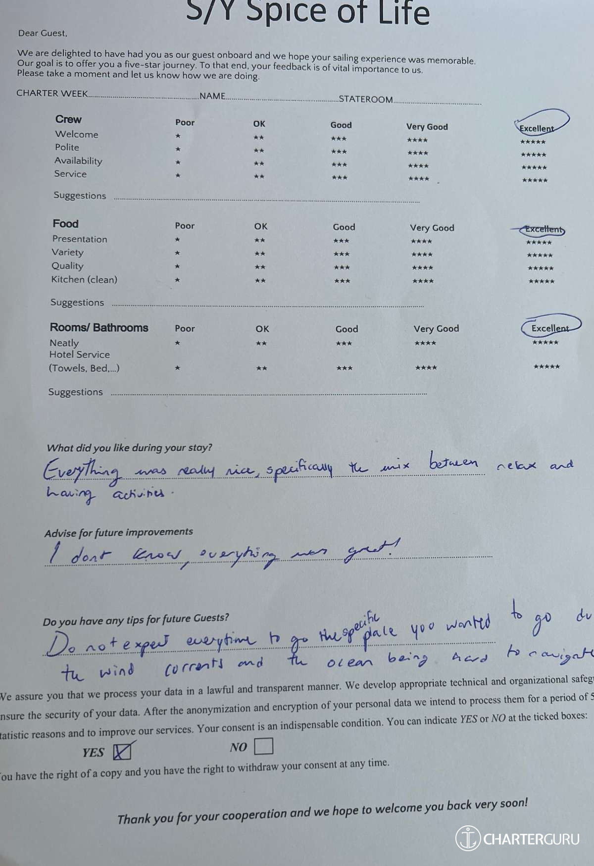 All additional/variable expenses such as Gas and Food are deducted from an Advance Provisioning Allowance (APA) - an additional deposit that is added on top of the charter price.