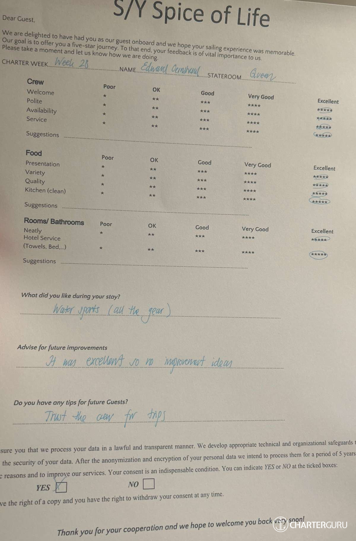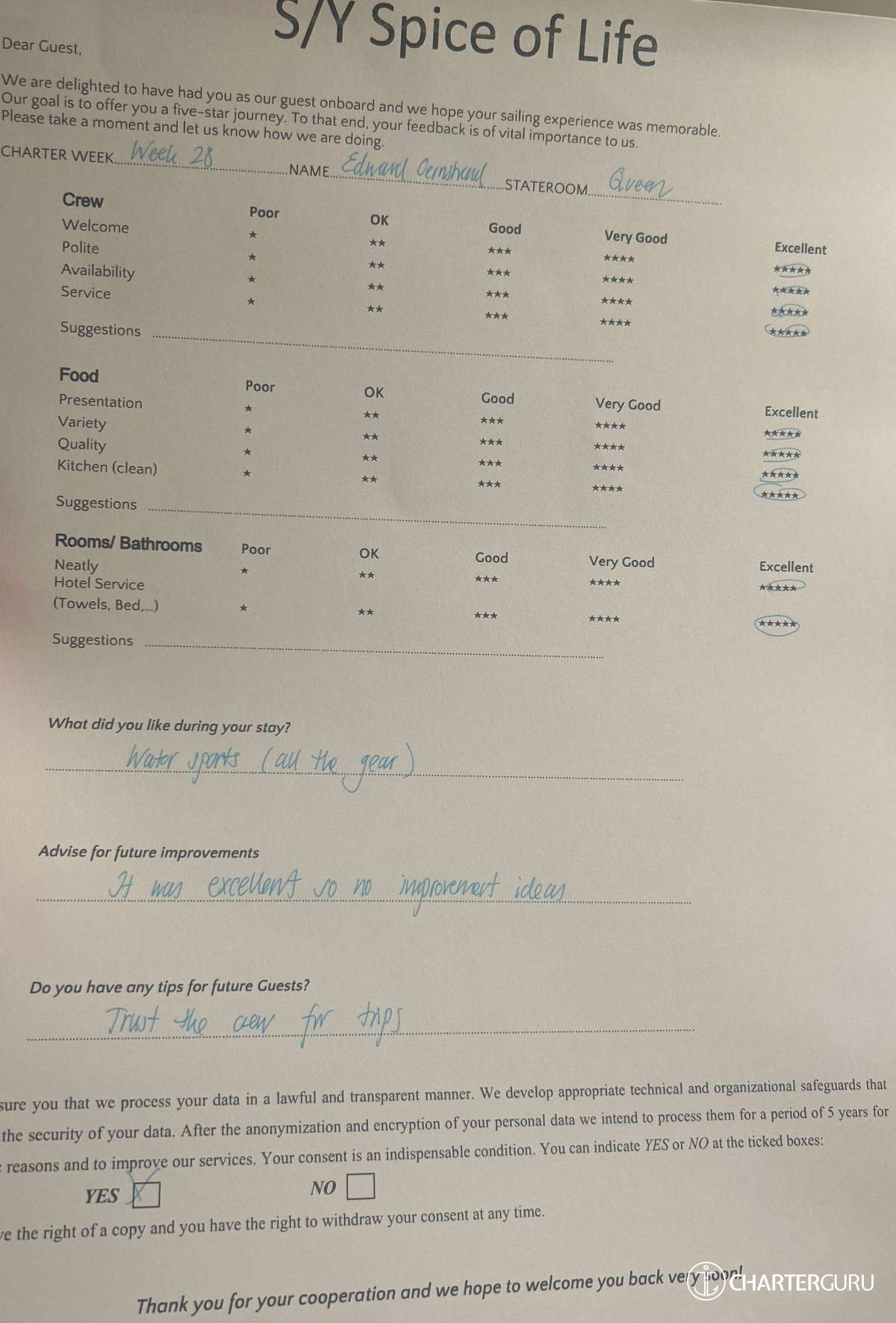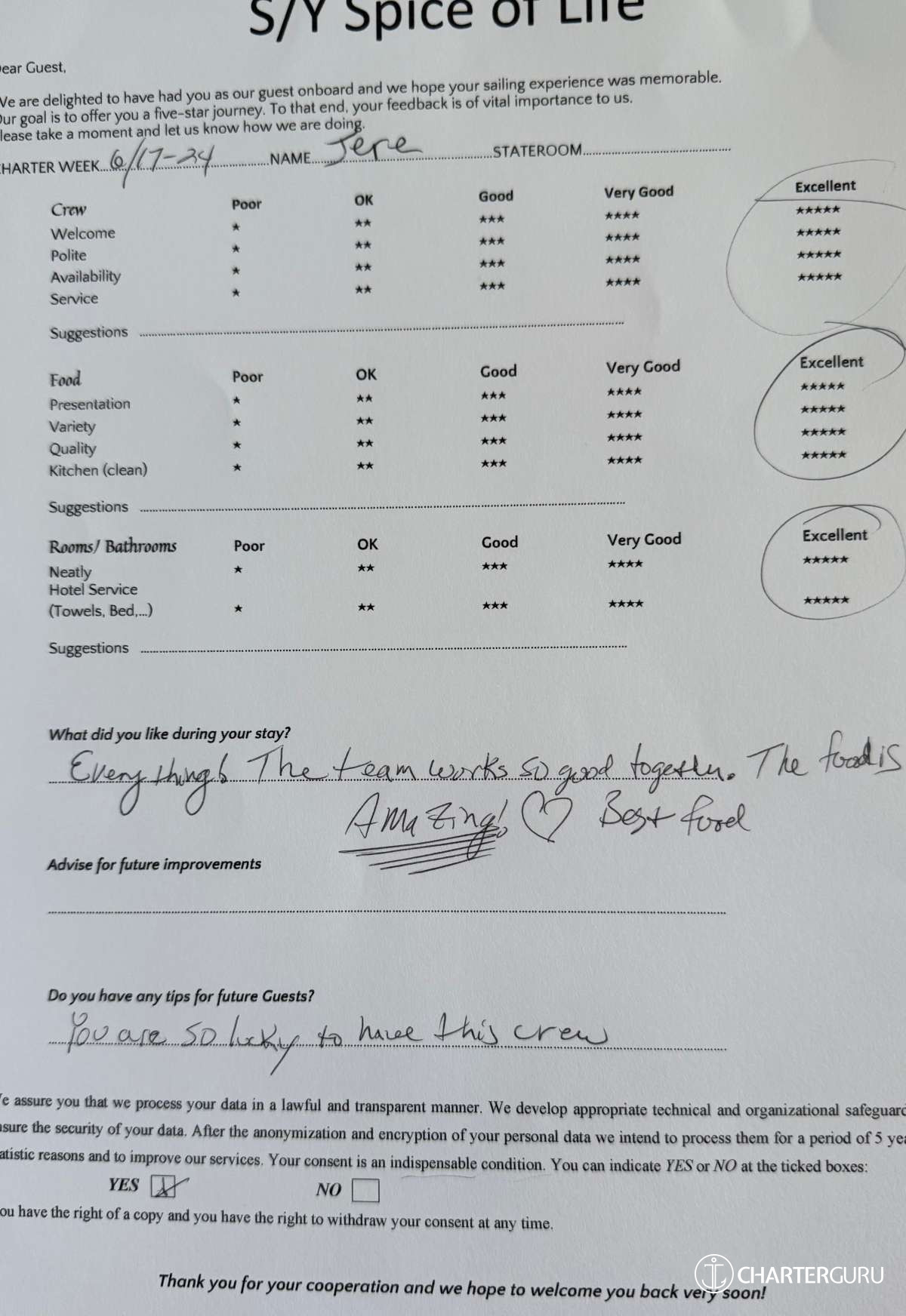 All additional/variable expenses such as Gas and Food are deducted from an Advance Provisioning Allowance (APA) - an additional deposit that is added on top of the charter price.